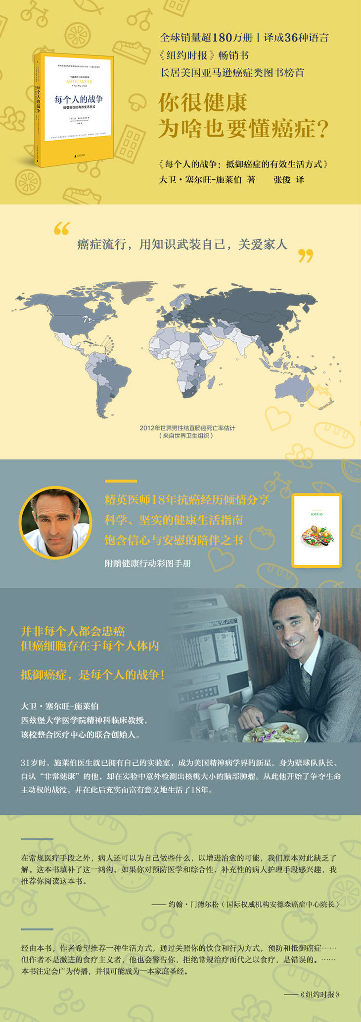 作者大卫·塞尔旺-施莱伯博士既是癌症患者,更是一位有优异科研背景和深厚人文关怀的医生。他是匹兹堡大学医学院精神科临床教授,该校整合医疗中心的联合创始人,拥有医学博士及认知神经科学博士学位。因其在精神病学领域取得的成就,他赢得了2002年宾夕法尼亚州精神病学协会总统奖。