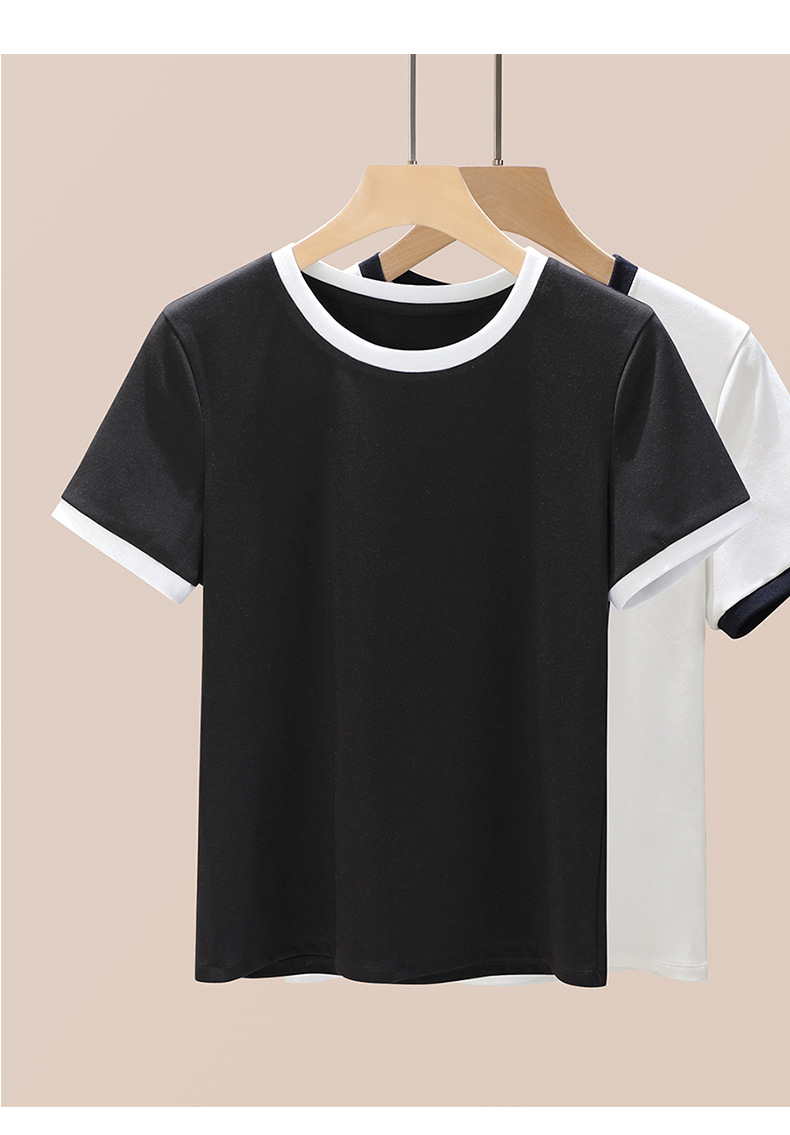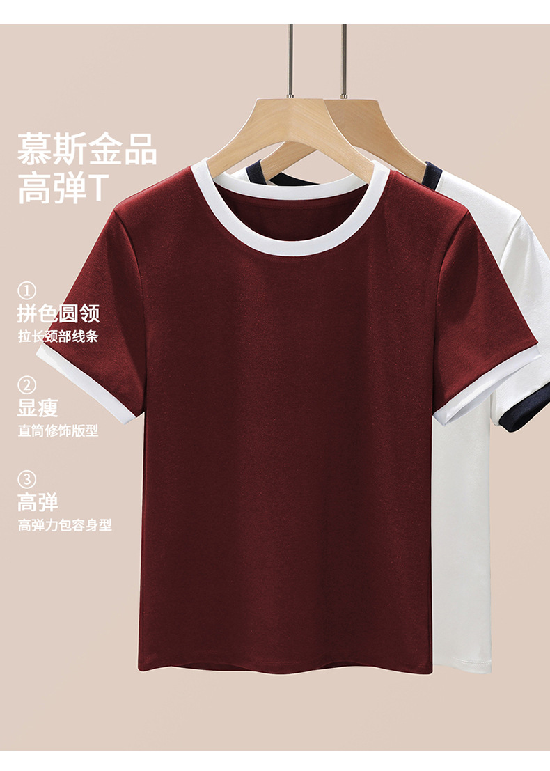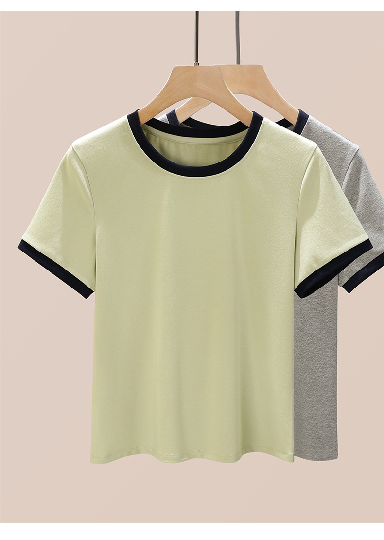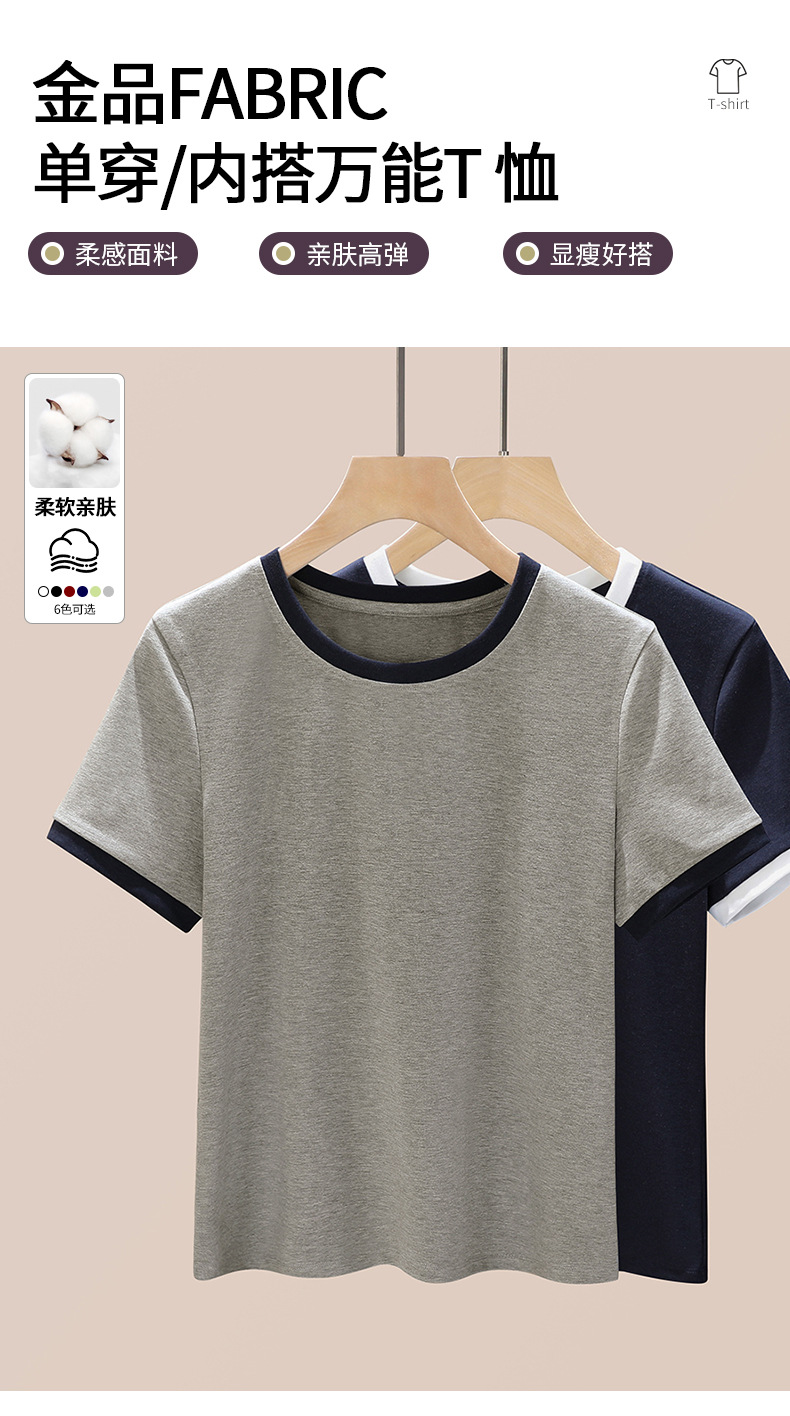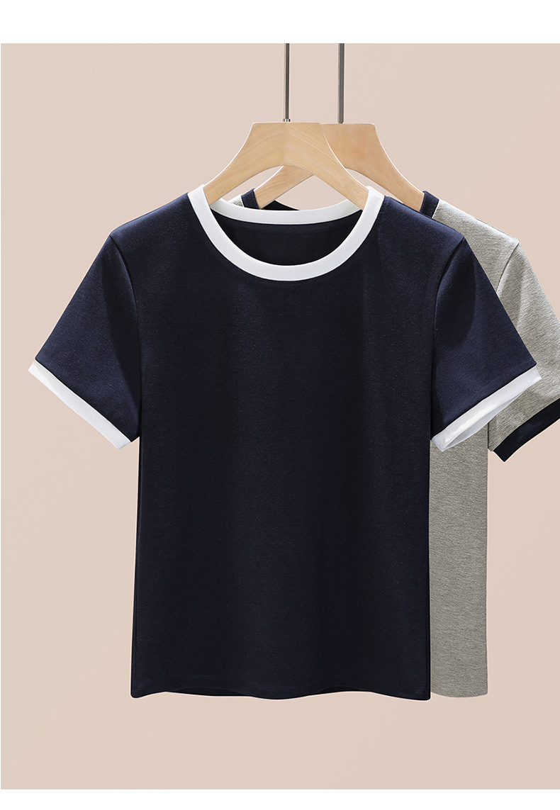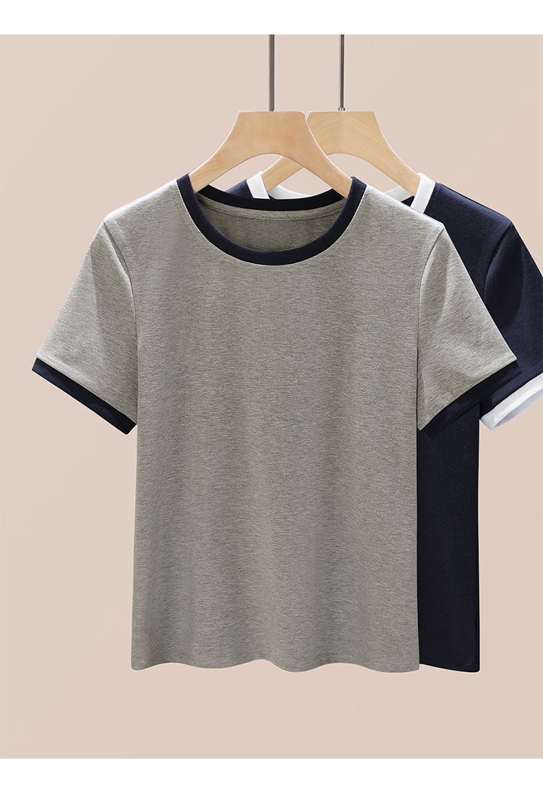 丁摩 盐系撞色拼接弹力正肩上衣新款高端灰色圆领短袖t恤女夏季5ZF-719