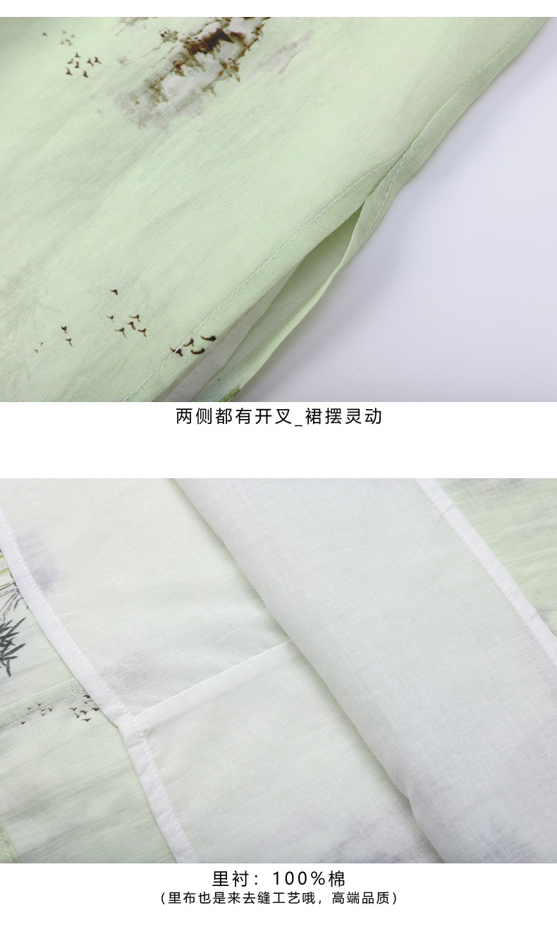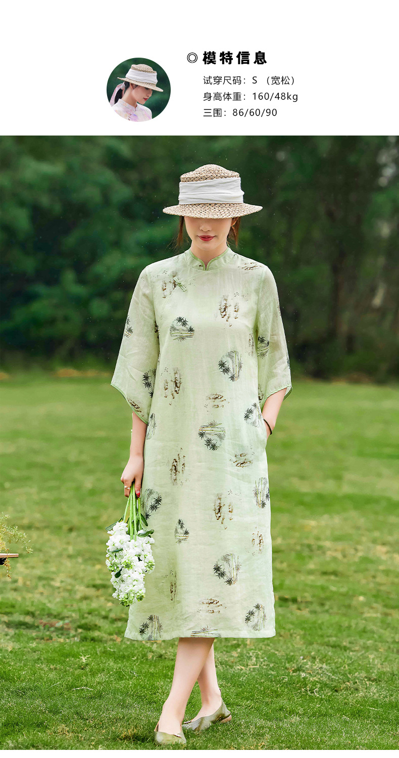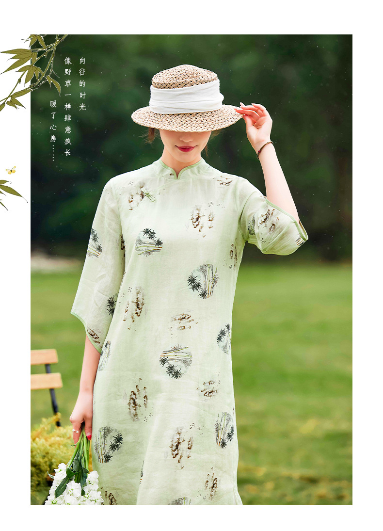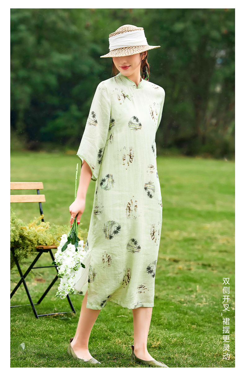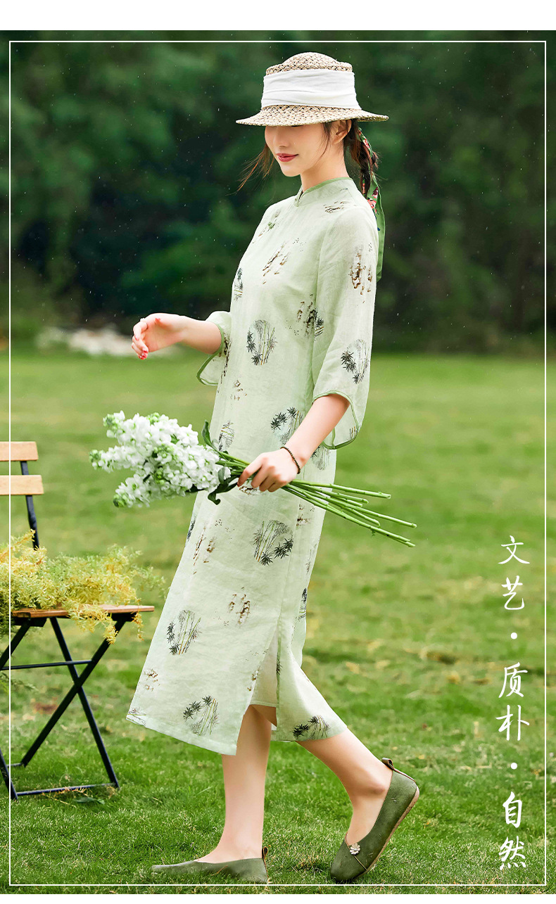 HM-S353春夏新款禅意苎麻改良式旗袍裙倒袖设计文艺印花侧开叉连衣裙