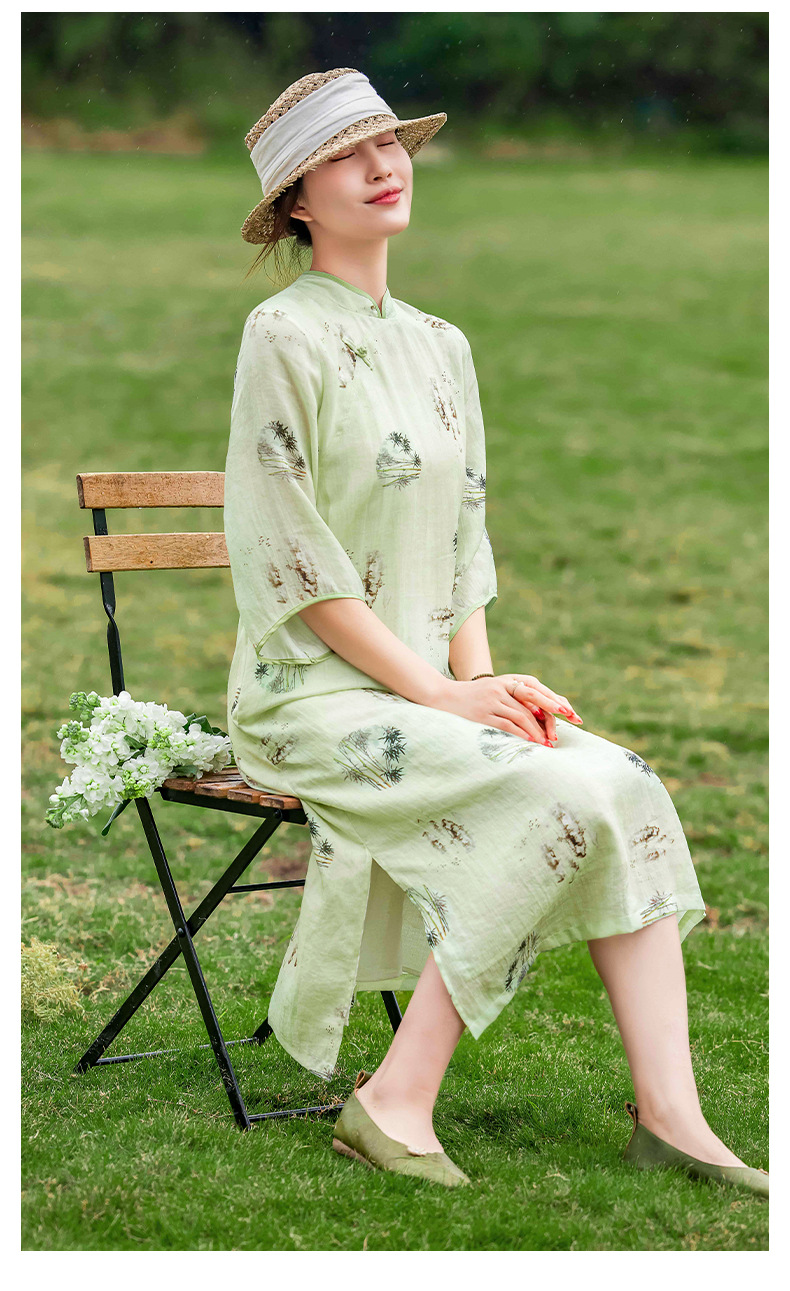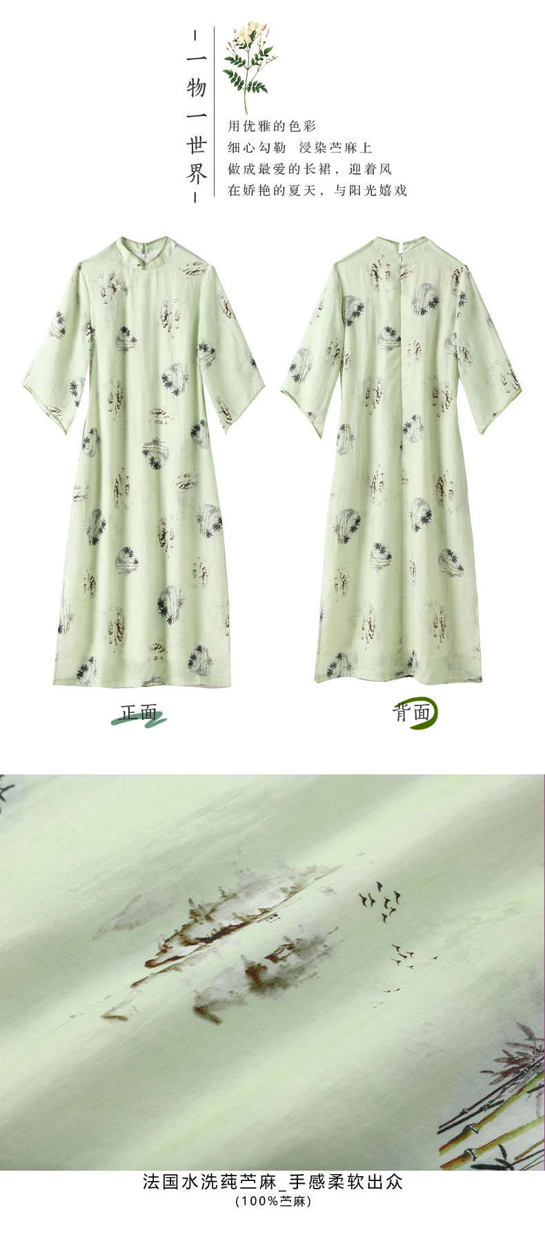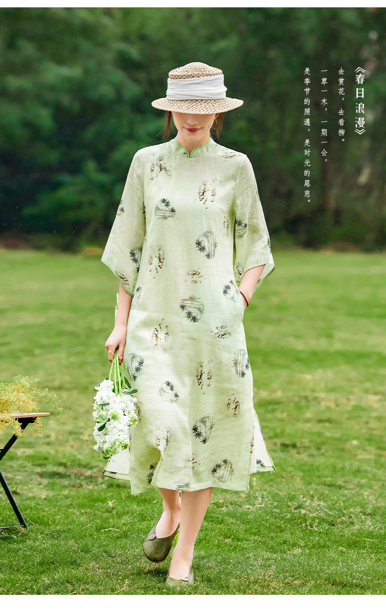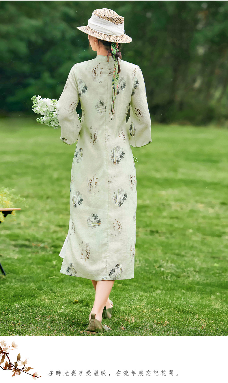 HM-S353春夏新款禅意苎麻改良式旗袍裙倒袖设计文艺印花侧开叉连衣裙