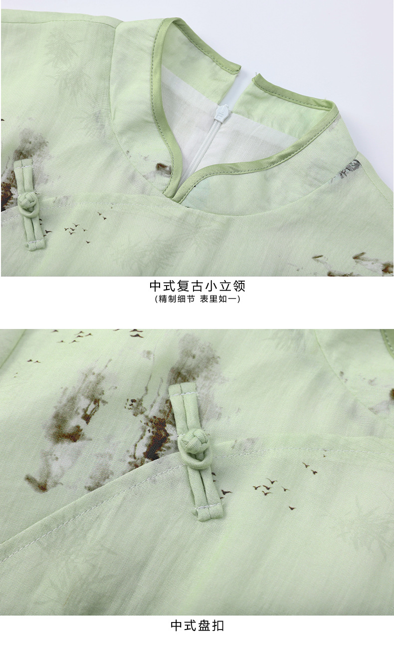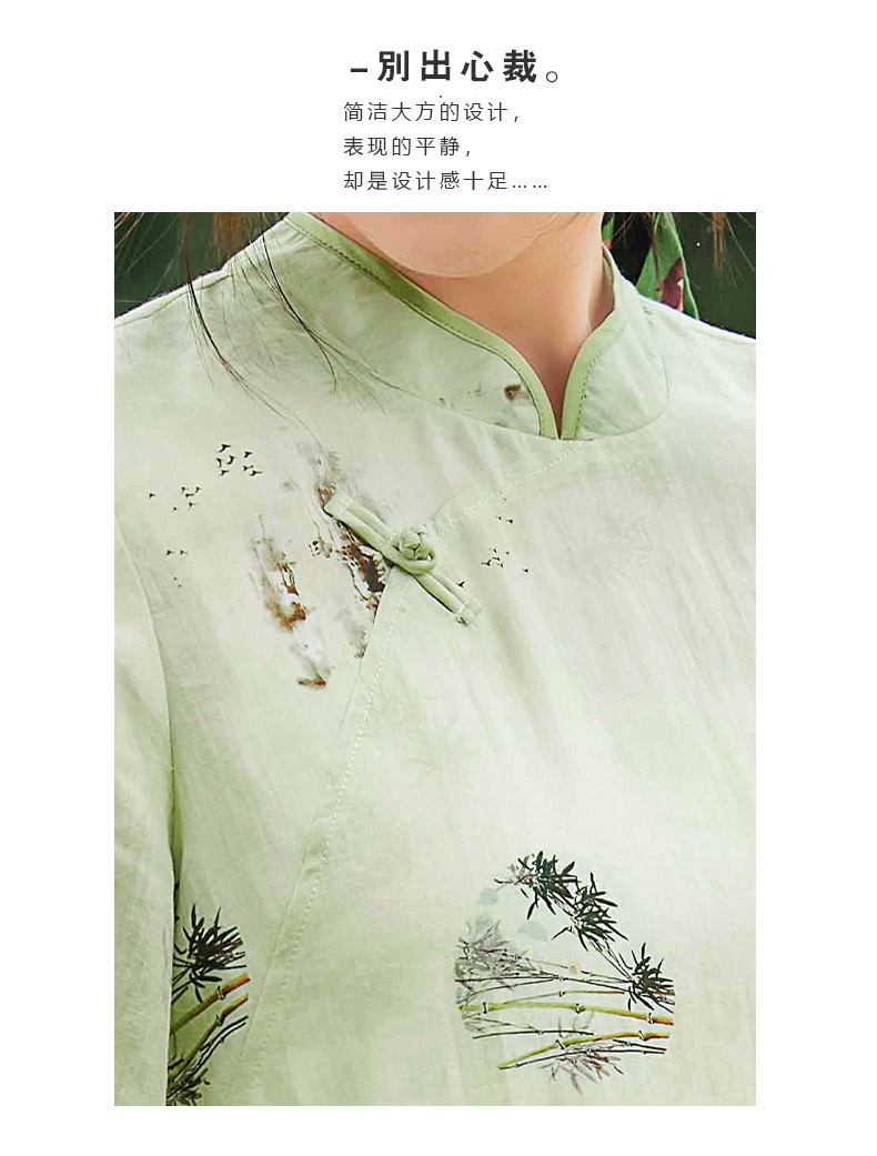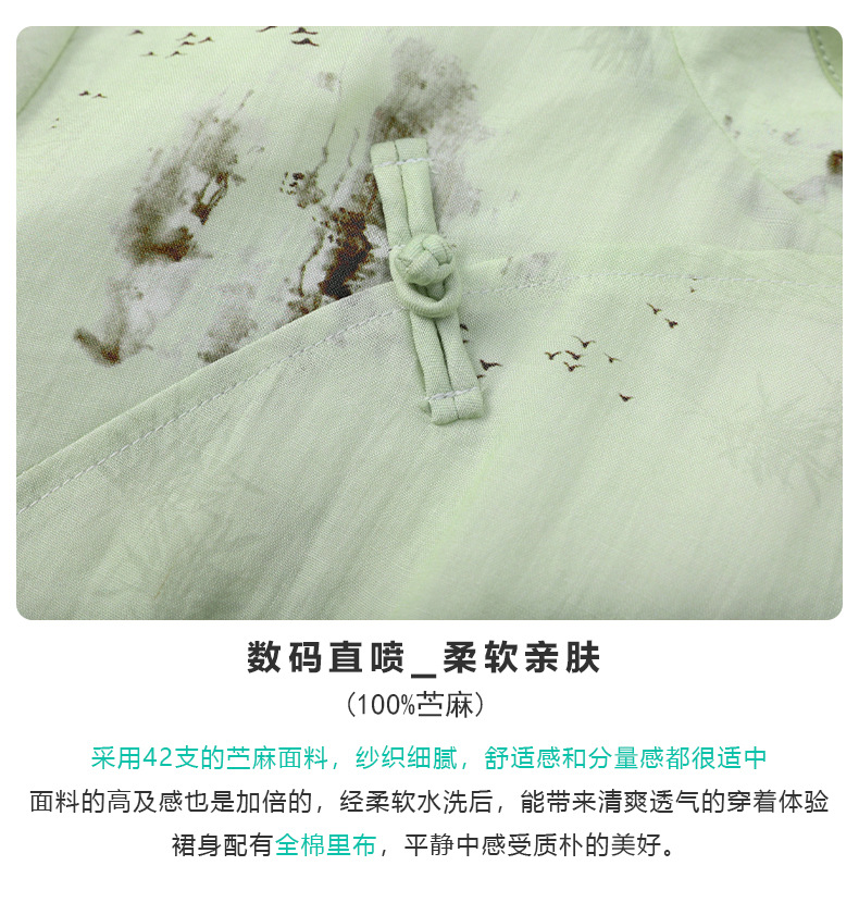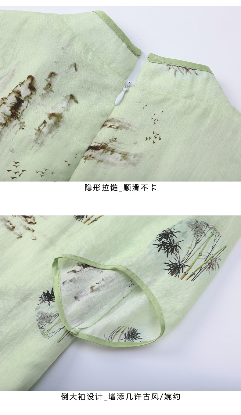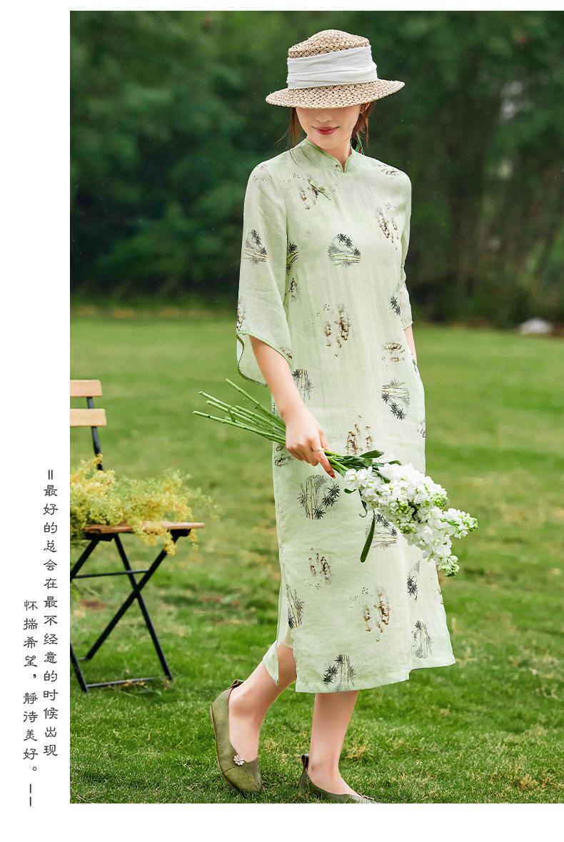 HM-S353春夏新款禅意苎麻改良式旗袍裙倒袖设计文艺印花侧开叉连衣裙