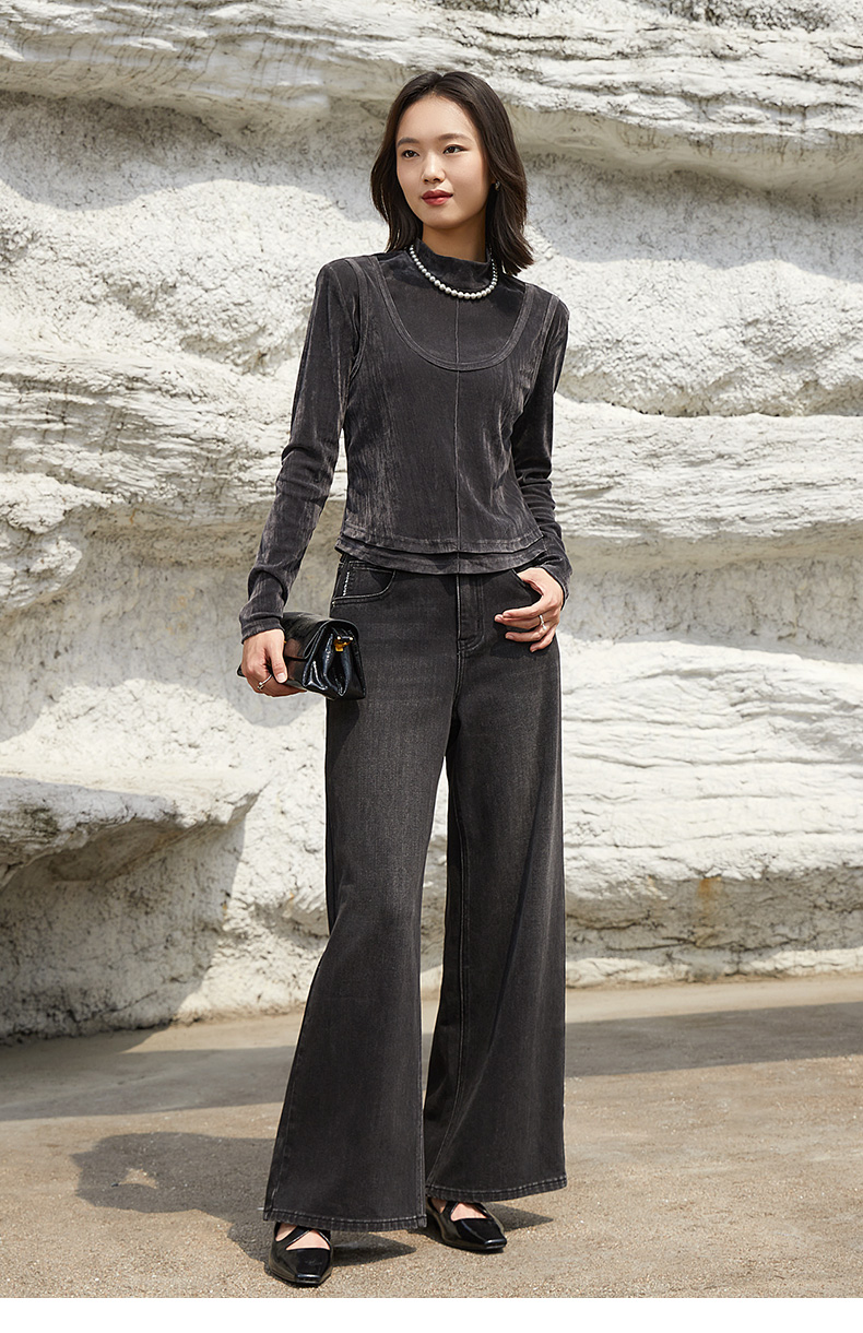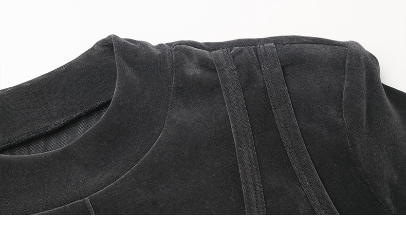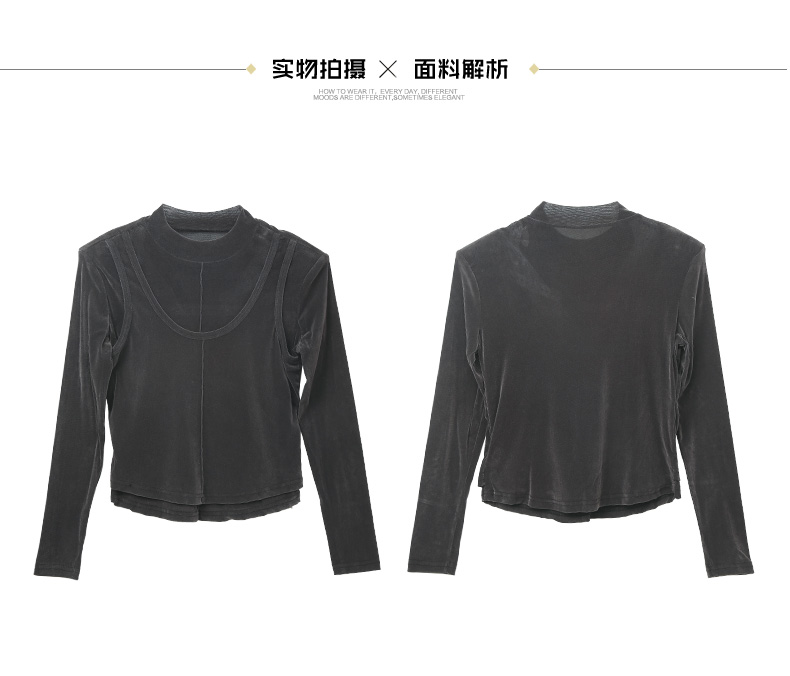 黑灰色丝绒假两件高领上衣 拼接镂空设计修身长袖 秋冬小众设计感内搭打底衫
