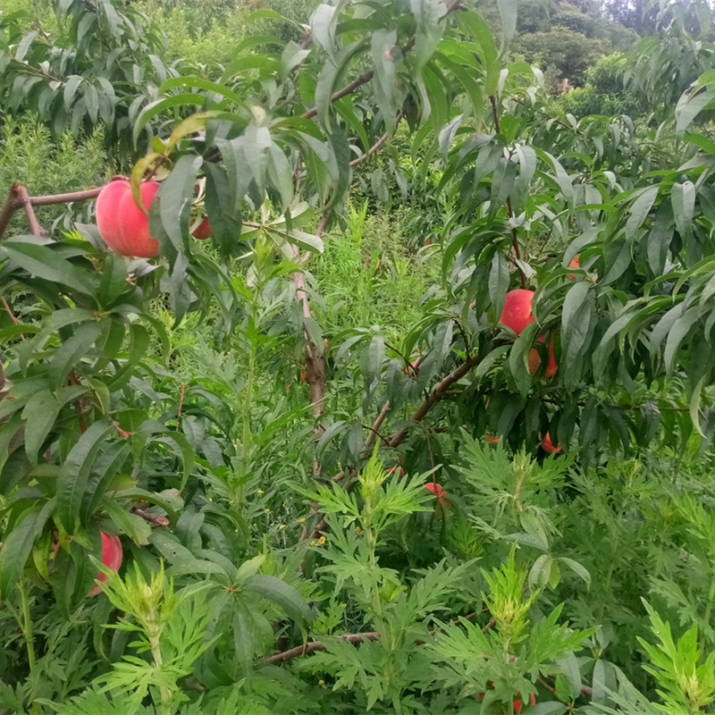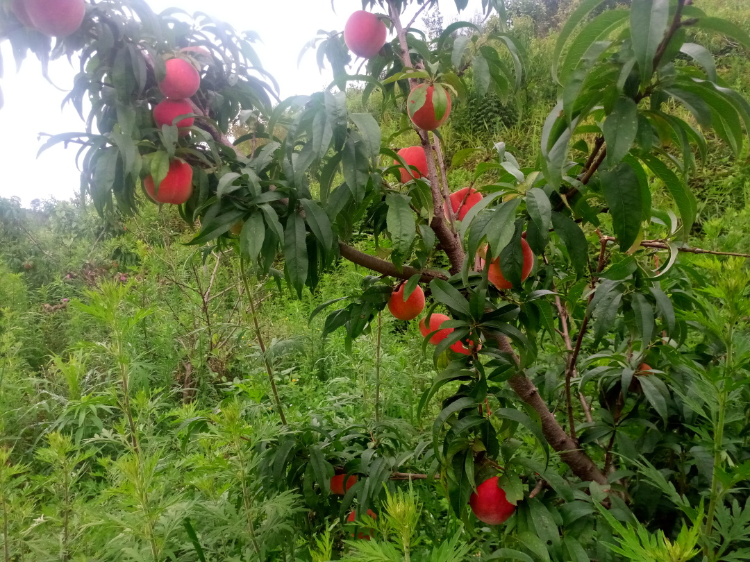 桃园深处大山之中,海拔约1800m,冬春季处于旱季状态,病虫害较少。冬天里,给桃树用一次自制的石硫合剂清园灭虫。夏秋天,任由杂草生长或种几棵南瓜南瓜,到冬天再割草还地。