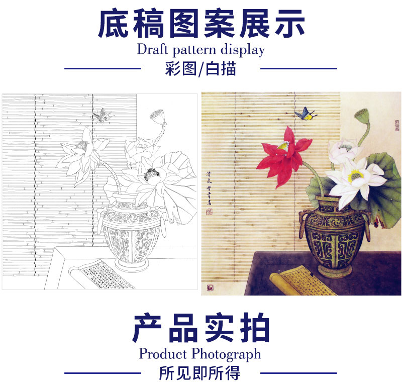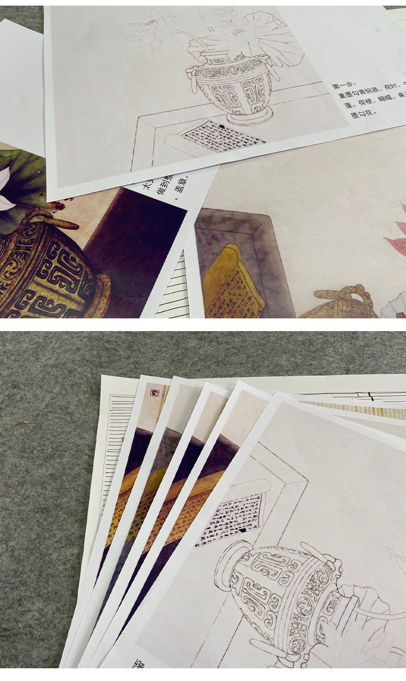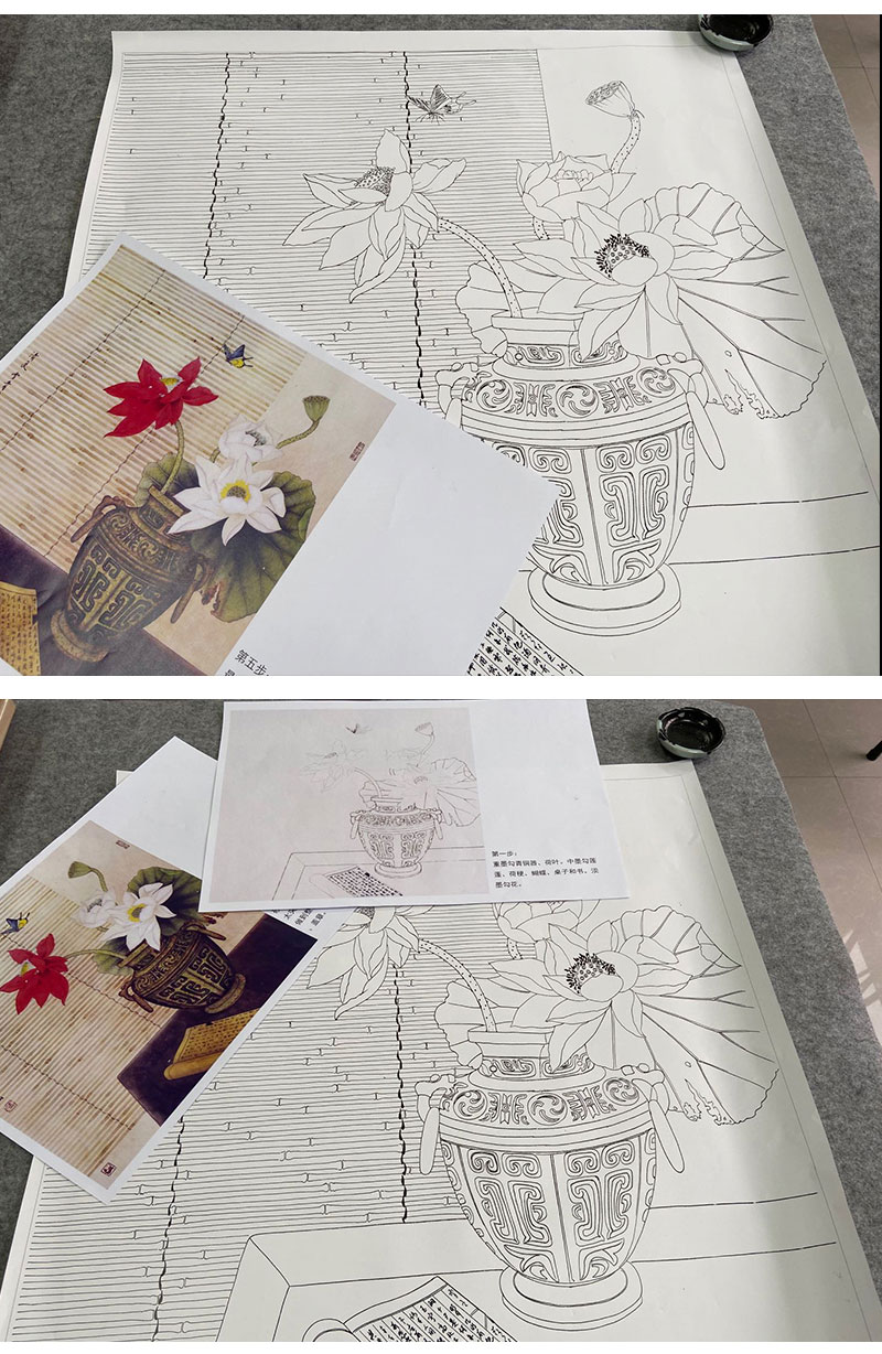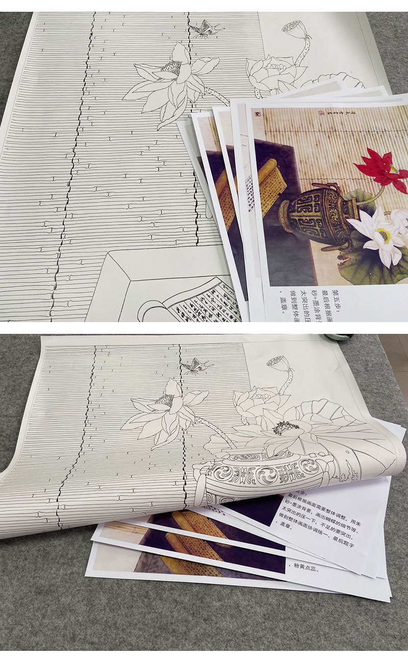 【有步骤】龚雪青工笔画白描底稿斗方小品《清夏》荷花蝴蝶初学者临摹花鸟线稿XQ84