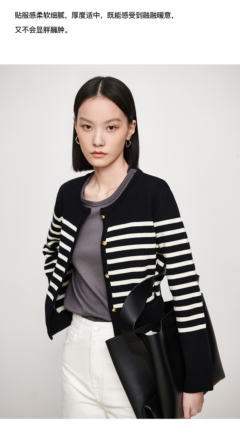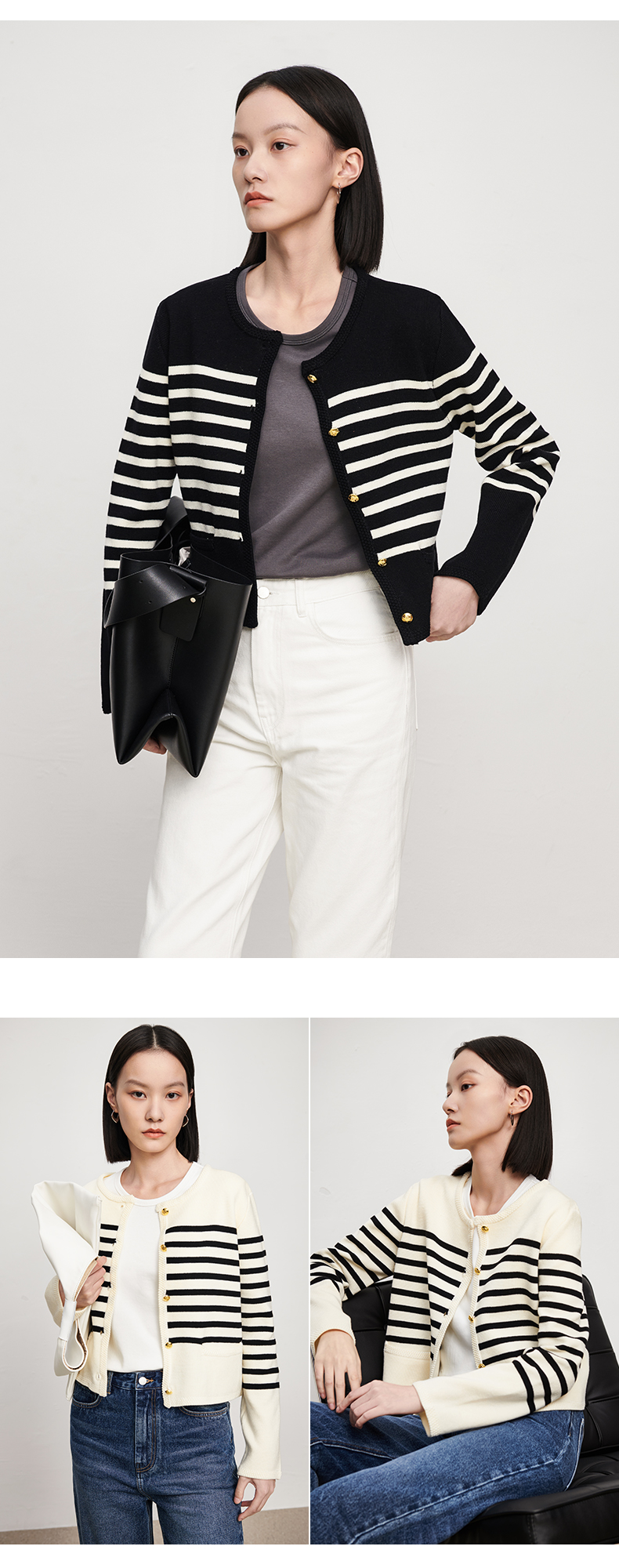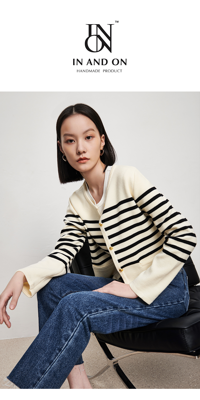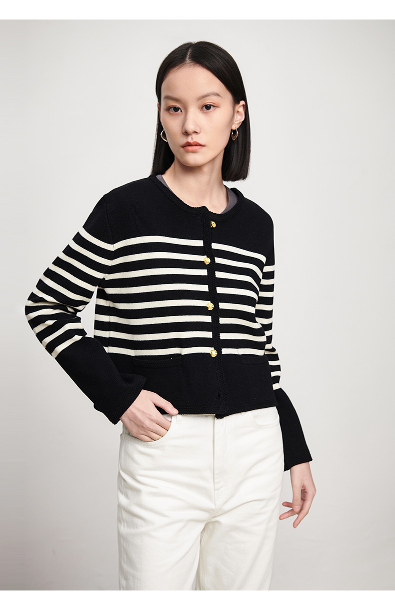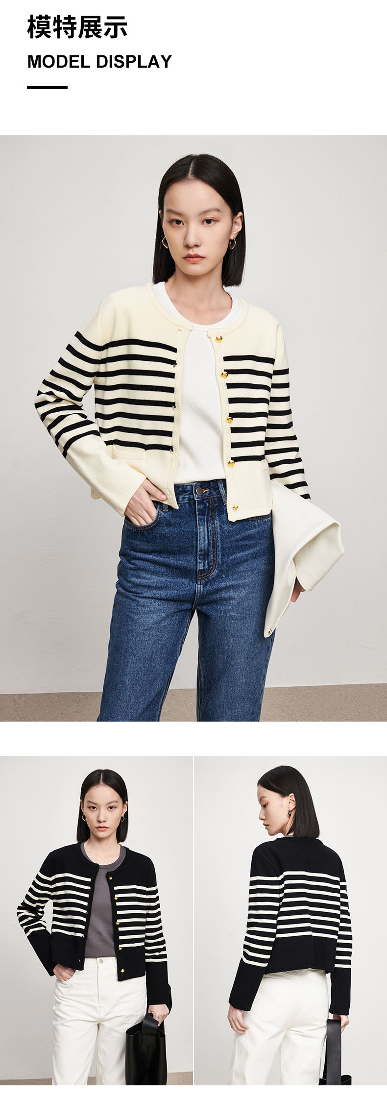 IN AND ON2023春季黑白条纹针织开衫女新款百搭圆领金属扣小香风外套