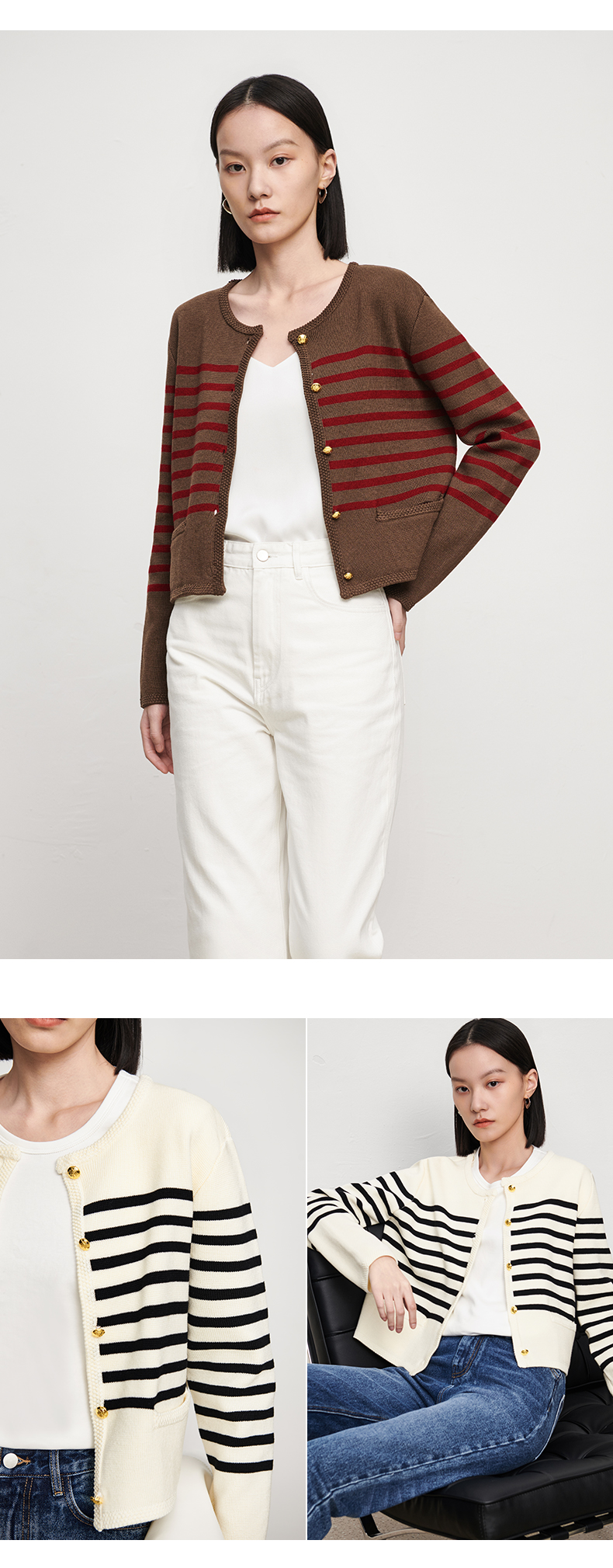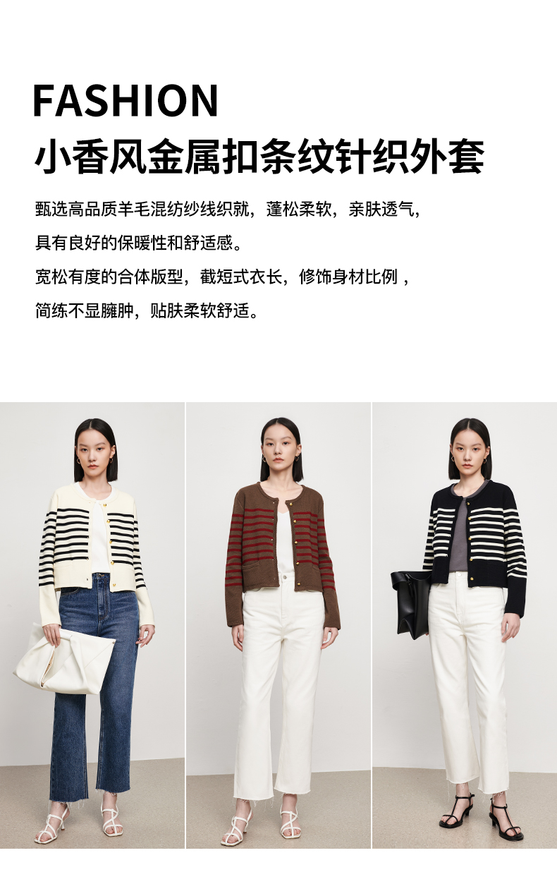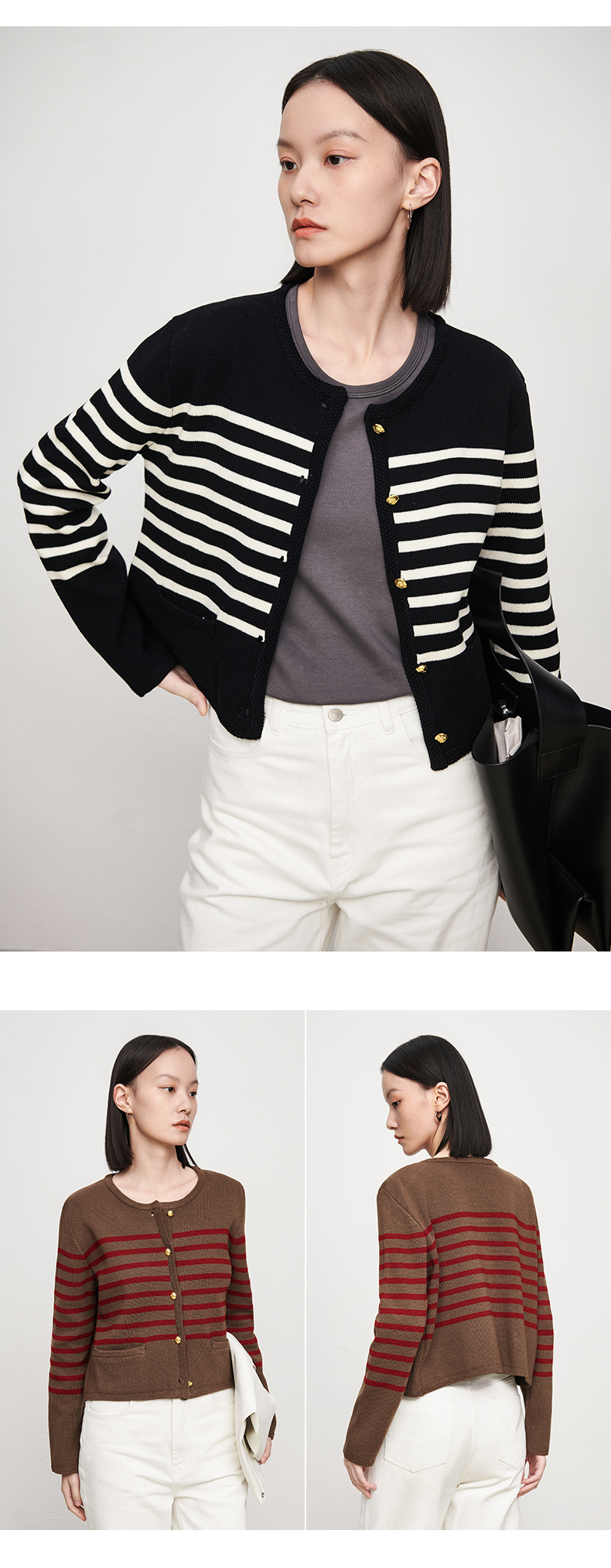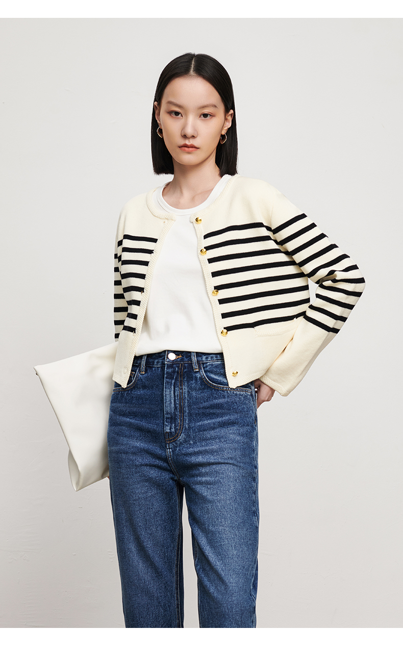 IN AND ON2023春季黑白条纹针织开衫女新款百搭圆领金属扣小香风外套