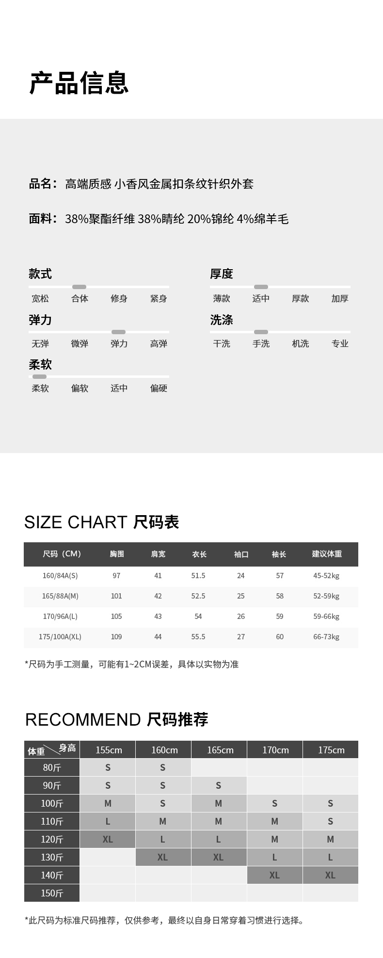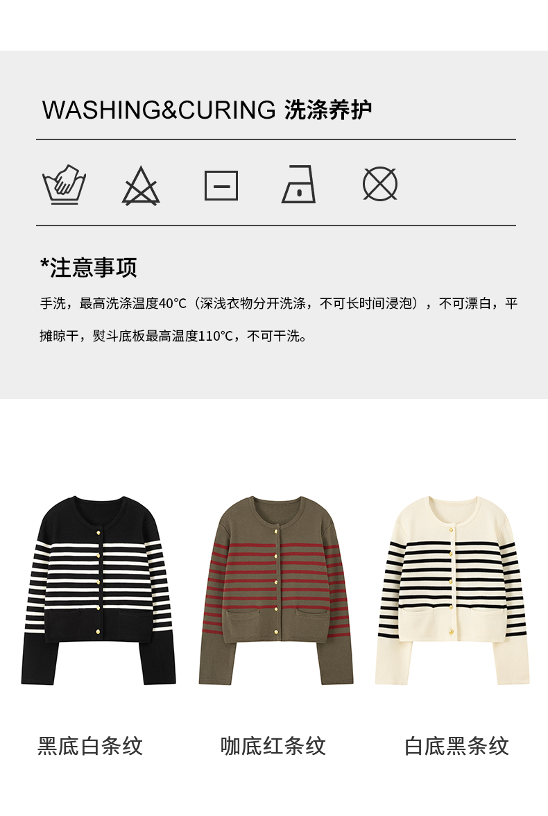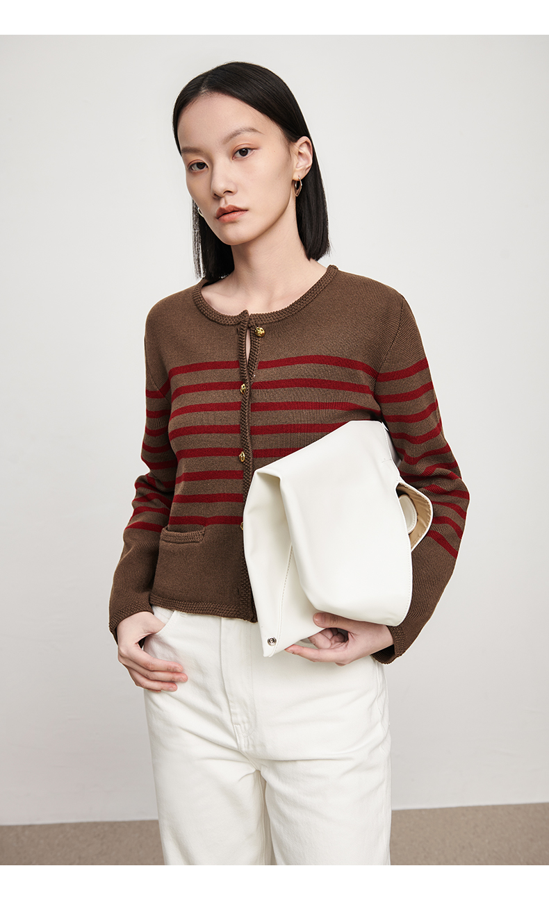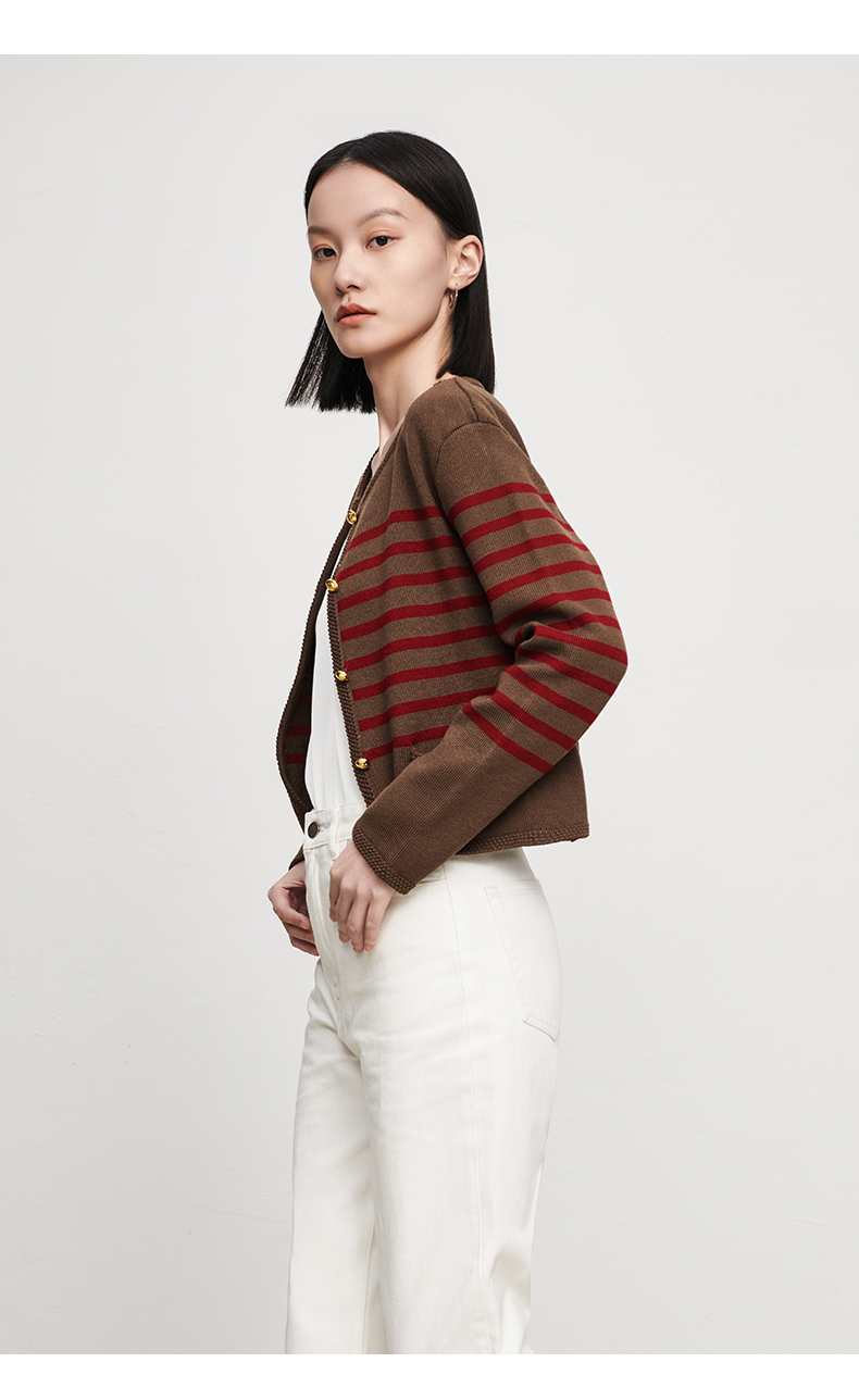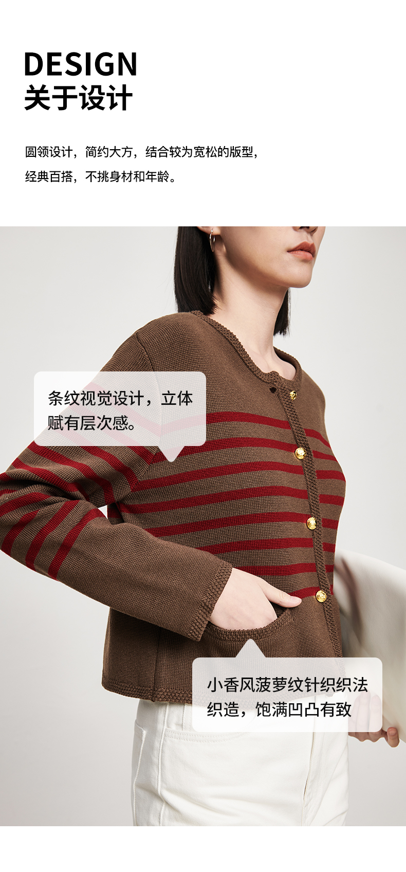 IN AND ON2023春季黑白条纹针织开衫女新款百搭圆领金属扣小香风外套