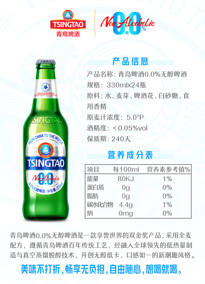 青岛啤酒0.0%无醇啤酒330ml*24瓶 商品缩略图0 青岛啤酒0.0%无醇啤酒330ml*24瓶 商品缩略图1 青岛啤酒0.0%无醇啤酒330ml*24瓶 商品缩略图2 青岛啤酒0.0%无醇啤酒330ml*24瓶 商品缩略图3 青岛啤酒0.0%无醇啤酒330ml*24瓶 商品缩略图4