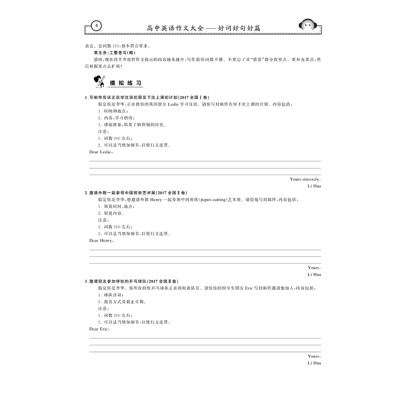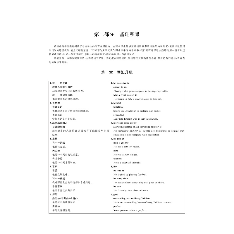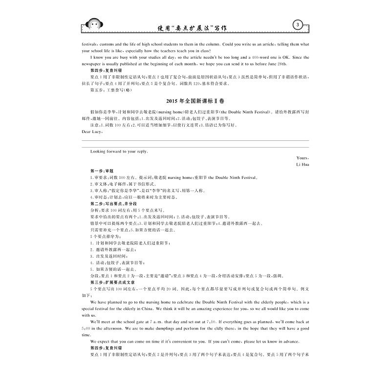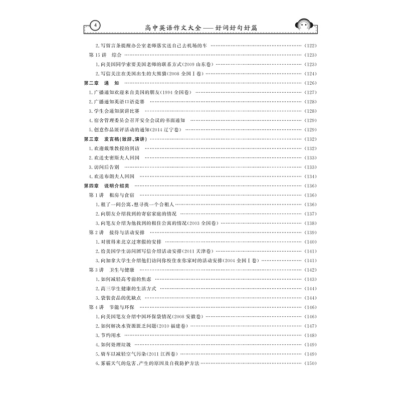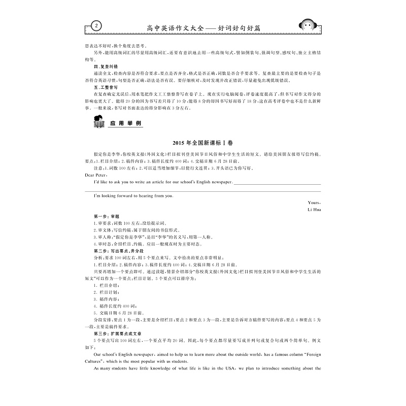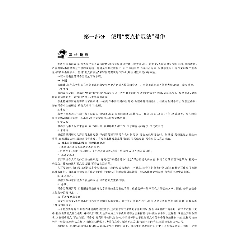 高中英语大纲对学生“写作”能力要求很高,而现在大部分学生的写作水平却很糟。本书主要是解决学生语言积累过少的问题。本书先介绍了写半开放性作文最常用的方法 “要点拓展法”。“基础积累”部分列出了写作中最常用的词汇和句式,以提高学生的语言储备。“分类指导与练习”部分,精选了150篇语言点丰富、适合背诵的范文,按体裁归类,方便使用。最后列出近10年的高考真题,以便找出命题规律,使作文备考更具有针对性。