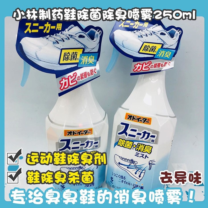 小林制药鞋除菌除臭喷雾250ml👍运动鞋除臭剂❗鞋子去异味❗鞋除臭杀菌喷雾❗无论是有臭脚的,还是脚爱出汗的😵,在穿完鞋回来喷一喷🌬,👊抵御难闻汗味、杀灭细菌!! 除菌和消臭一步完成✅,同时抵御霉菌的繁殖。一瓶大概能喷800回左右,一只鞋喷2-3次、能用100回呢非常超值~专治臭臭鞋的消臭喷雾!🉑