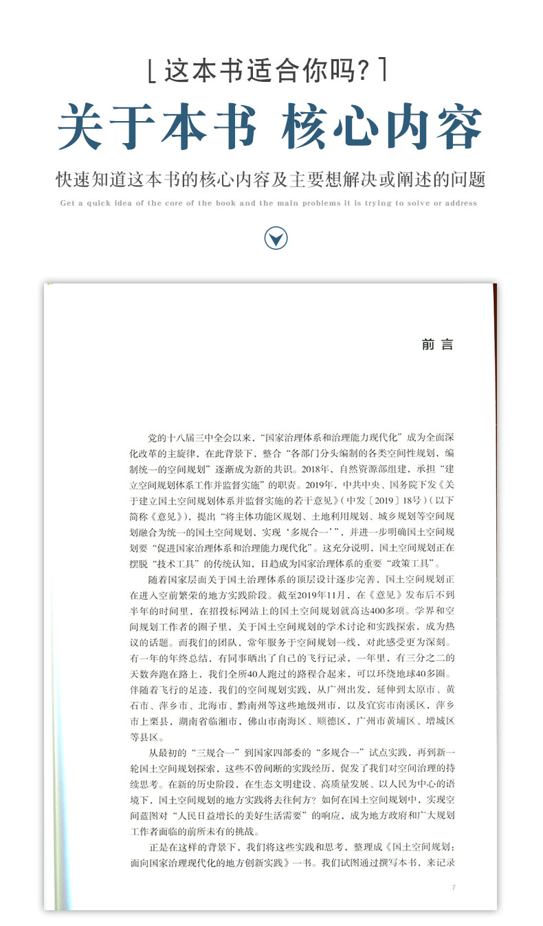 本书围绕地方发展视角展开,研究国土空间规划过去现在与未来,结合鲜活的地方实践,探究地方发展中“治理与发展”、“事权与规划”、“战略与责任”、“资源与边界”、“空间与场景、”、“管制与规则”、“实践与启程”、“未来与期许”的关系,共分为九篇,分别以以上分享为主要写作切入点。