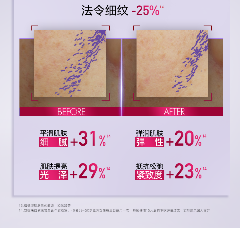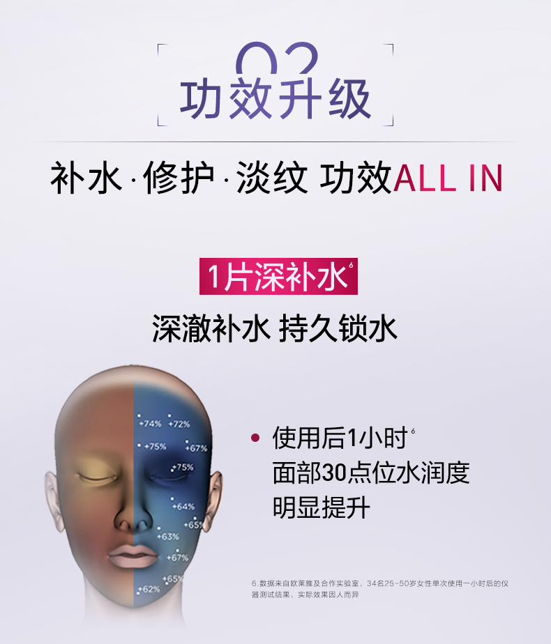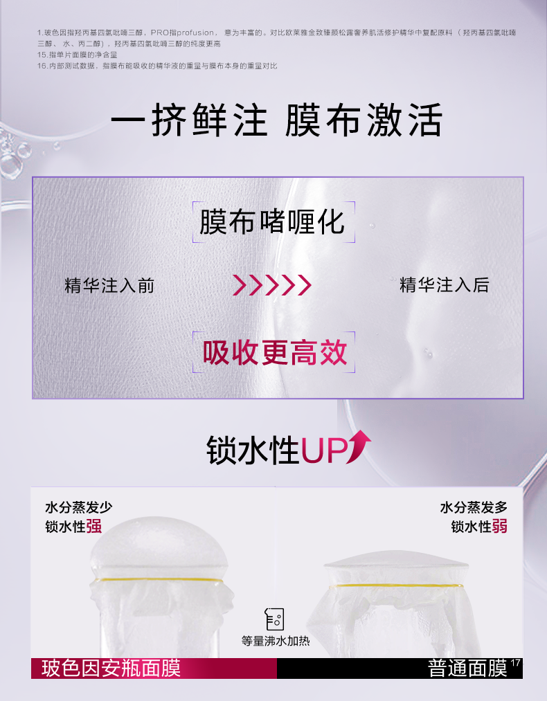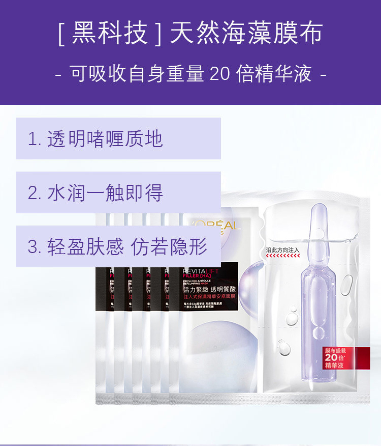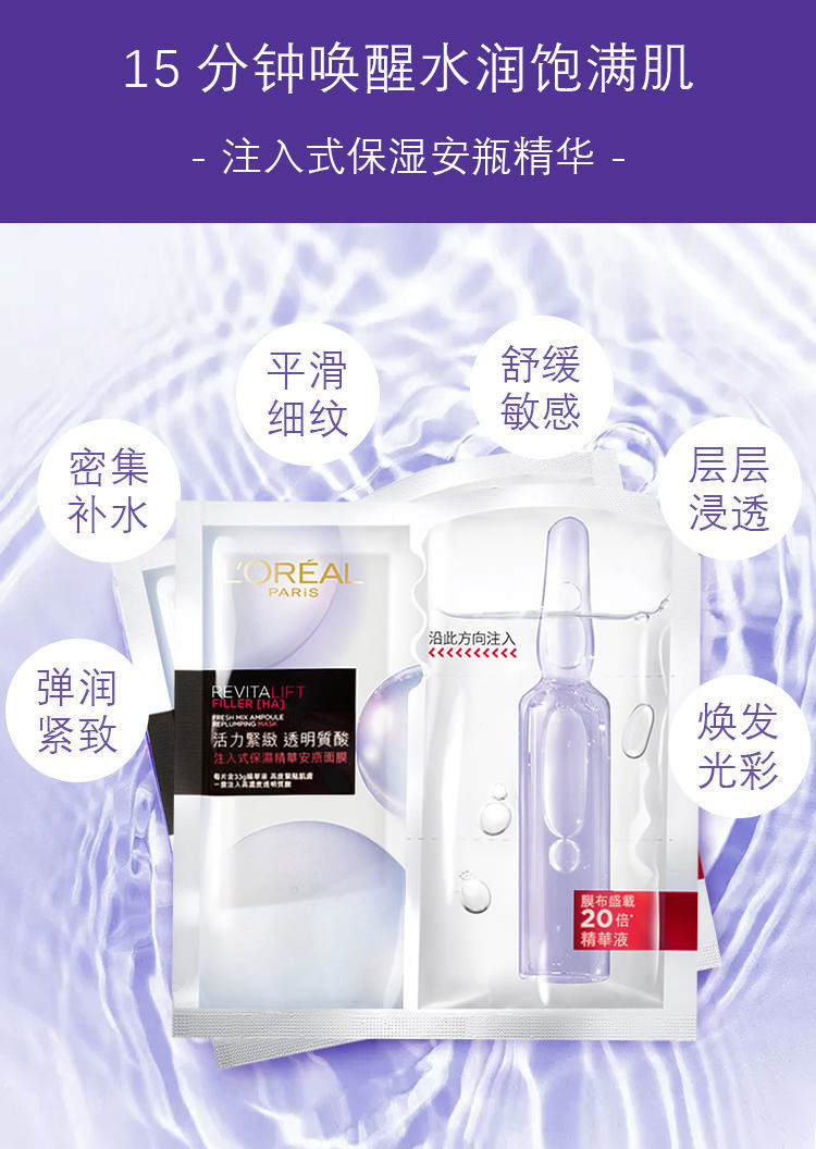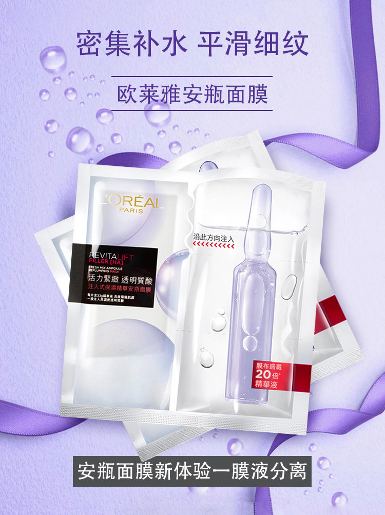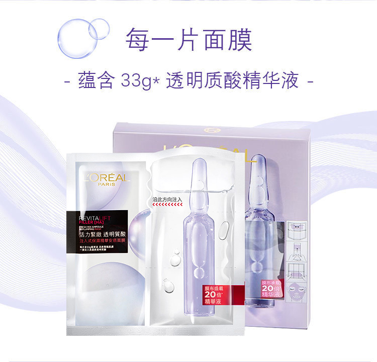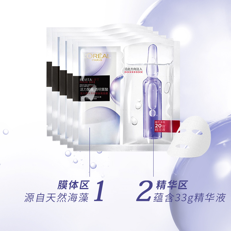 法国欧莱雅L'OREAL复颜玻尿酸水光充盈导入安瓶鲜注精华面膜33g*5片装