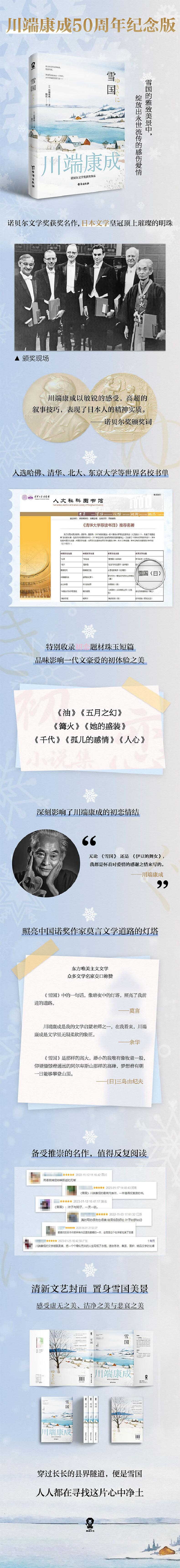 《雪国》是川端康成的唯美主义代表作,作者用婉约哀伤的笔调,为读者描绘了一个虚无之美、洁净之美与悲哀之美交织的雪世界。故事主要讲述一位名叫岛村的东京舞蹈艺术研究家,三次前往雪国的温泉旅馆,与当地的艺伎驹子以及萍水相逢的少女叶子之间发生的爱情纠葛,文中充满了爱与徒劳的细腻情感。