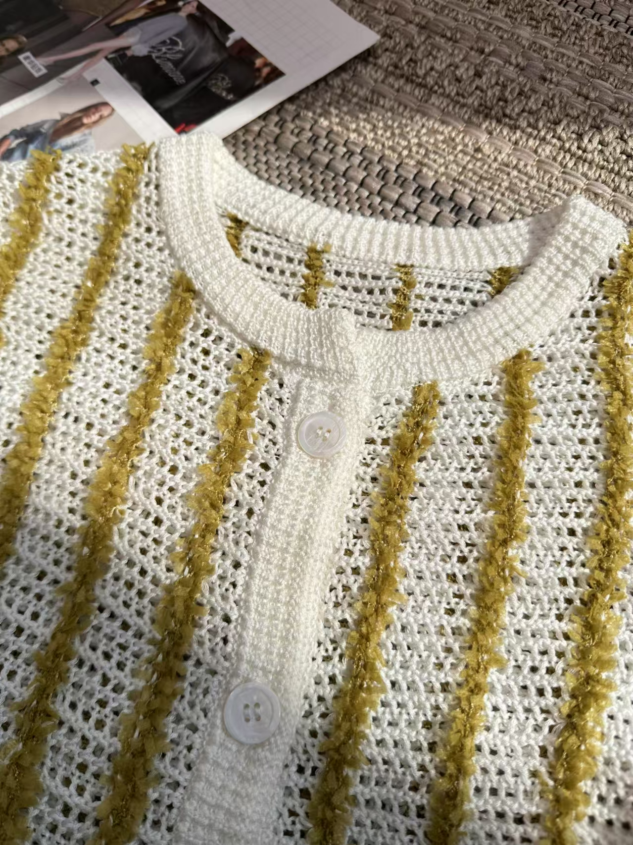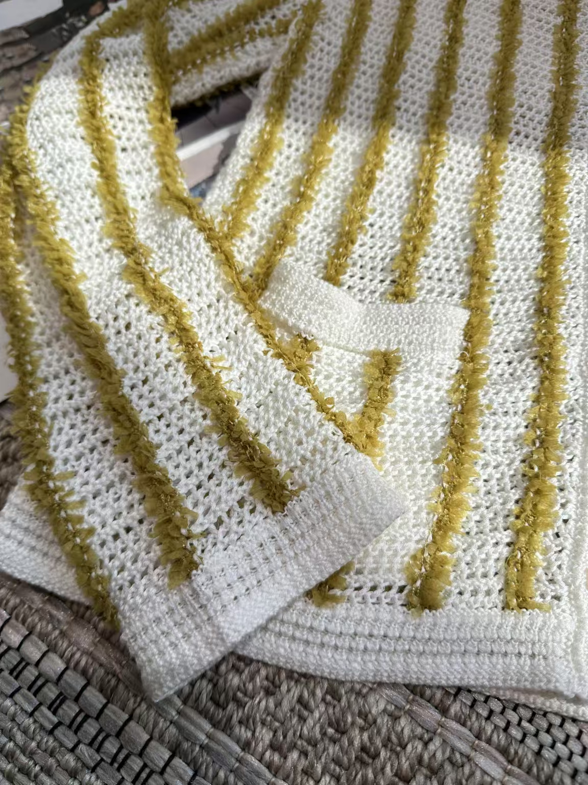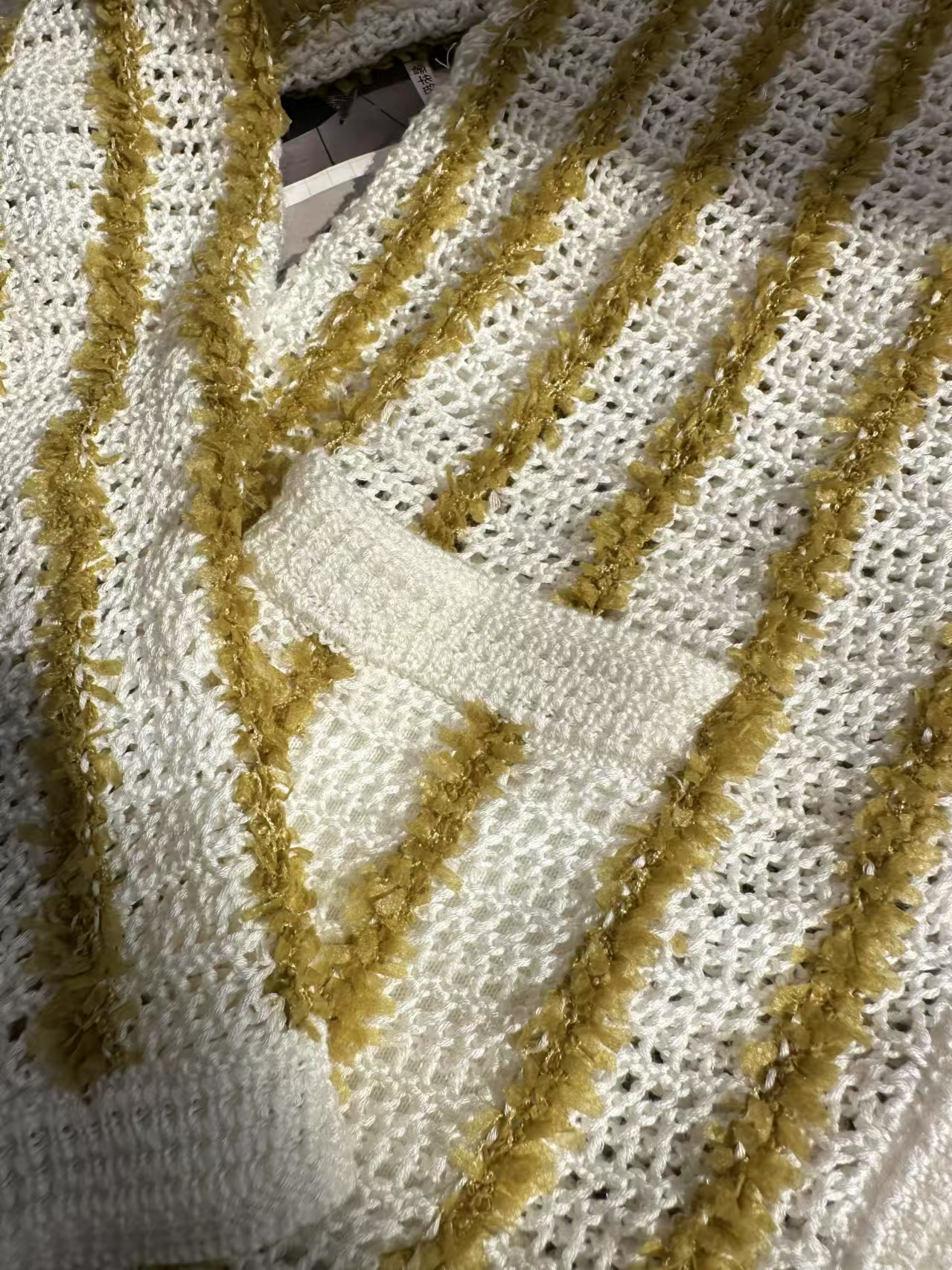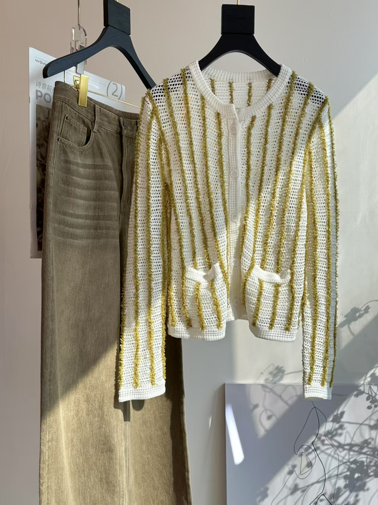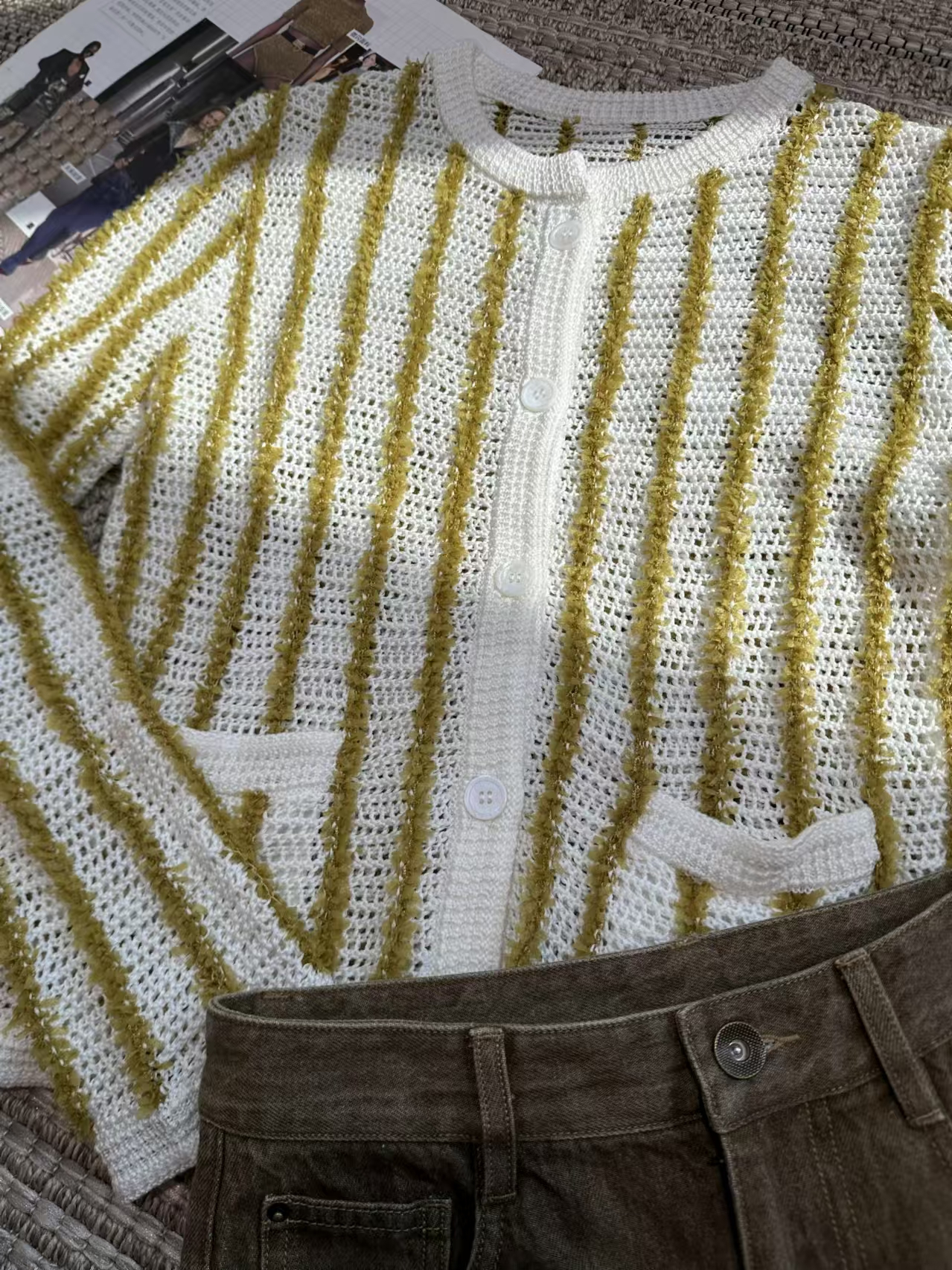 顺丰包邮35827洛诗琳柠黄竖条纹镂空花纱毛织开衫外套295241