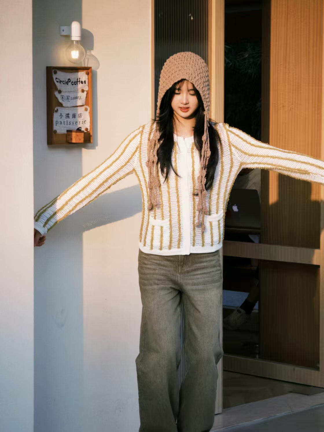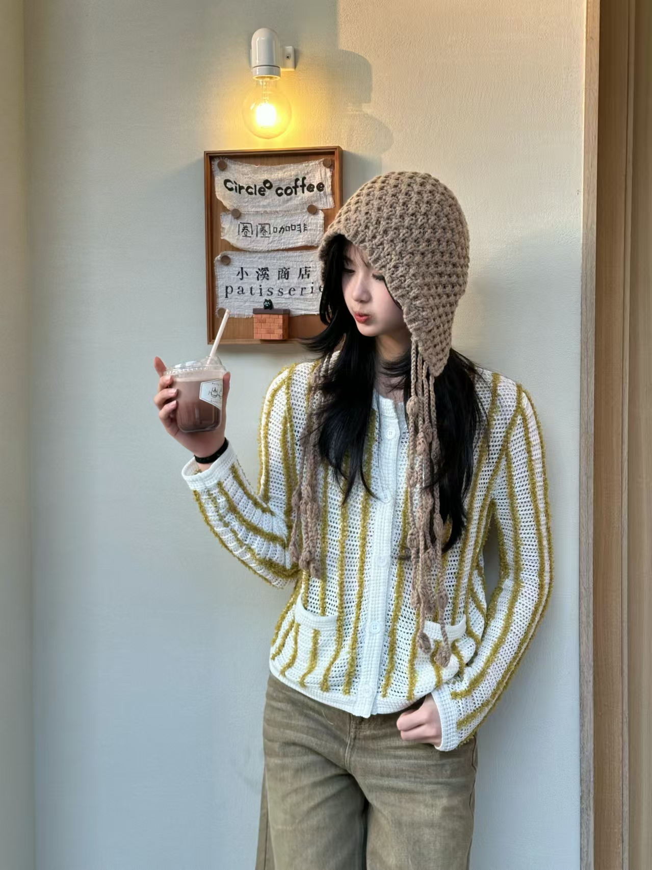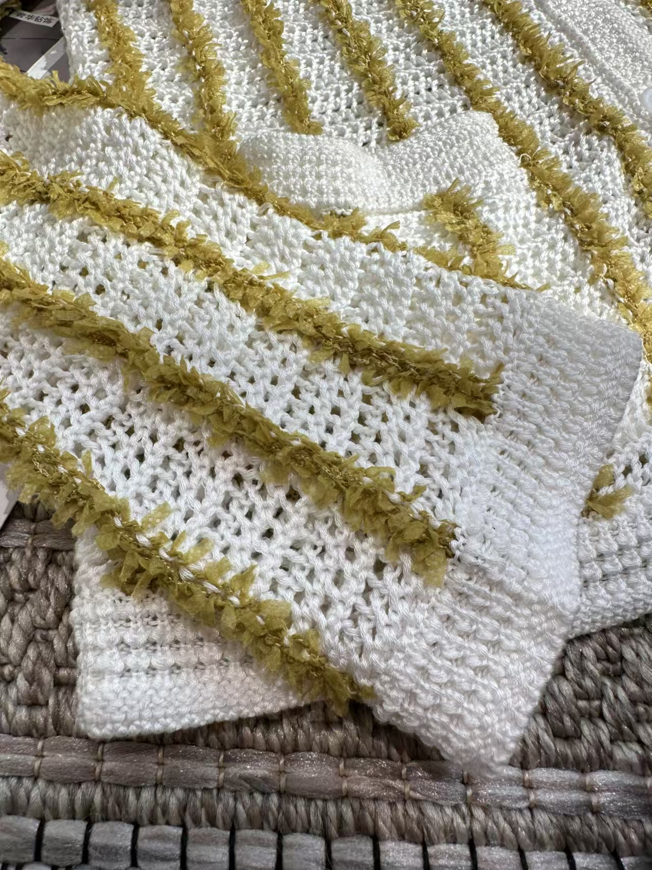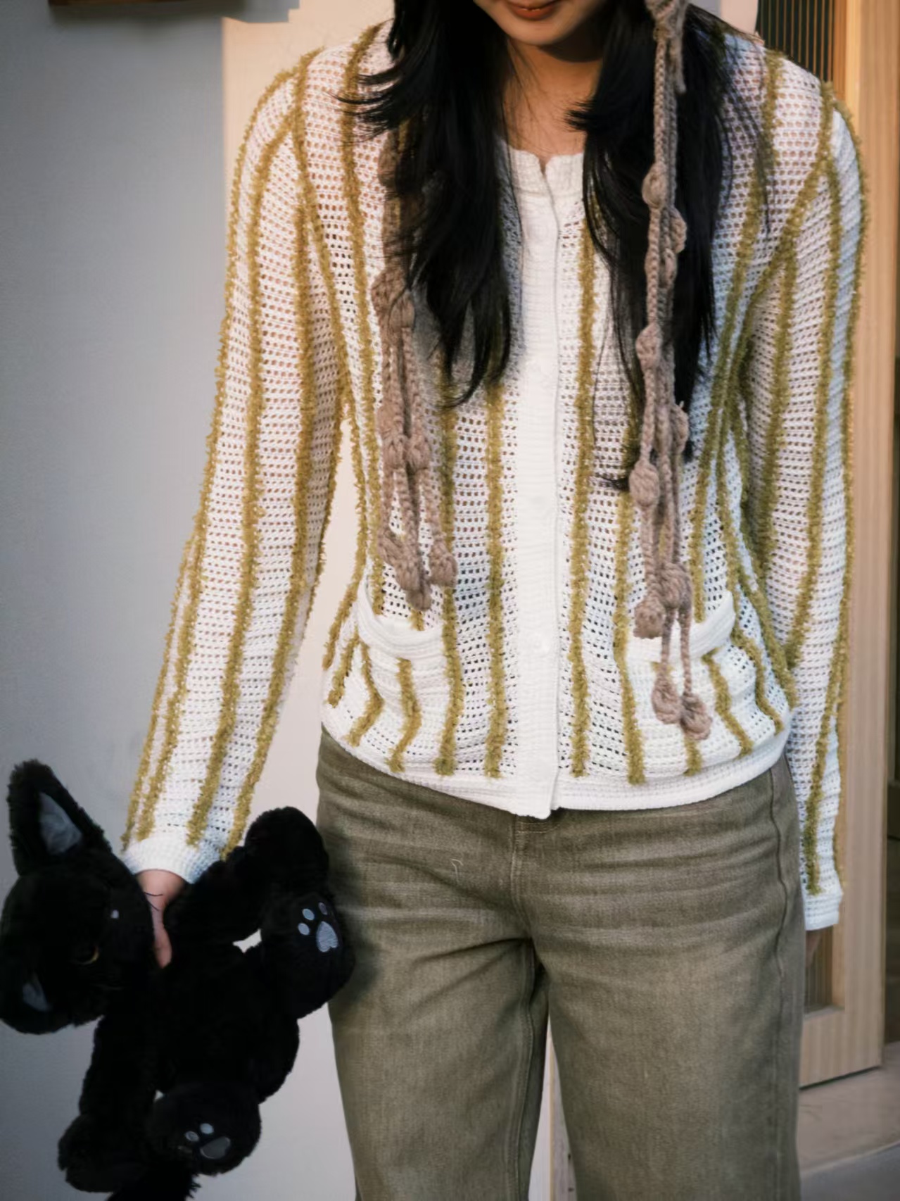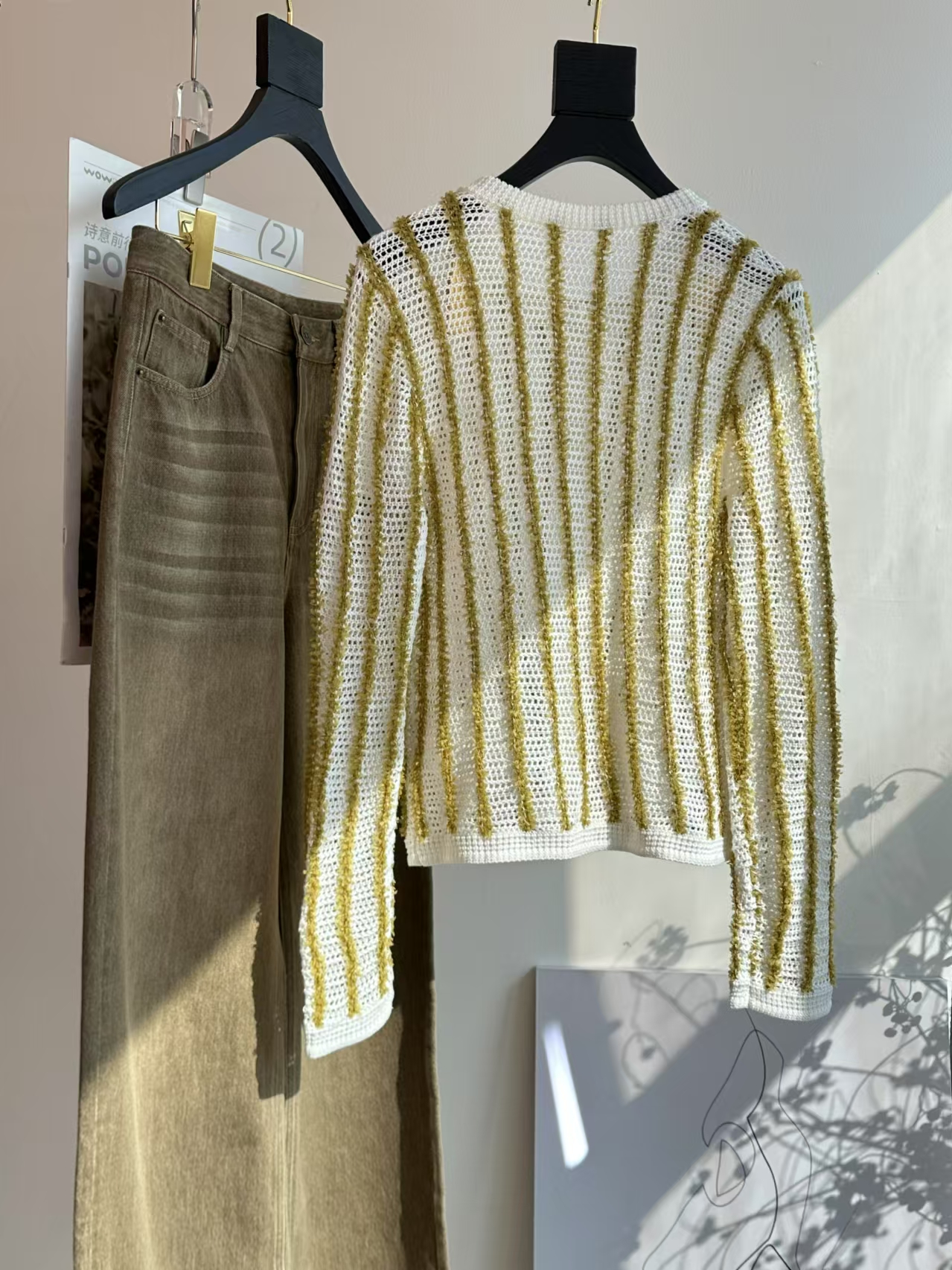 顺丰包邮35827洛诗琳柠黄竖条纹镂空花纱毛织开衫外套295241