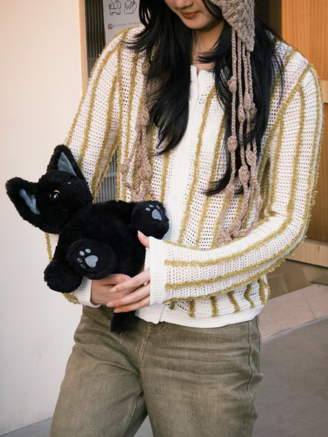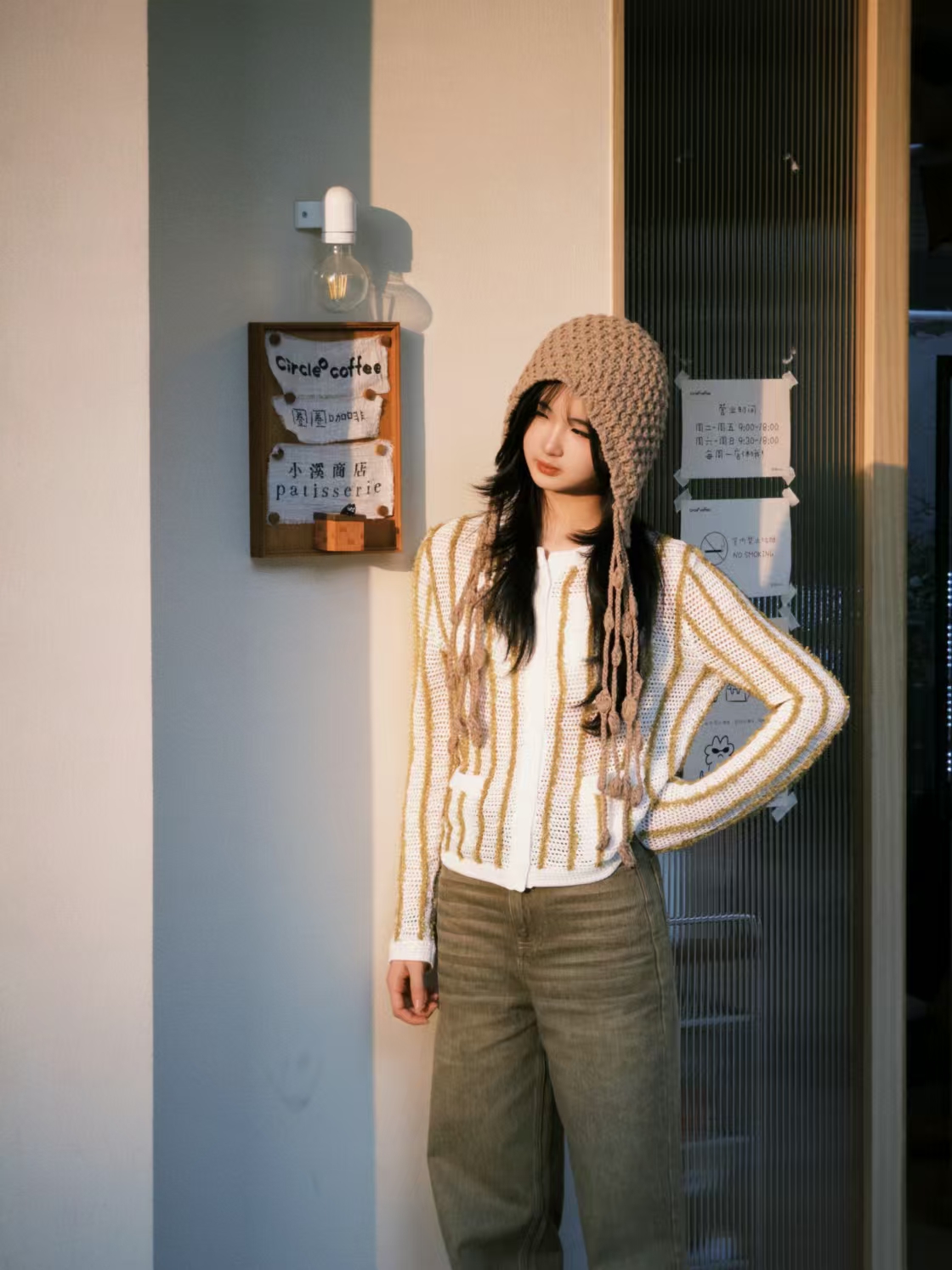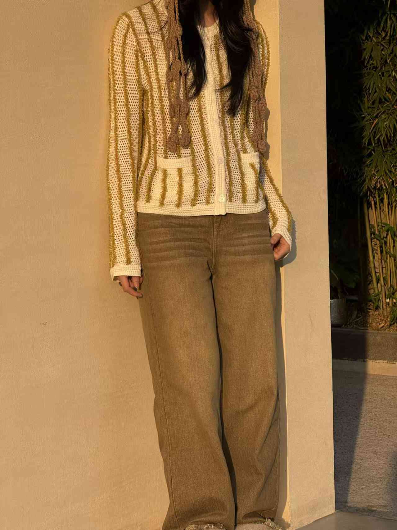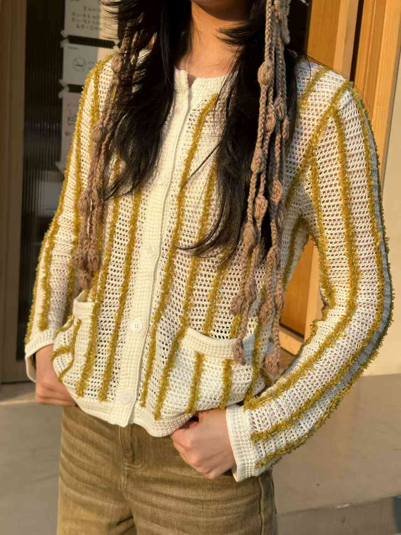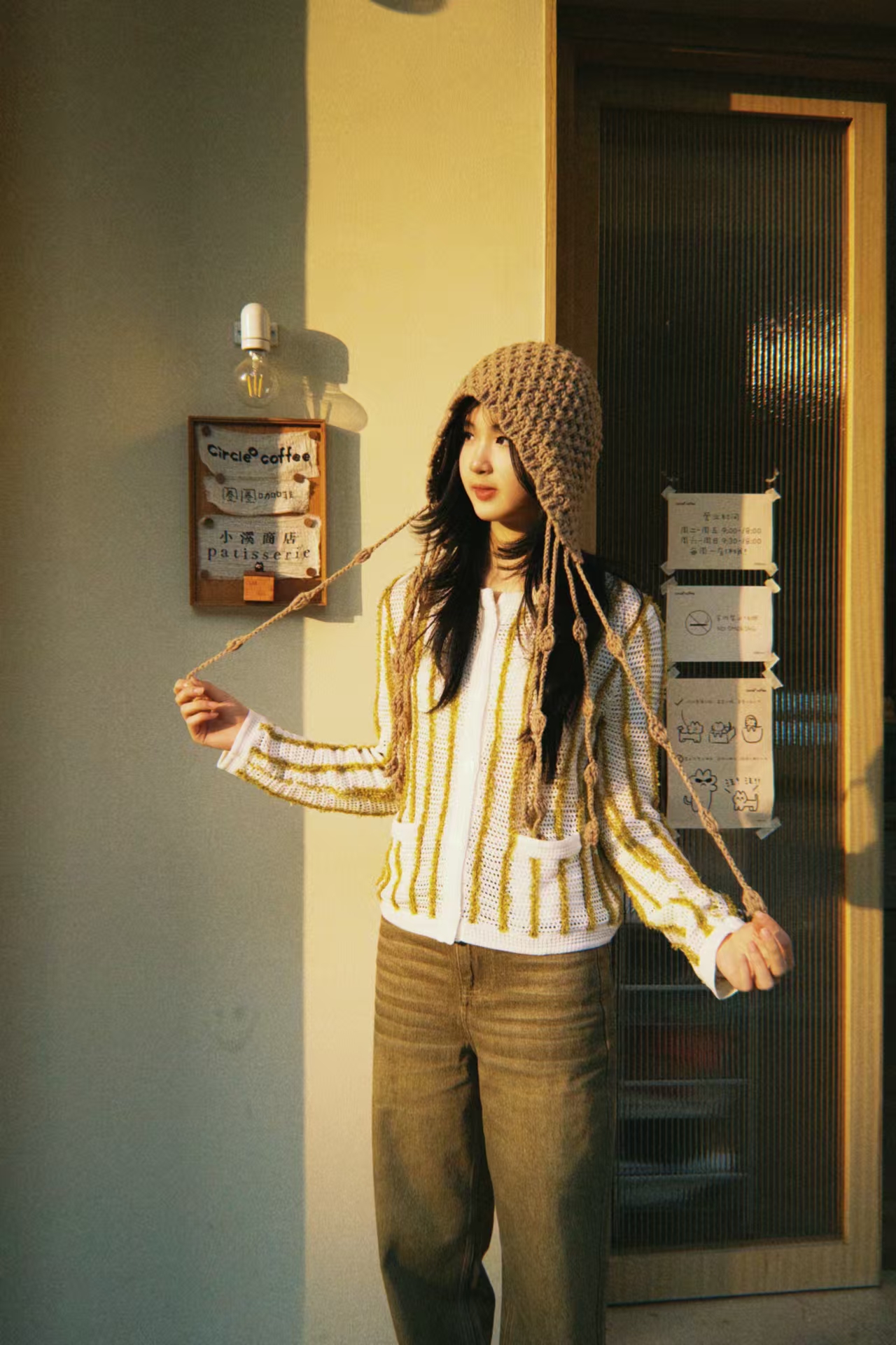 顺丰包邮35827洛诗琳柠黄竖条纹镂空花纱毛织开衫外套295241