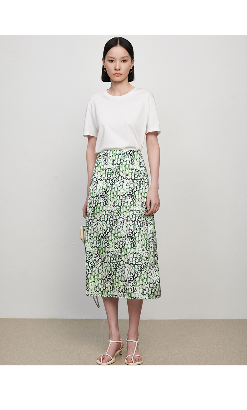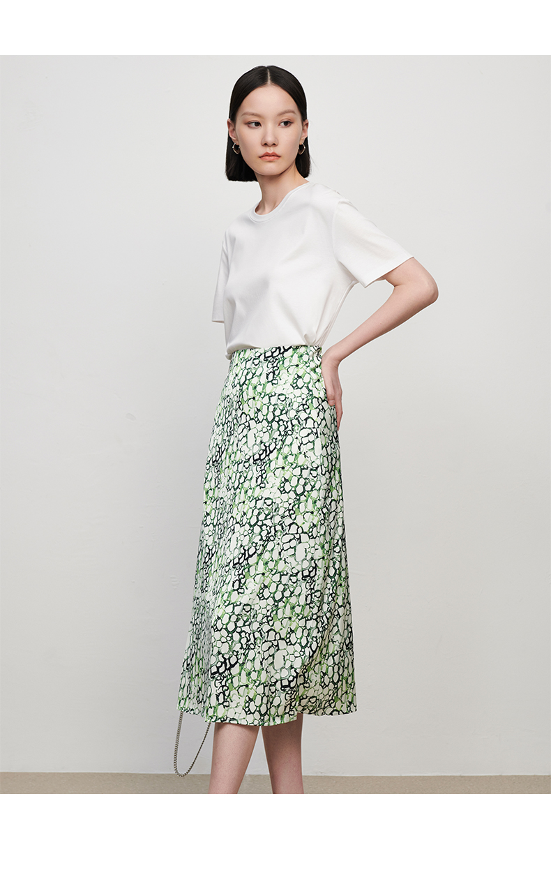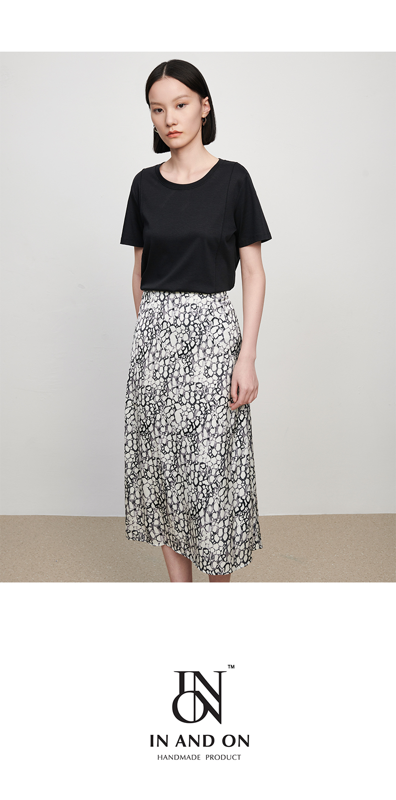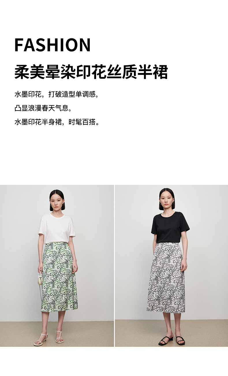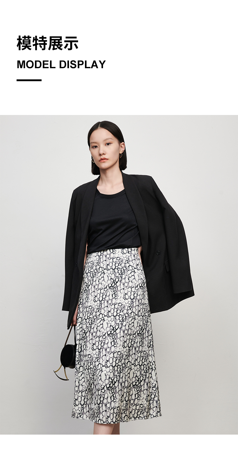 IN AND ON夏季新款女晕染印花丝质高腰通勤时尚A字黑色半身裙21798