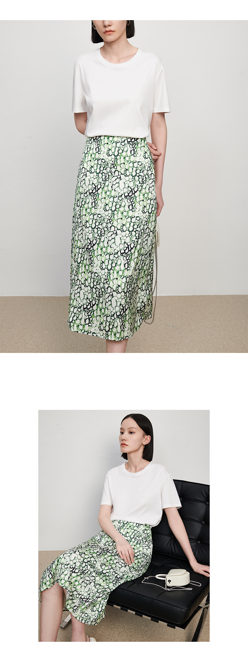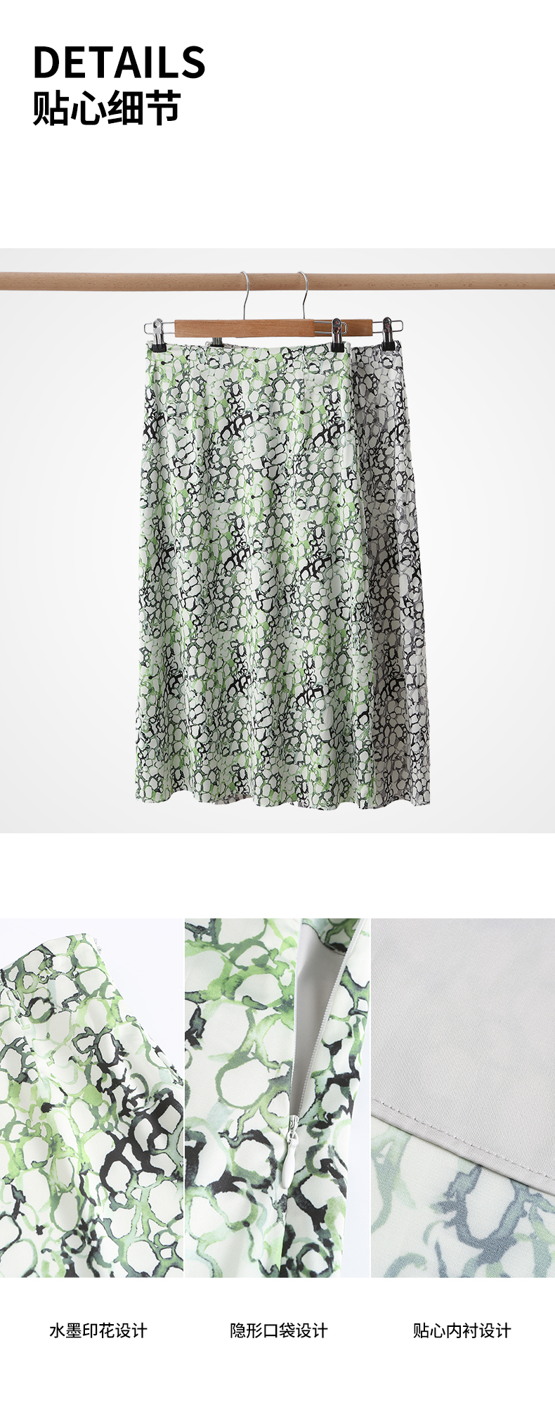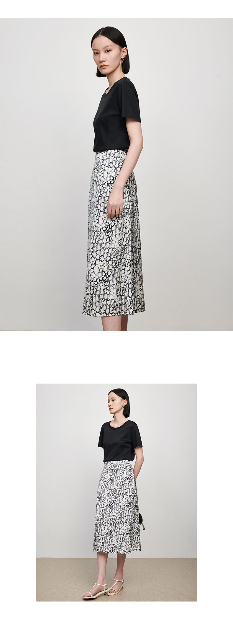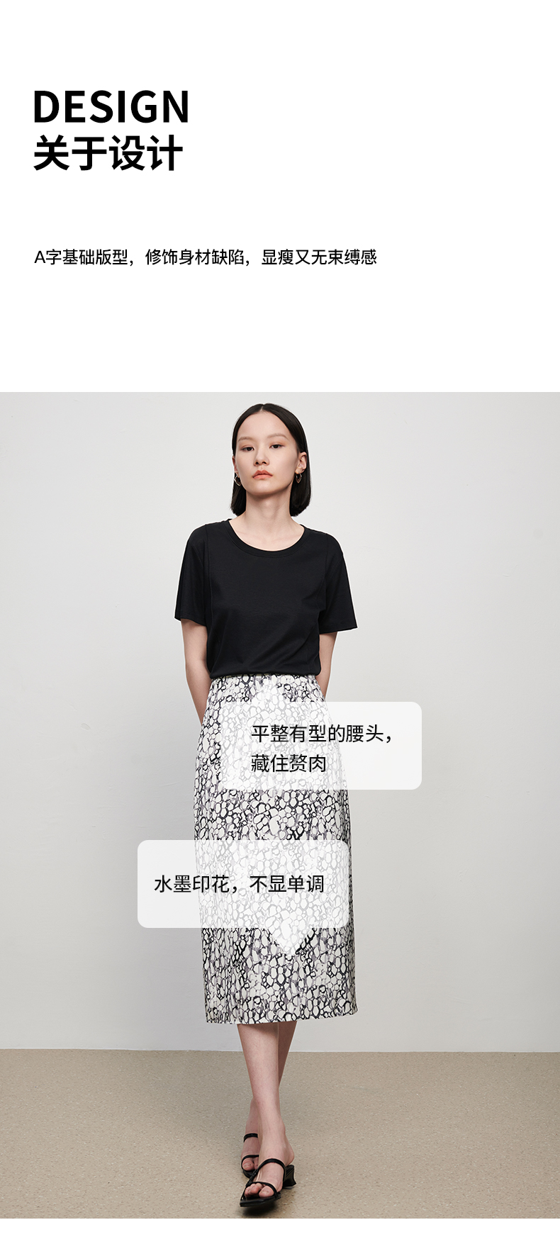 IN AND ON夏季新款女晕染印花丝质高腰通勤时尚A字黑色半身裙21798