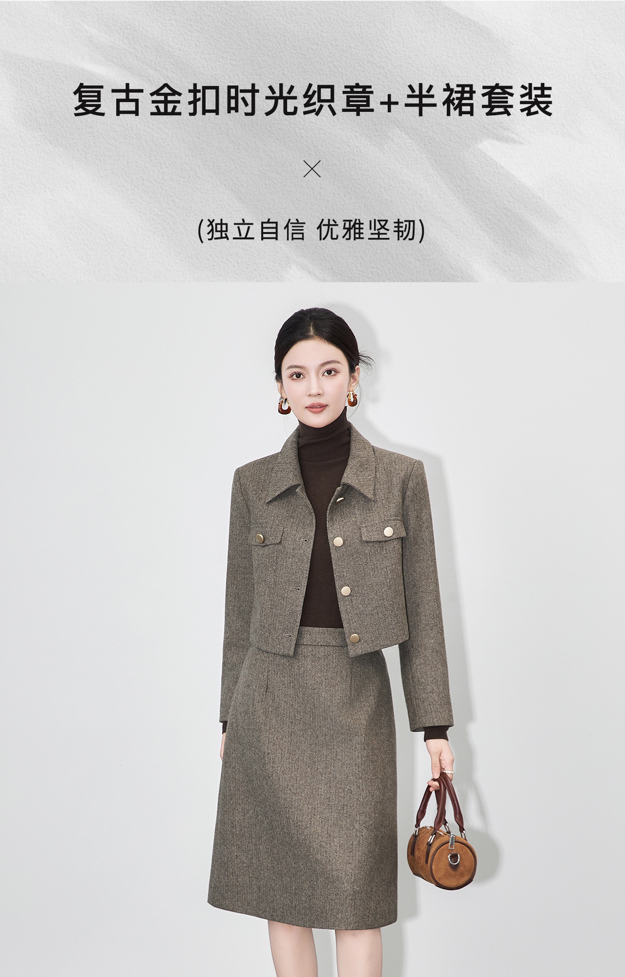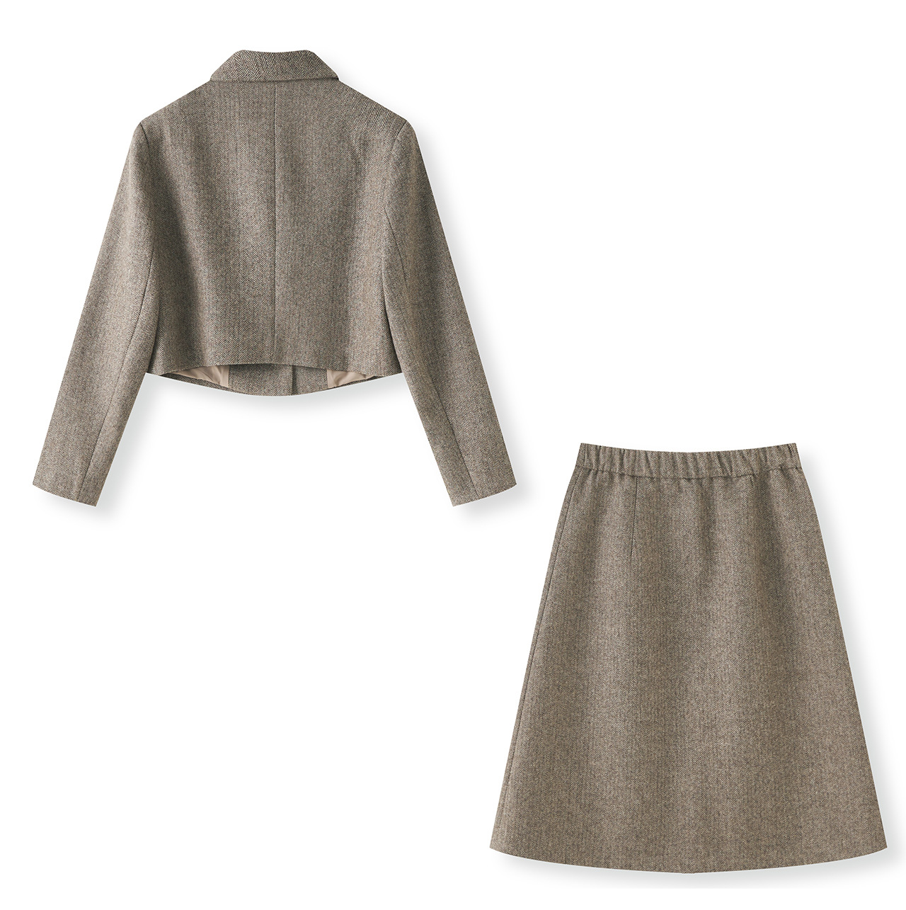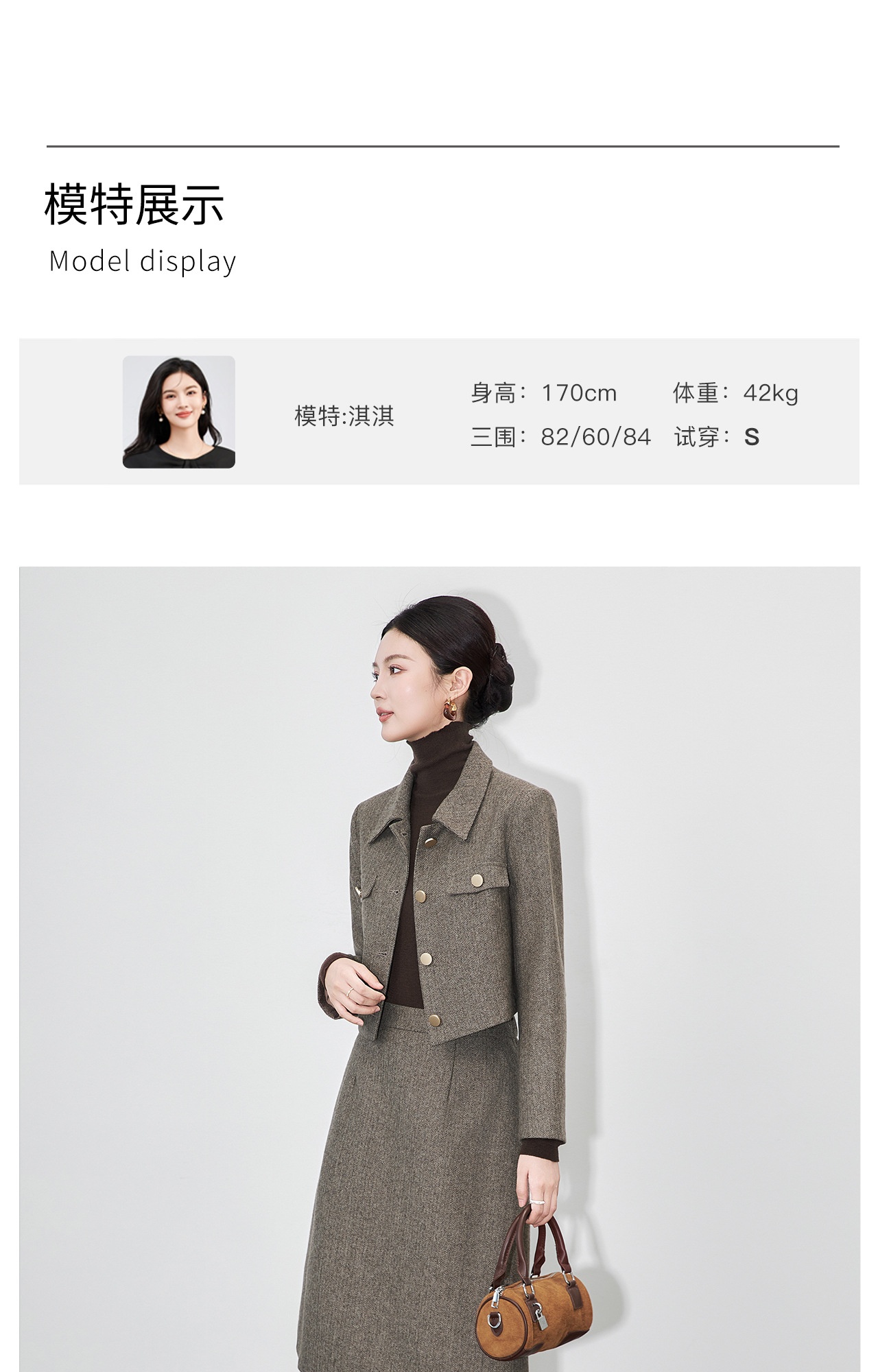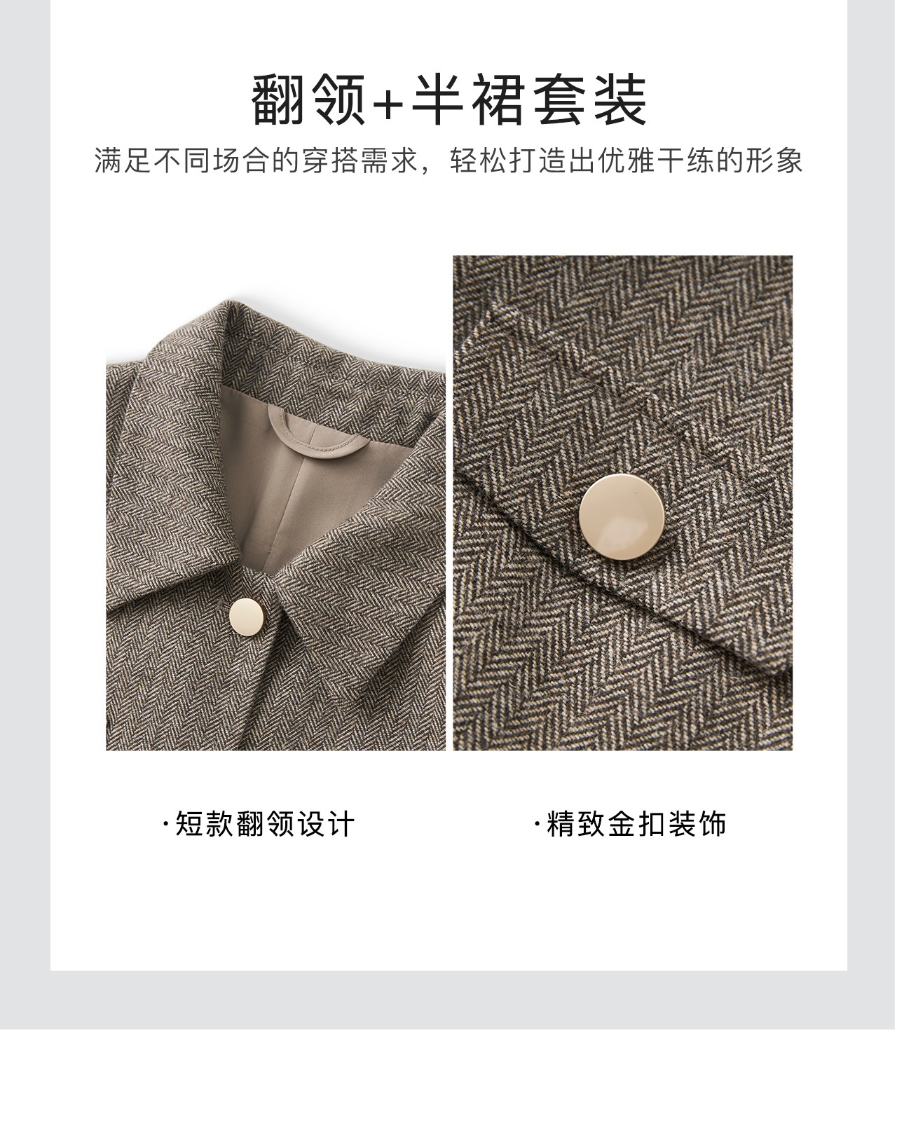 「高货wl」全新升级【铂金会员441/天猫599/差价158】(99910)洛诗琳法式小香风人字纹毛呢短外套高腰A字半身裙两件套