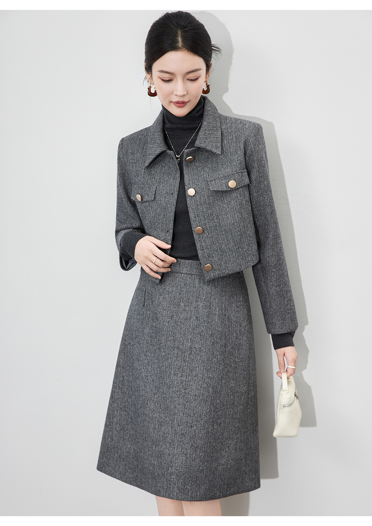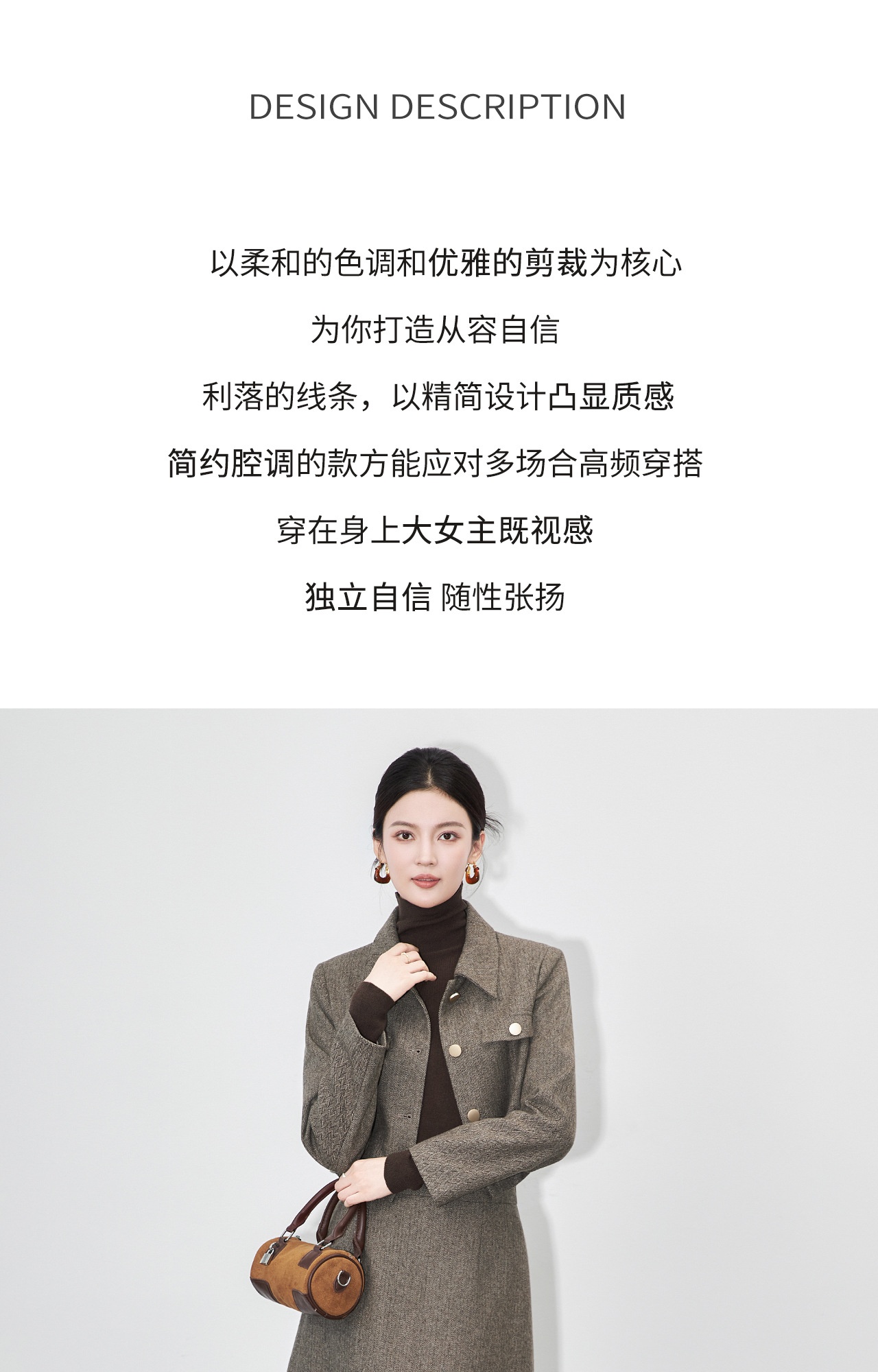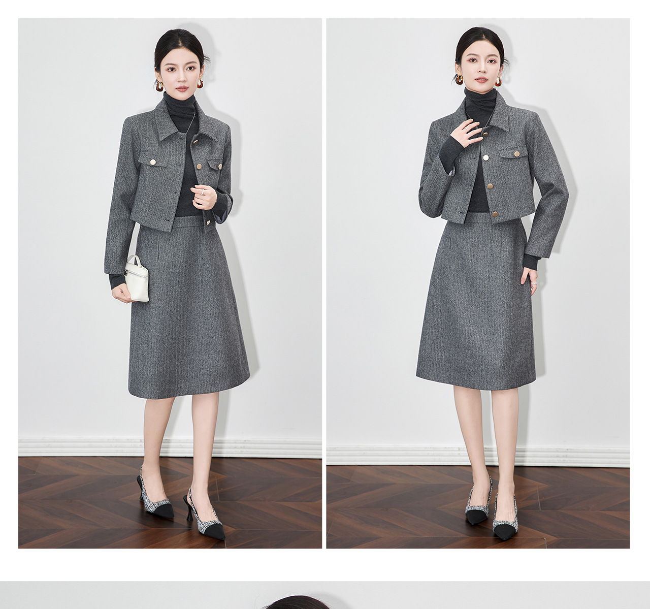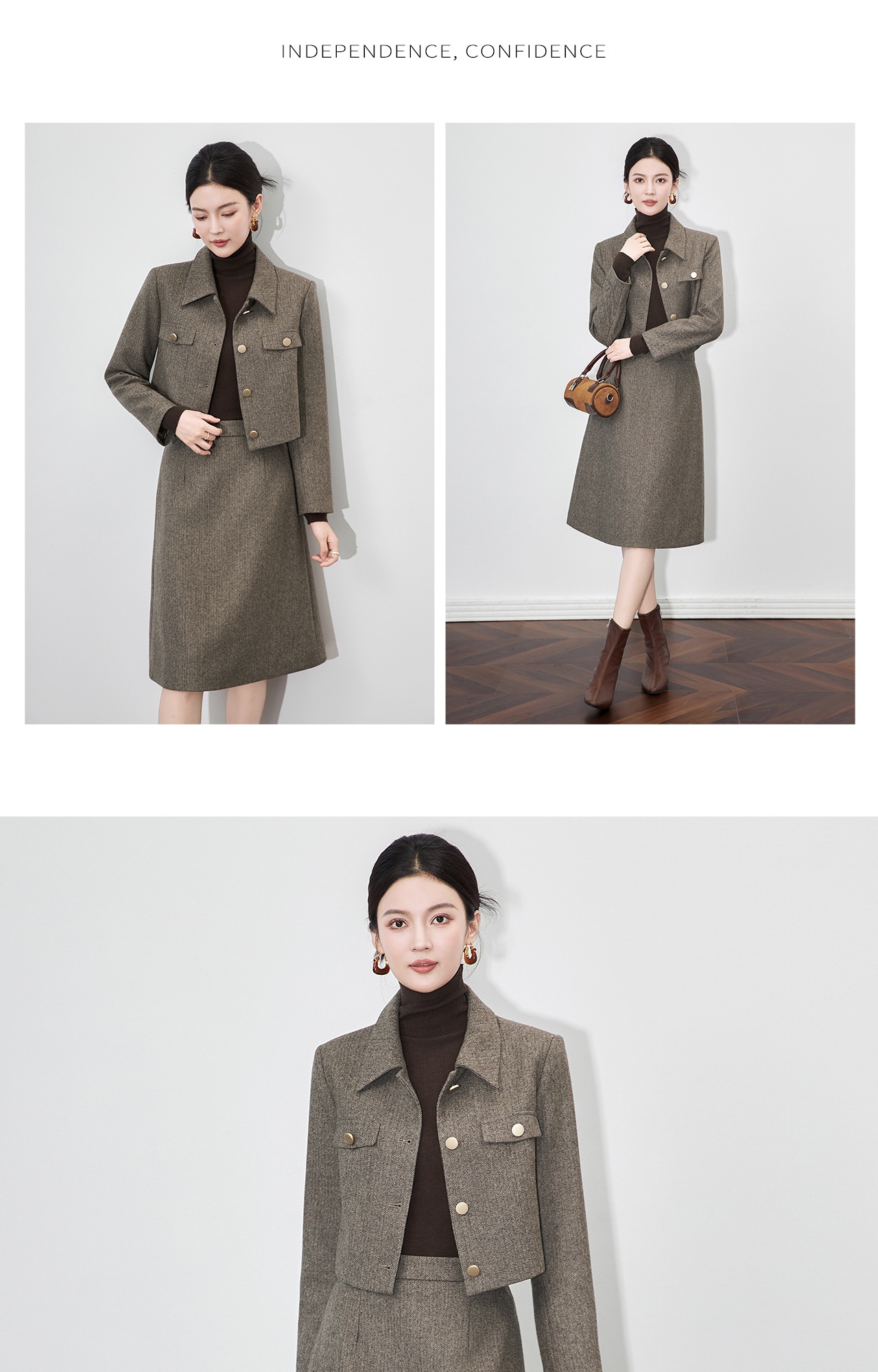 「高货wl」全新升级【铂金会员441/天猫599/差价158】(99910)洛诗琳法式小香风人字纹毛呢短外套高腰A字半身裙两件套