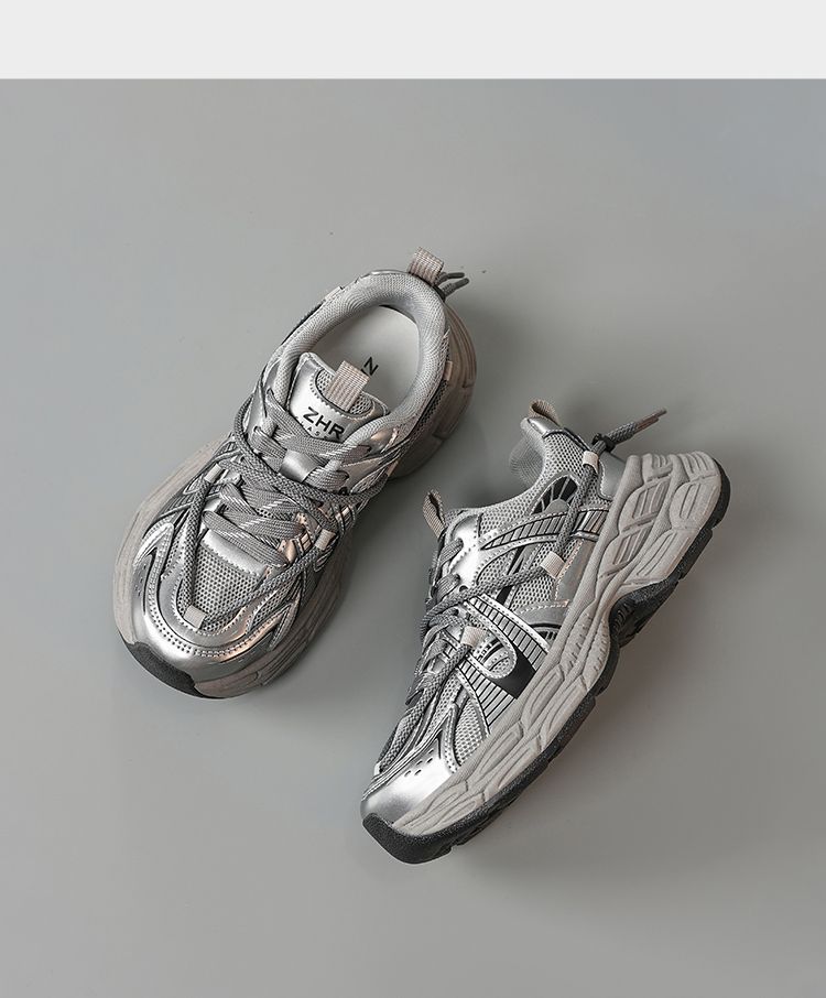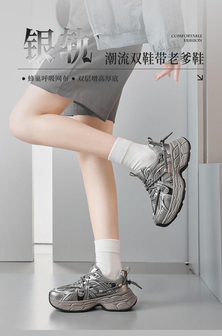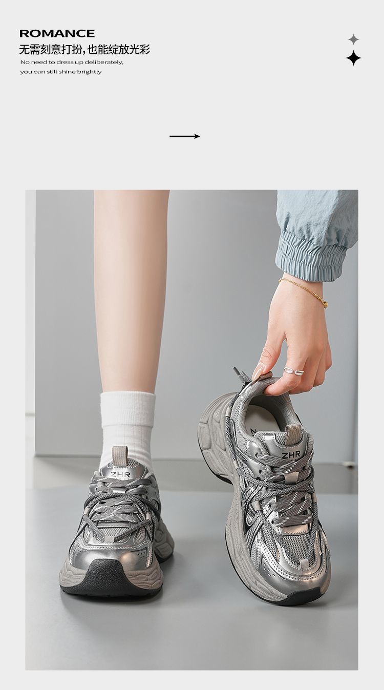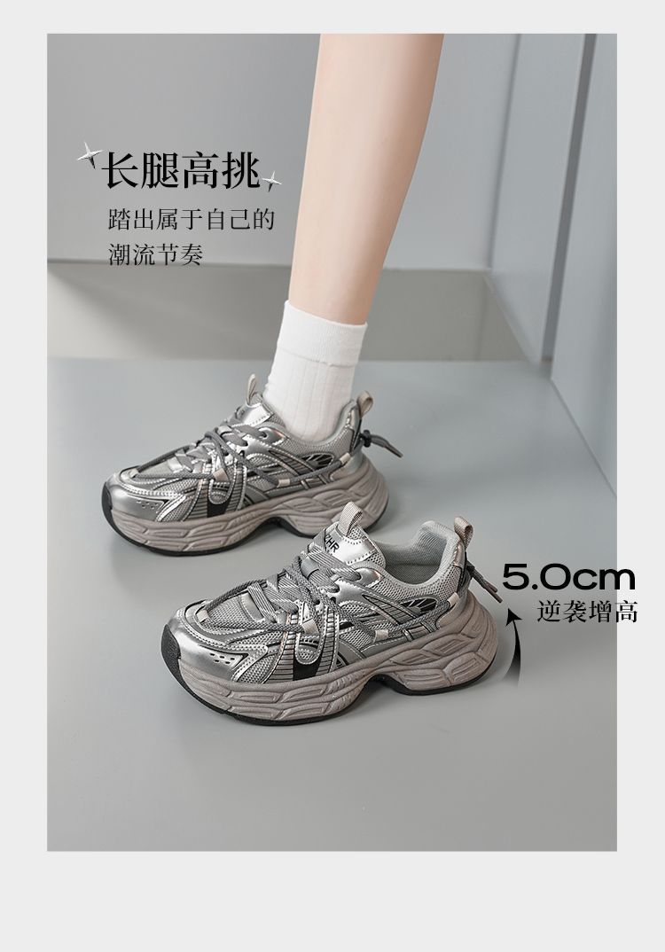ZHR【增高5cm】银色厚底老爹鞋女2025秋季网面透气轻便运动休闲鞋