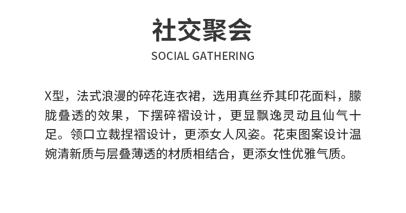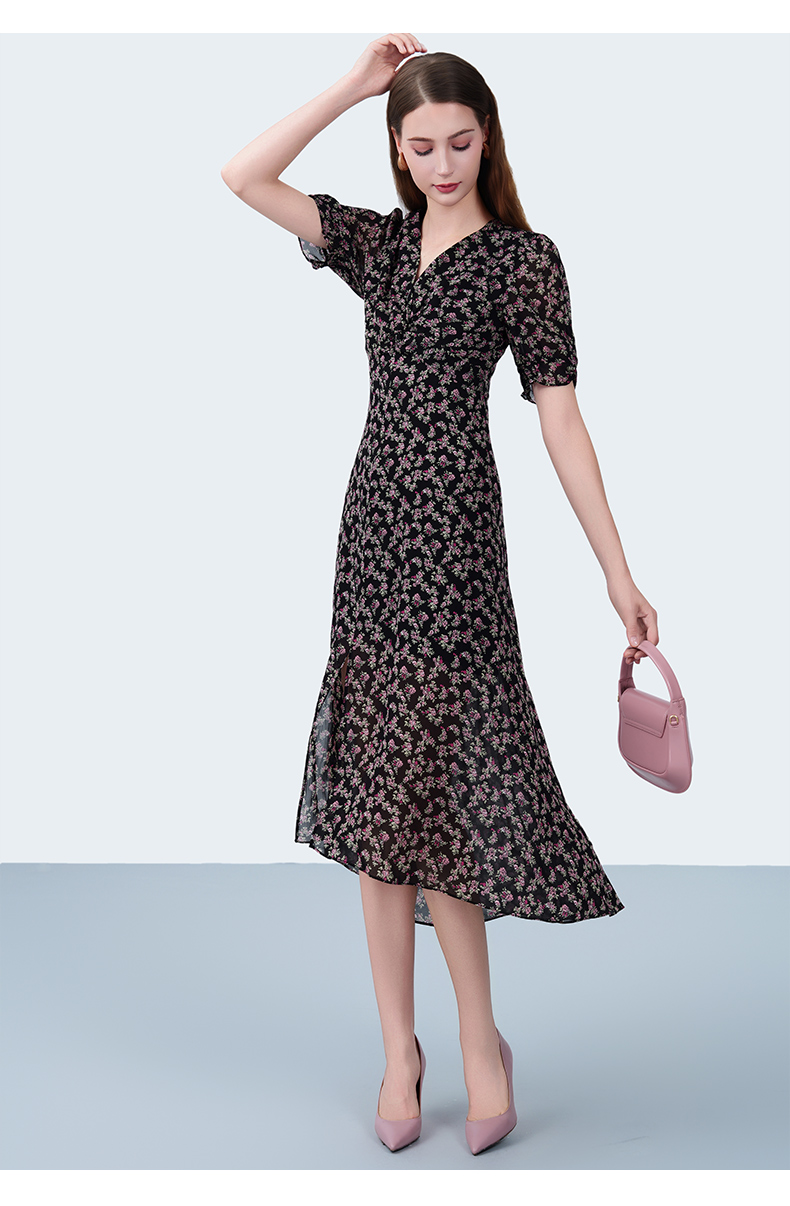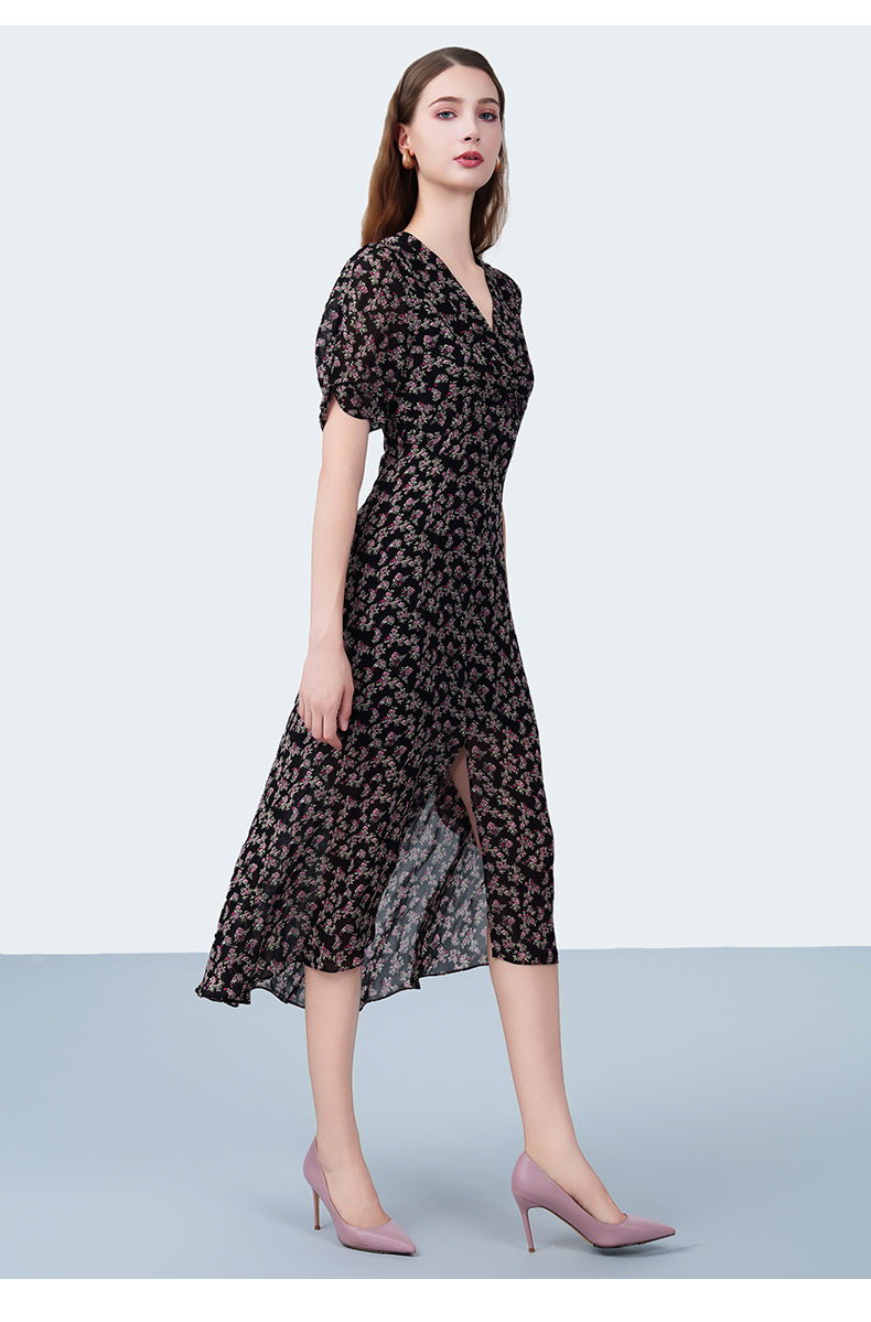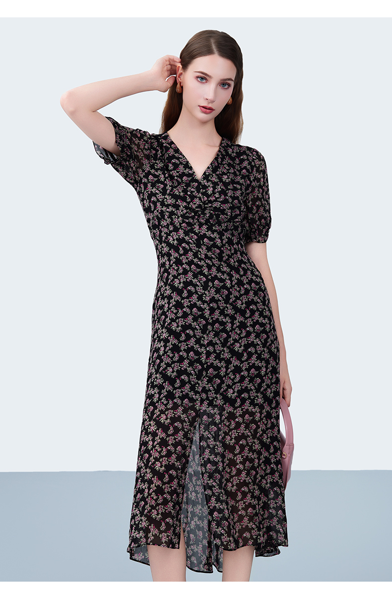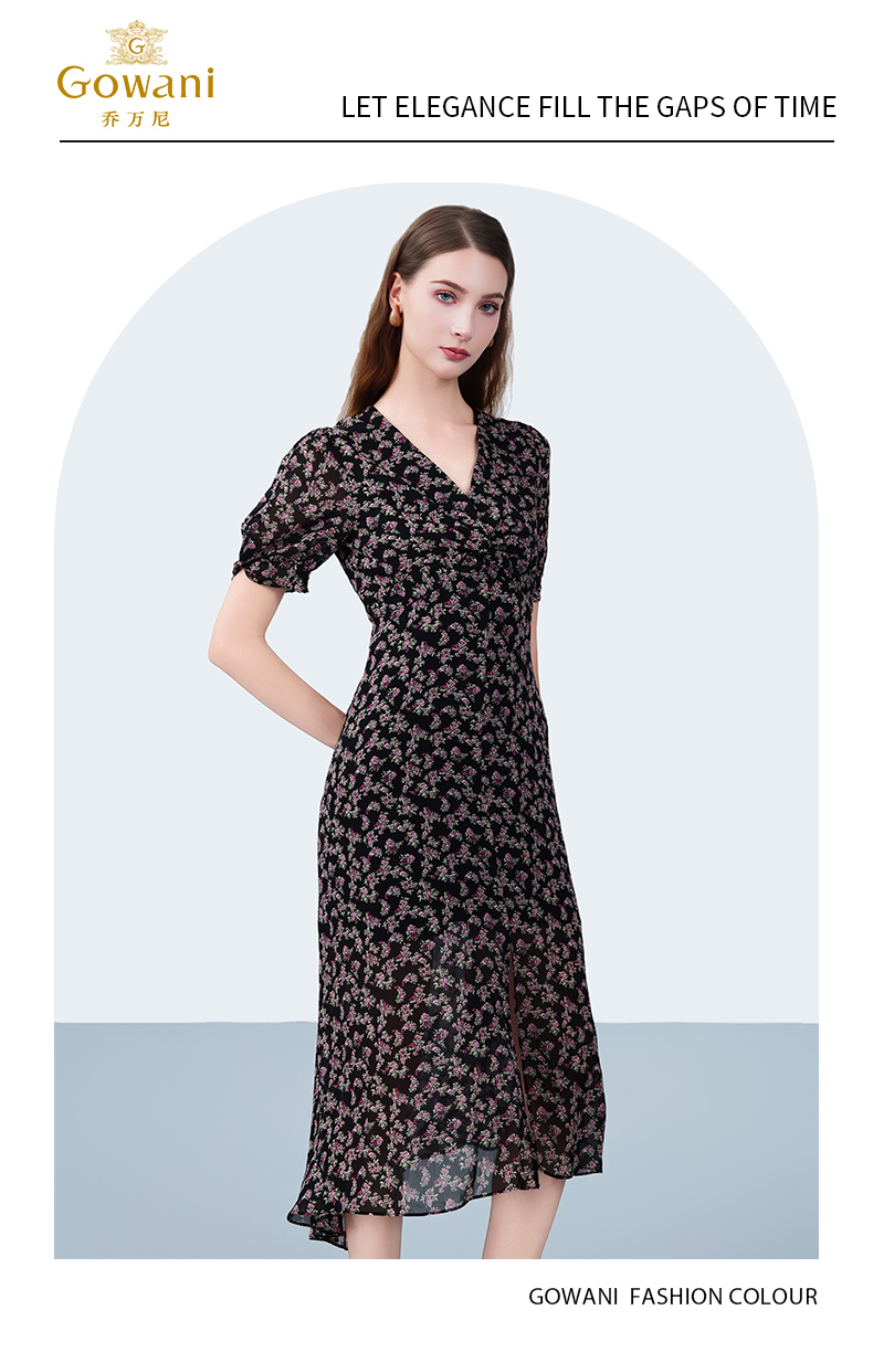 乔万尼新品浪漫法式V领前开叉碎花100%真丝连衣裙ED2E517