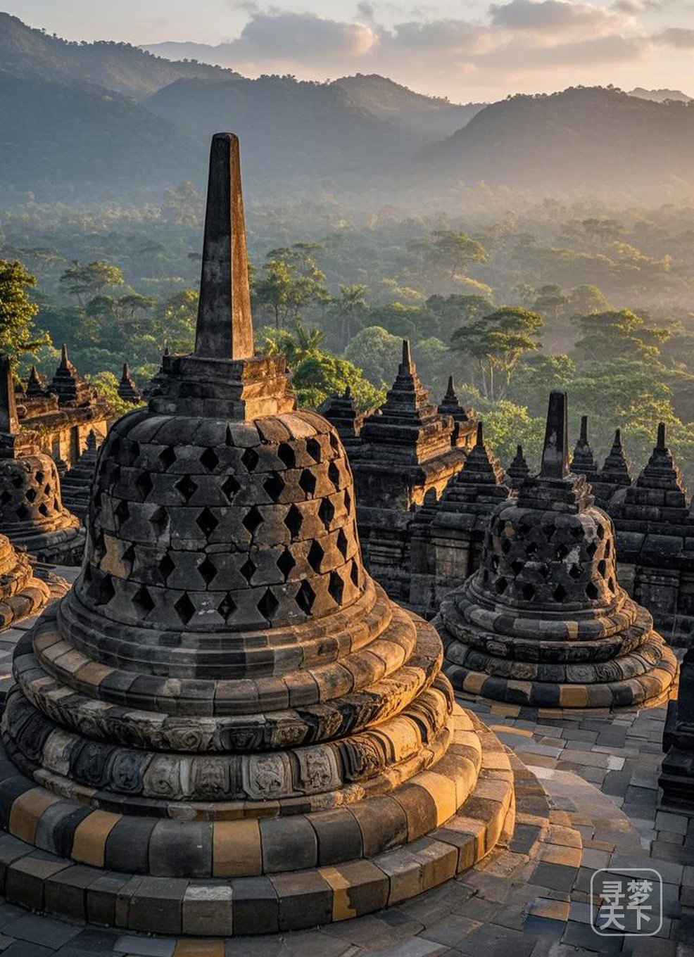 清晨的佛塔薄雾笼罩,四周的密林神秘静谧。