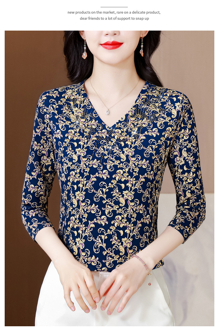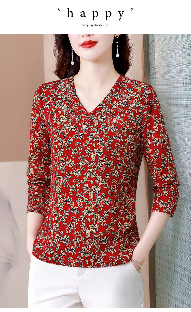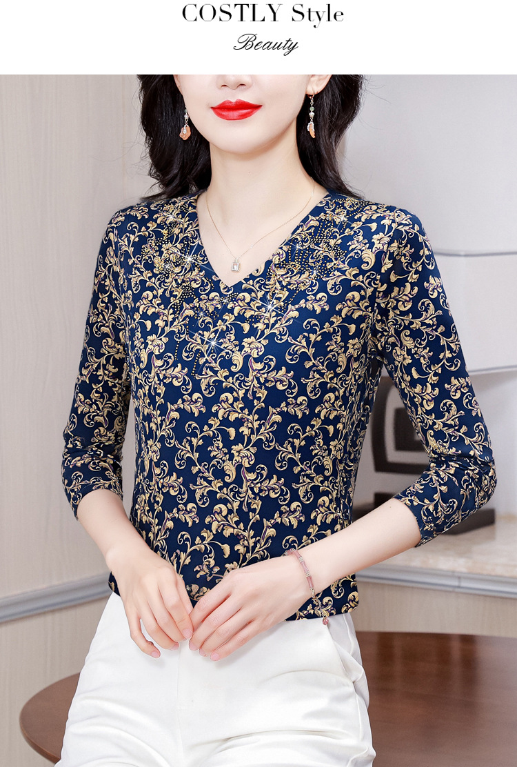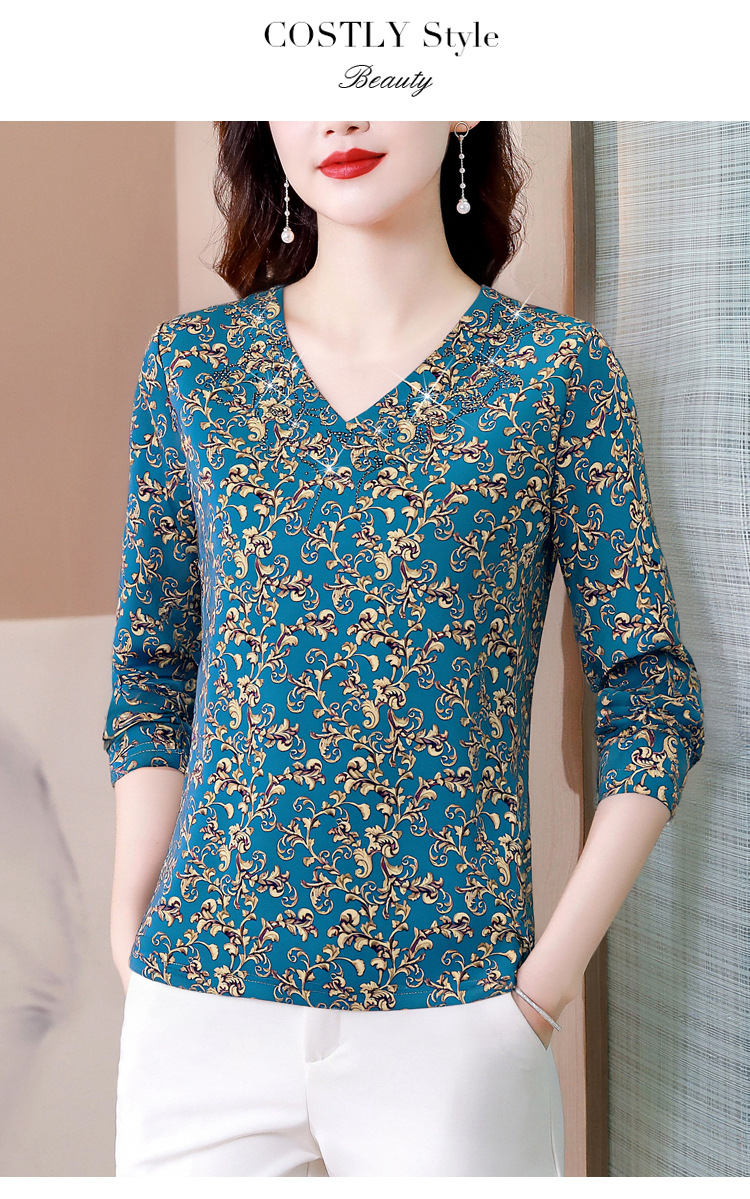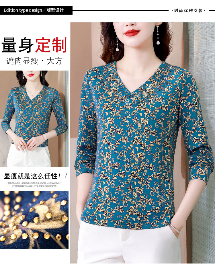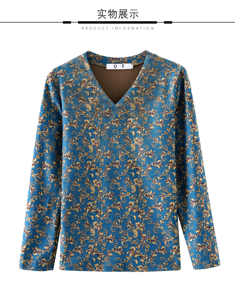 KQL 356H3006长袖V领时尚烫钻花色上衣气质妈妈装