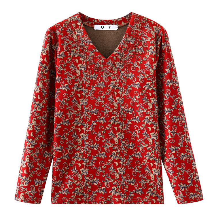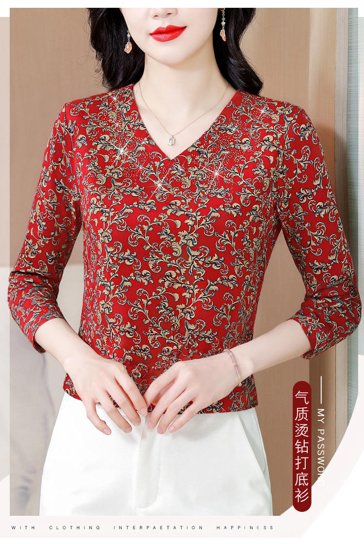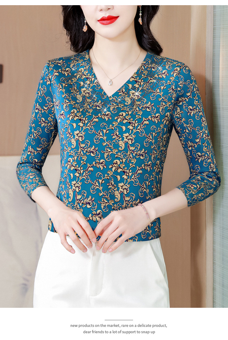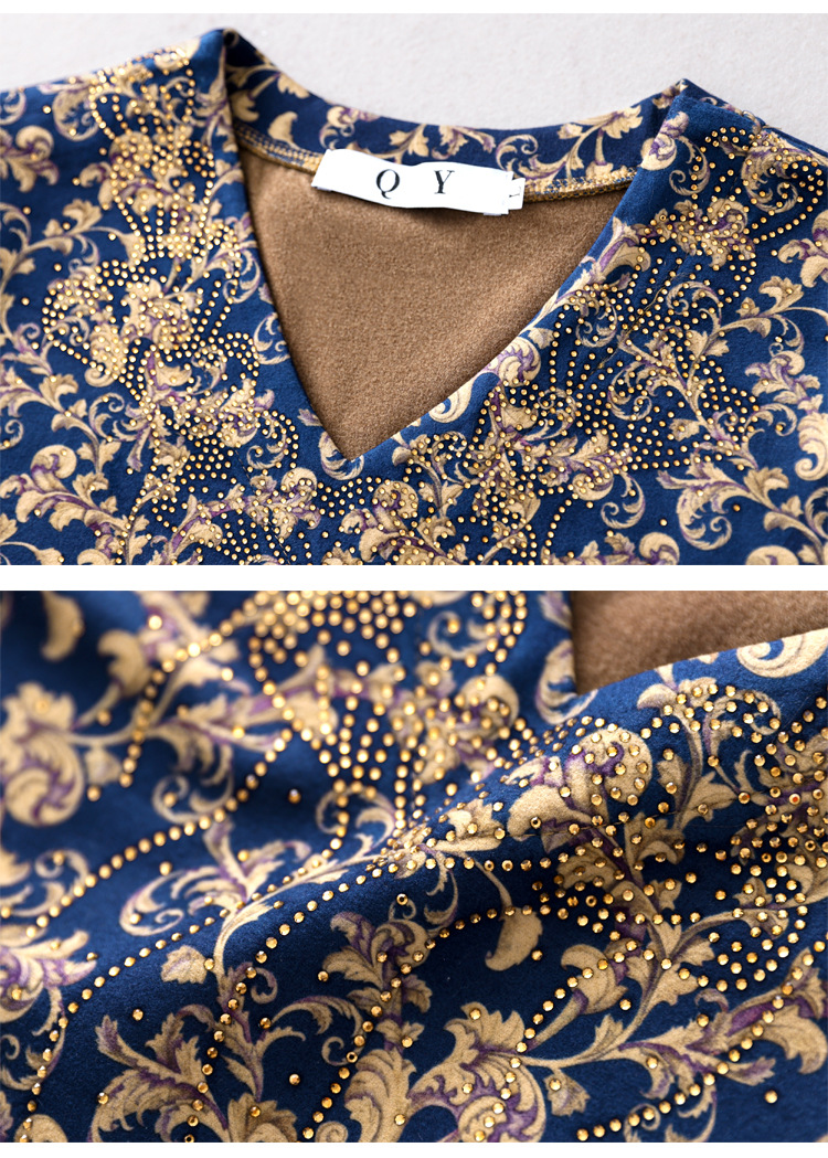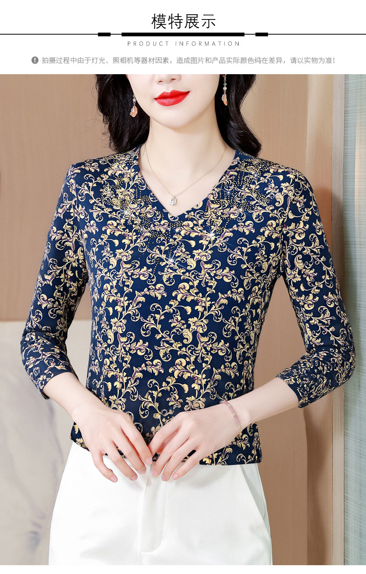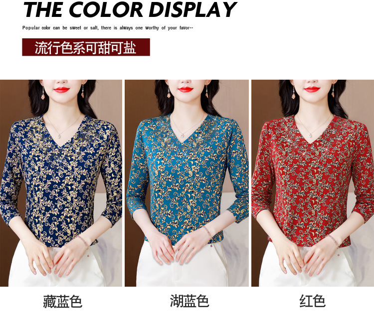 KQL 356H3006长袖V领时尚烫钻花色上衣气质妈妈装