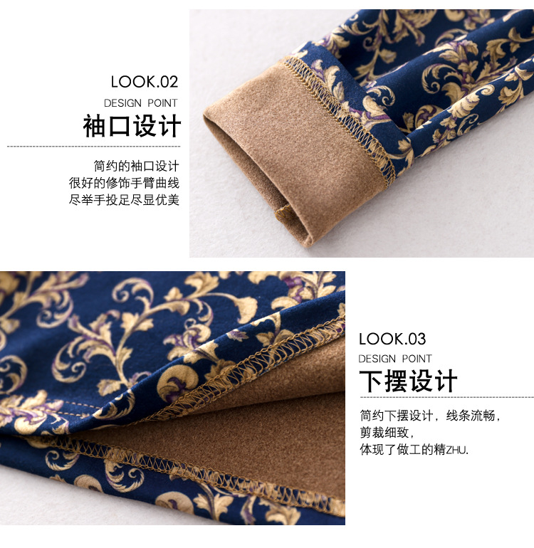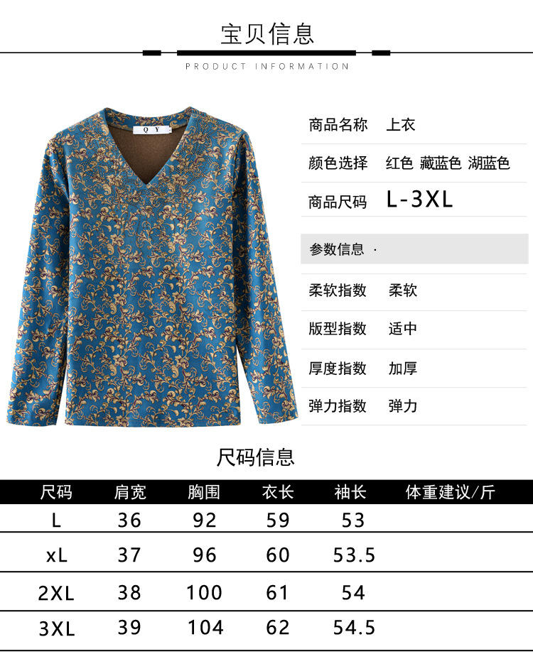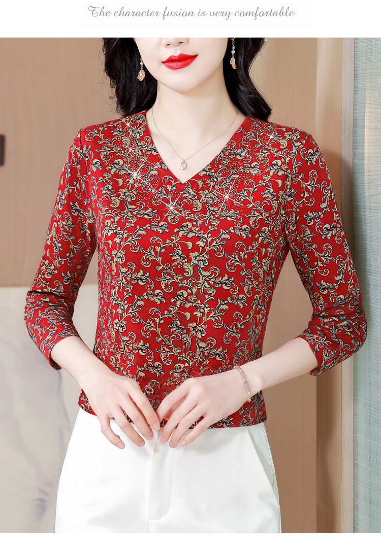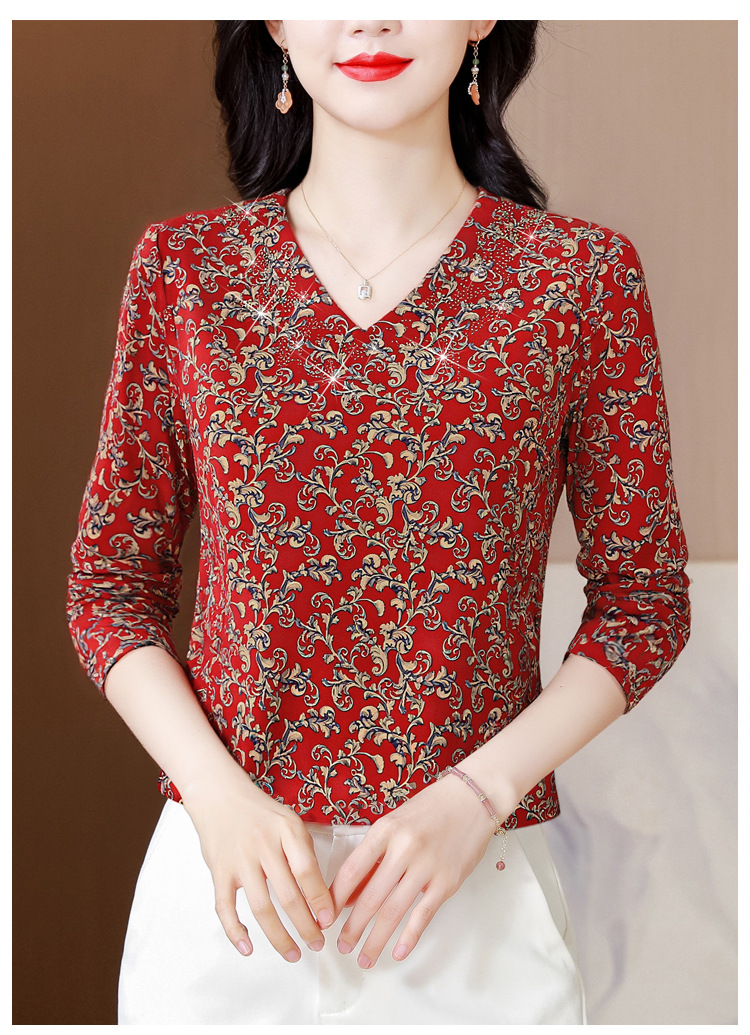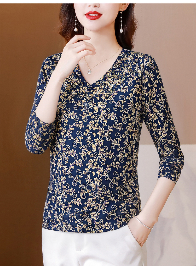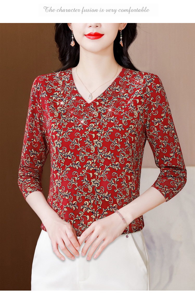 KQL 356H3006长袖V领时尚烫钻花色上衣气质妈妈装
