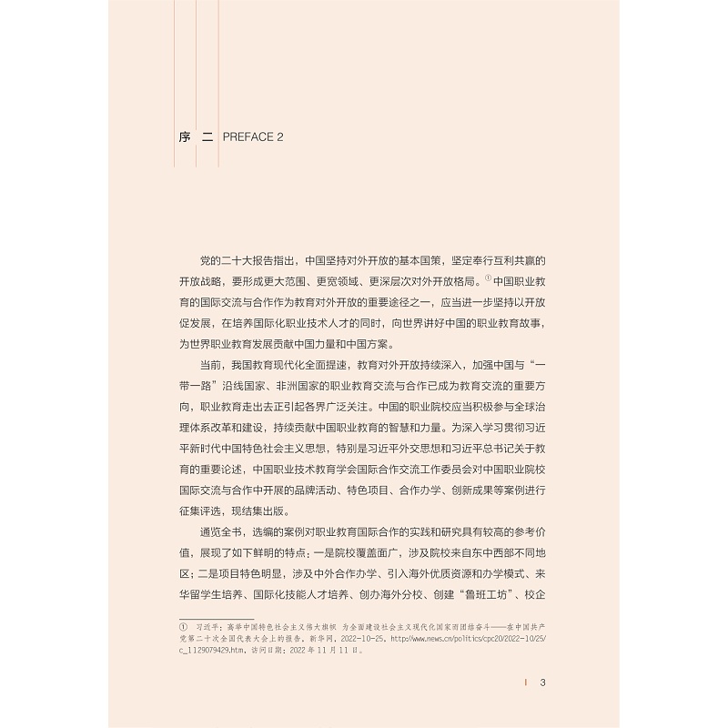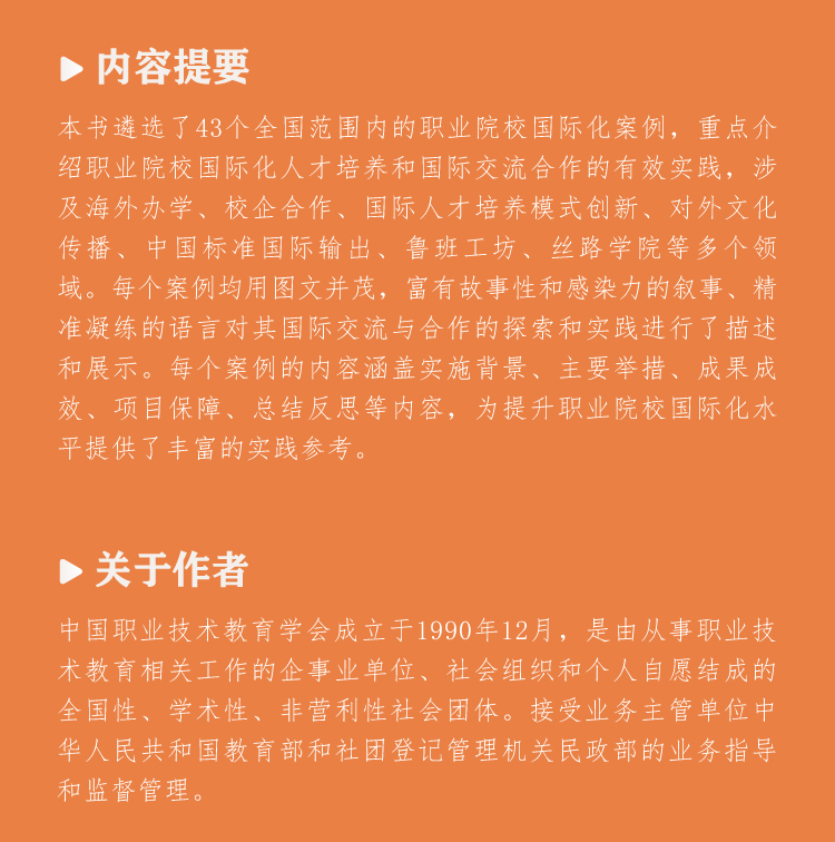 本书遴选了43个全国范围内的职业院校国际化案例,重点介绍职业院校国际化人才培养和国际交流合作的有效实践,涉及海外办学、校企合作、国际人才培养模式创新、对外文化传播、中国标准国际输出、鲁班工坊、丝路学院等多个领域。每个案例均用图文并茂,富有故事性和感染力的叙事、精准凝练的语言对其国际交流与合作的探索和实践进行了描述和展示。每个案例的内容涵盖实施背景、主要举措、成果成效、项目保障、总结反思等内容,为提升职业院校国际化水平提供了丰富的实践参考。