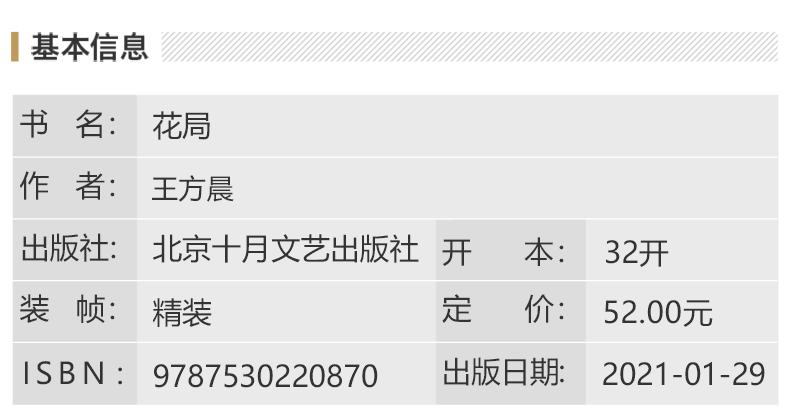 长篇小说《花局》是知名作家王方晨的长篇新作。描写发生在所谓“花局”的令人啼笑皆非、匪夷所思的故事,故事背后蕴含深意。