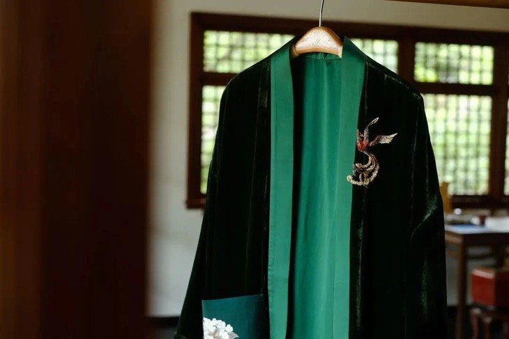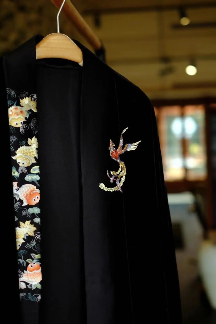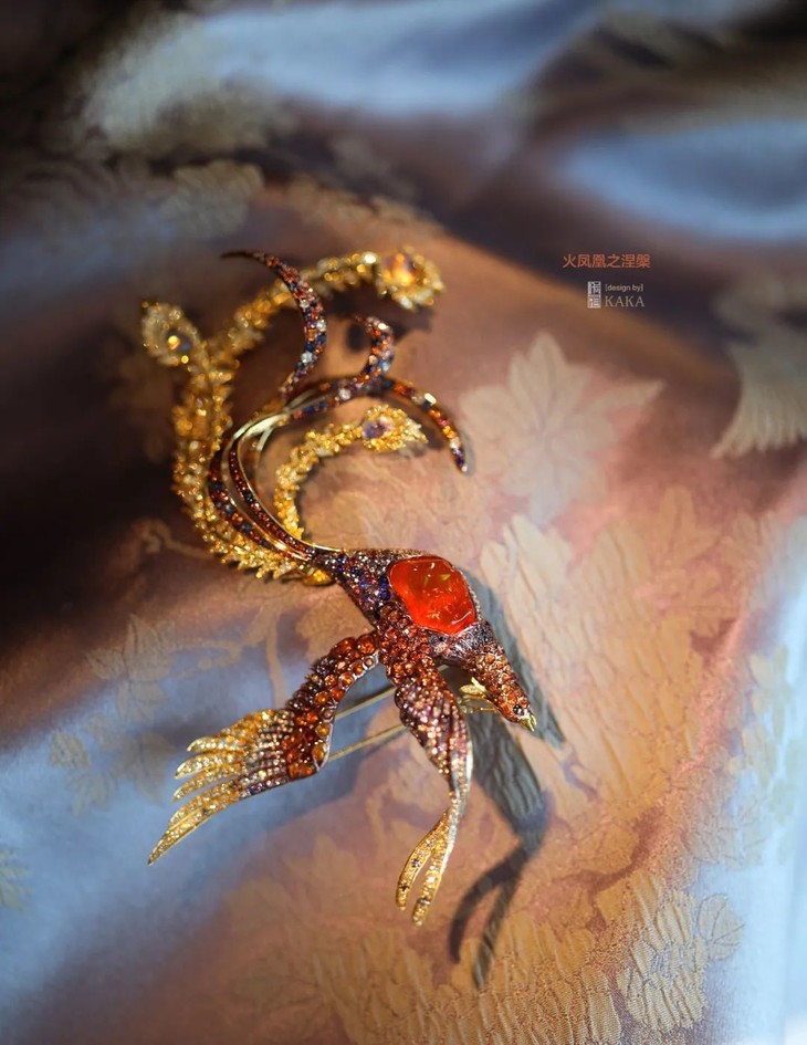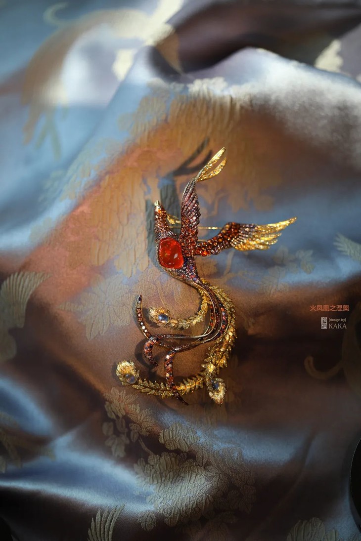 五色斑斓的羽毛,为“德,义,礼,仁,信”五字之化身,火凤凰,涅槃,在宇宙间,一切业力相抵,不拖不欠,到达极乐彼岸。在传统凤凰造型的团纹里突破,做一只更有力度的凤凰,
