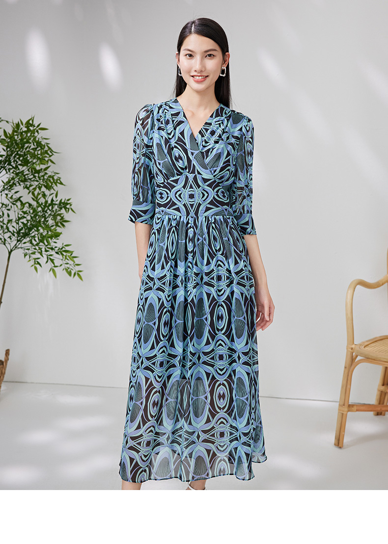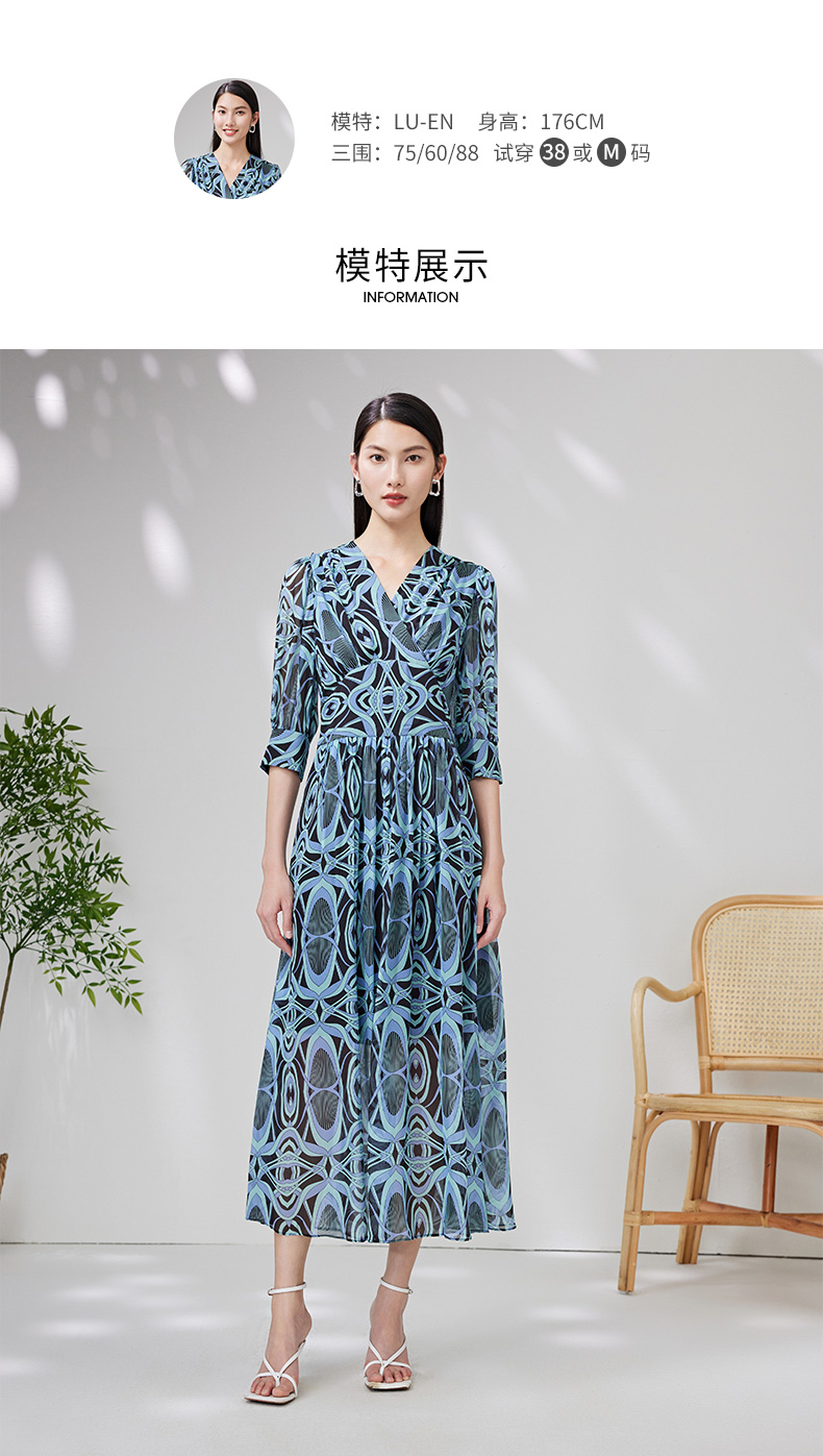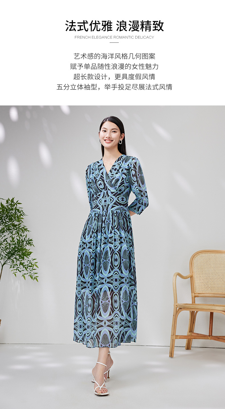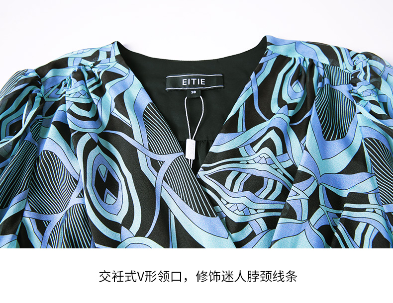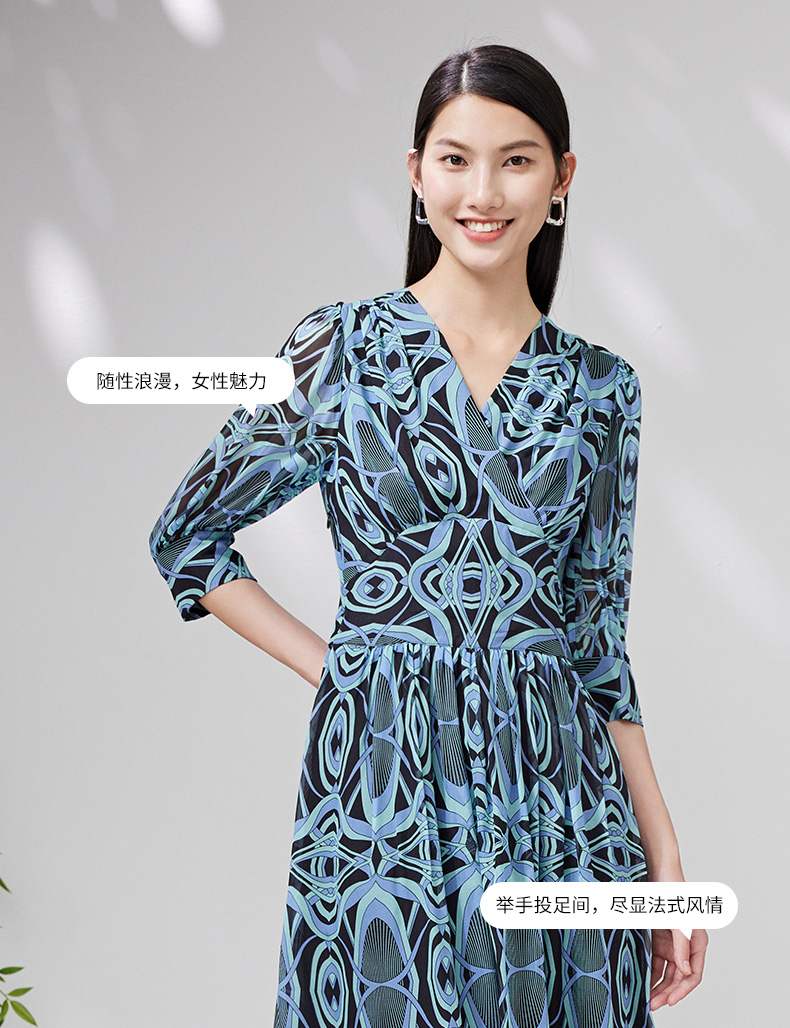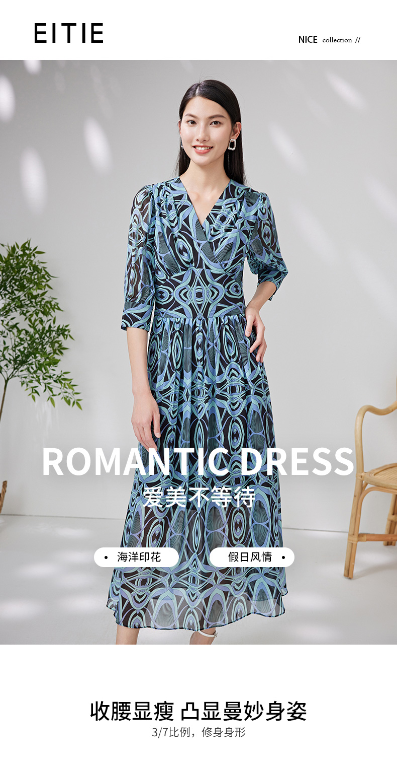 EITIE爱特爱春季新款修身复古印花V领蕾丝拼接五分袖长裙连衣裙女7007730