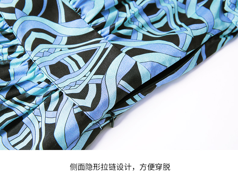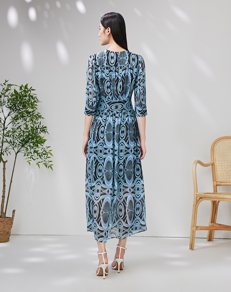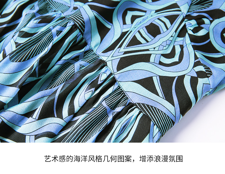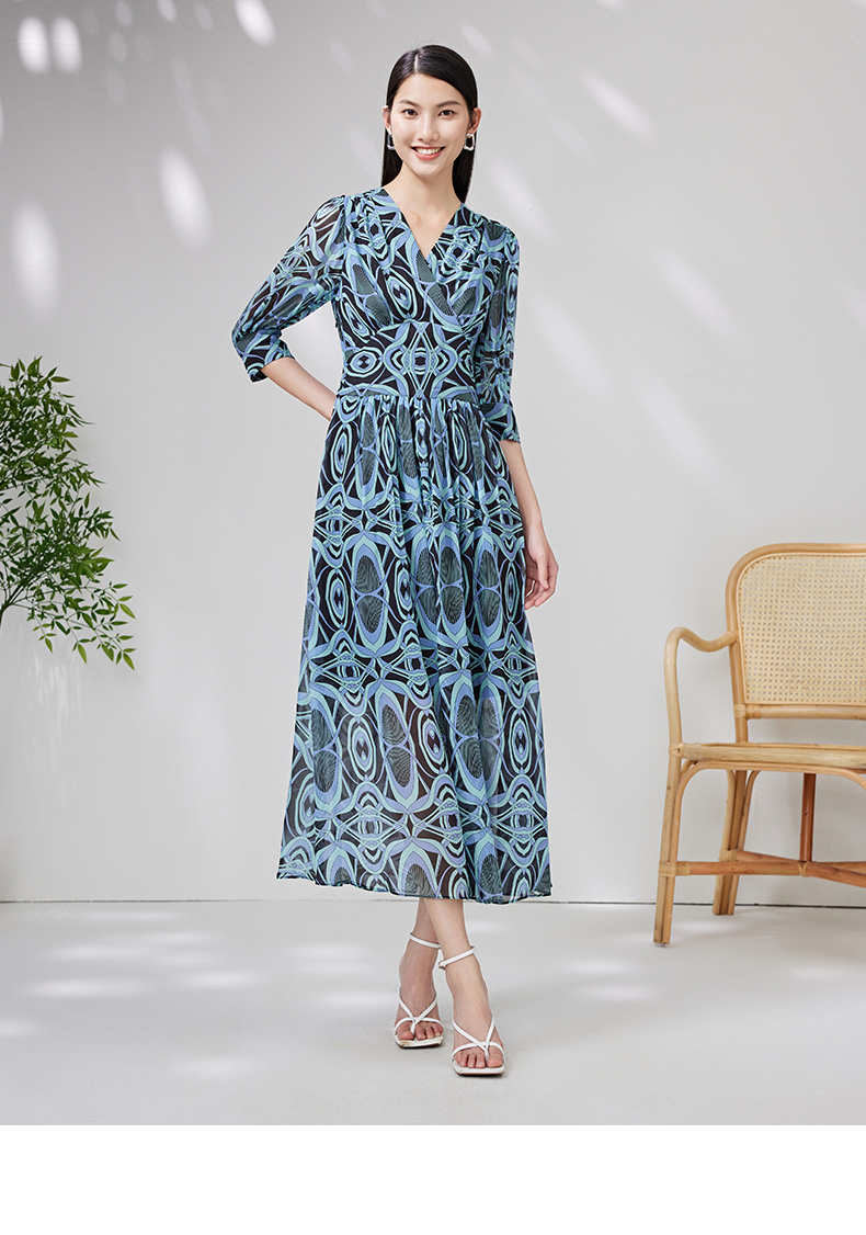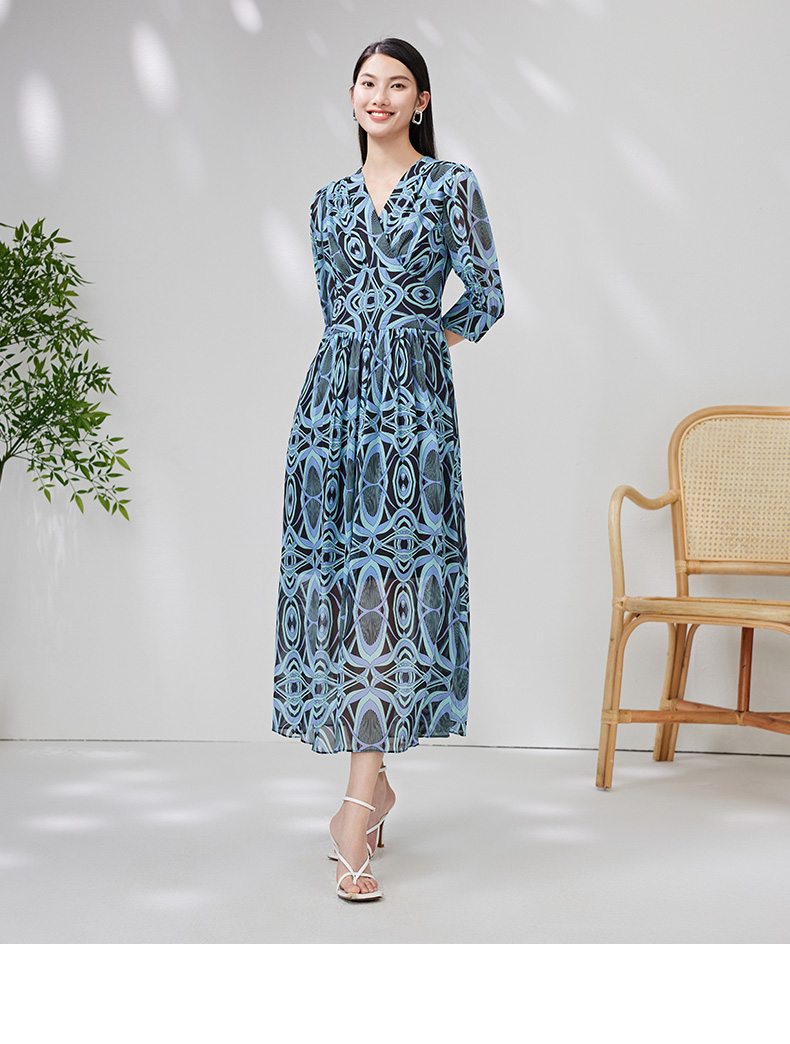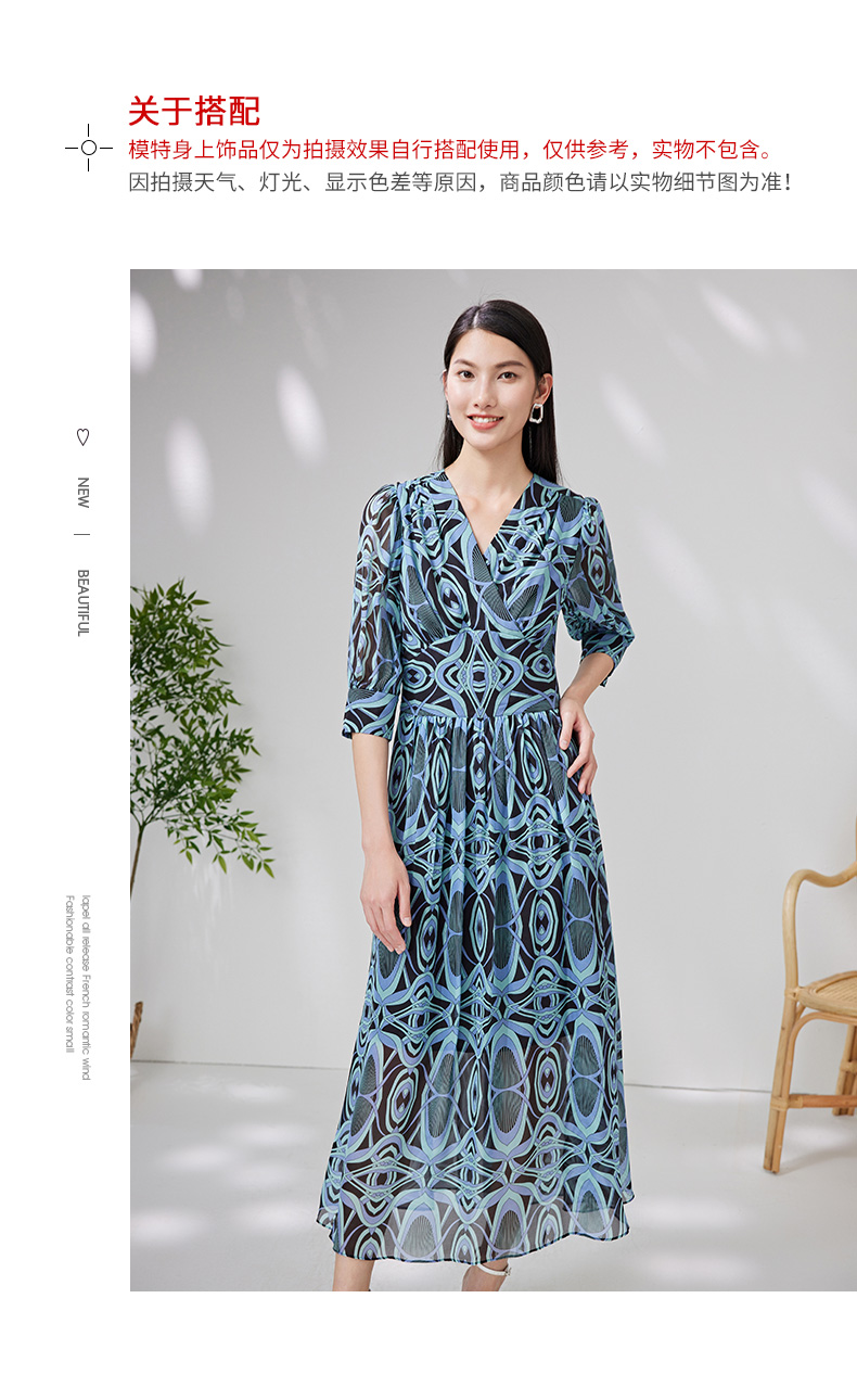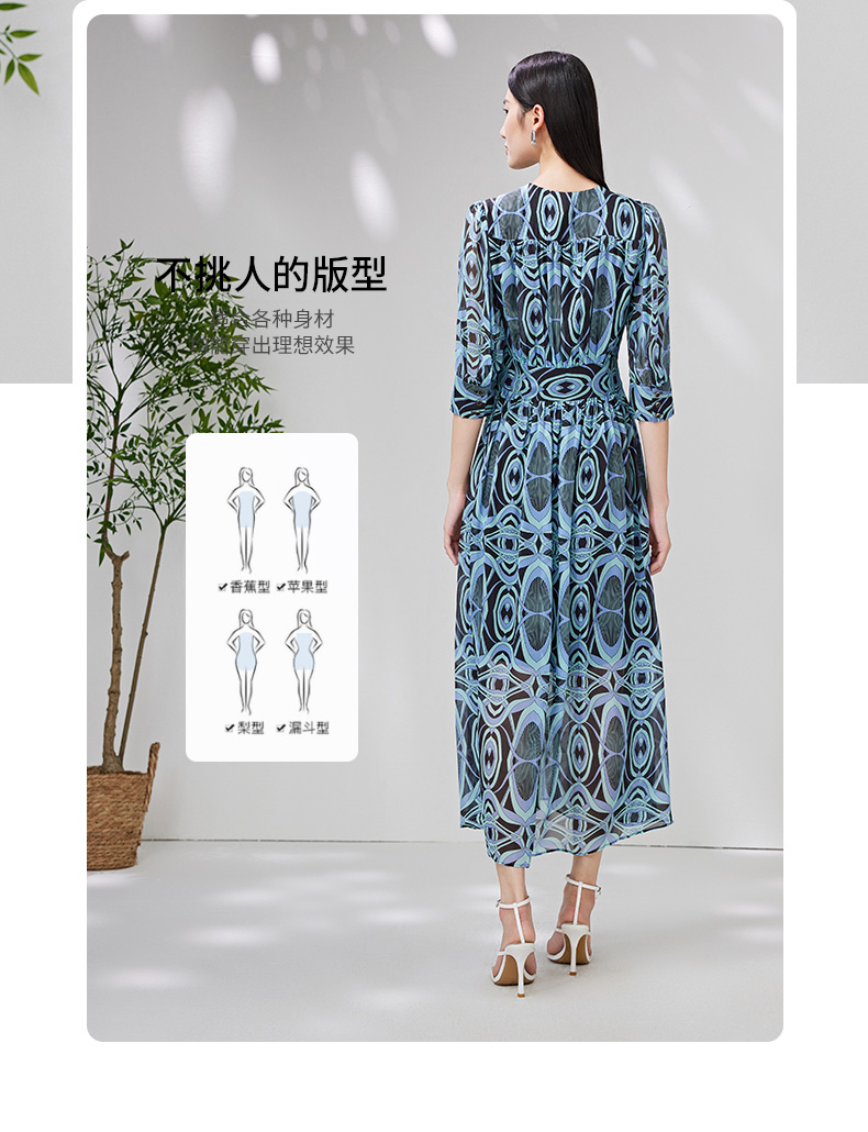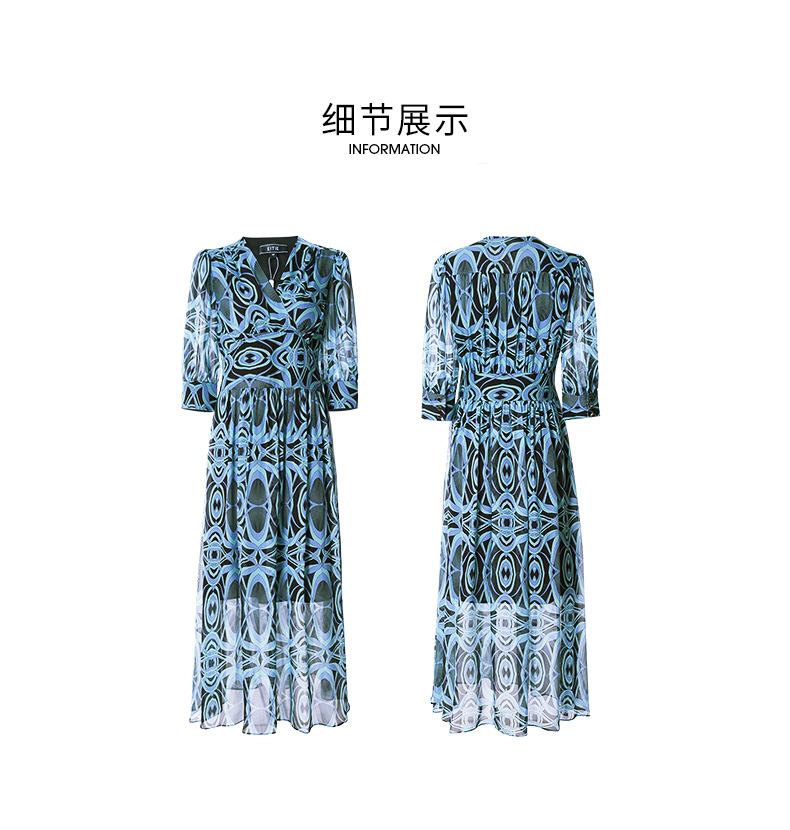 EITIE爱特爱春季新款修身复古印花V领蕾丝拼接五分袖长裙连衣裙女7007730