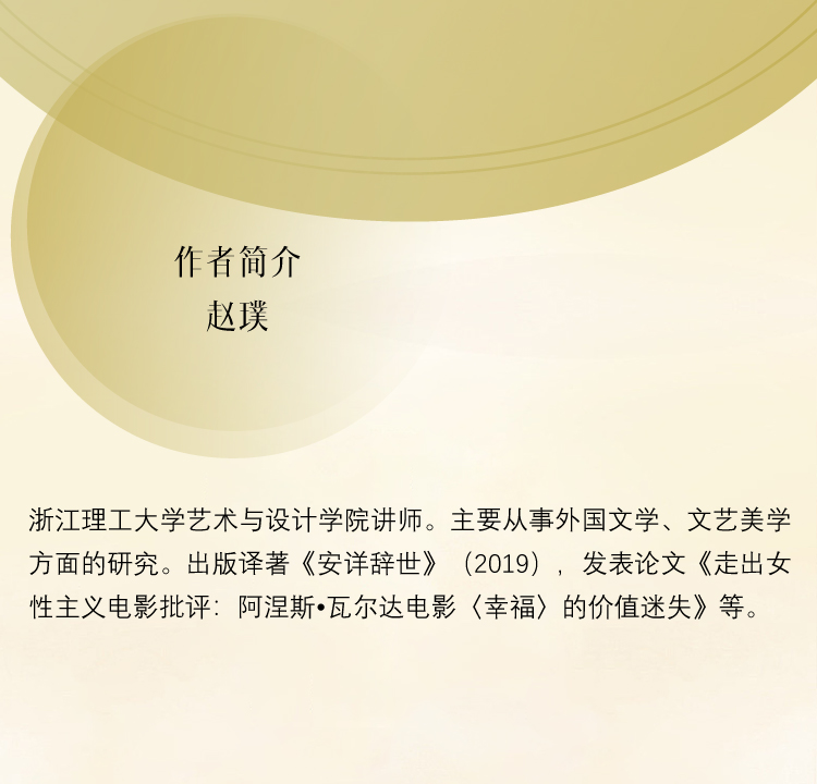 赵璞,浙江理工大学艺术与设计学院讲师。主要从事外国文学、文艺美学方面的研究。出版译著《安详辞世》(2019),发表论文《走出女性主义电影批评:阿涅斯•瓦尔达电影〈幸福〉的价值迷失》等。