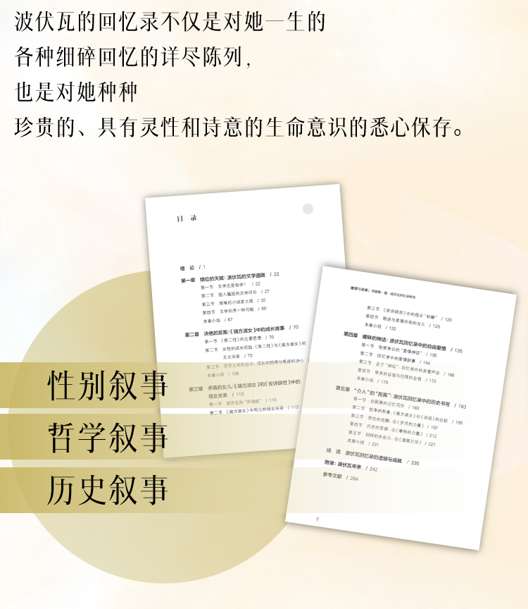 值得注意的是,波伏瓦也是世界文学史上一位重要的回忆录作家。从1956年开始,她几乎全身心地转向个人回忆录的创作,她的回忆录具有很高的历史人文价值,而其规模之巨,投入时间之长,在世界传记文学史上亦是非常罕见的。目前国内学界对波伏瓦回忆录价值的认识尚不充分。本书填补了此项空白,以波伏瓦回忆录为研究对象,从性别叙事、哲学叙事、历史叙事等多个角度揭示其价值。