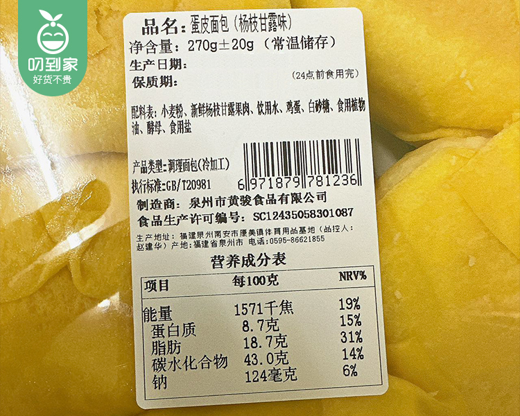 黄骏蛋皮面包(杨枝甘露味)/1盒(5个,约270g) 生产日期:12月28日左右