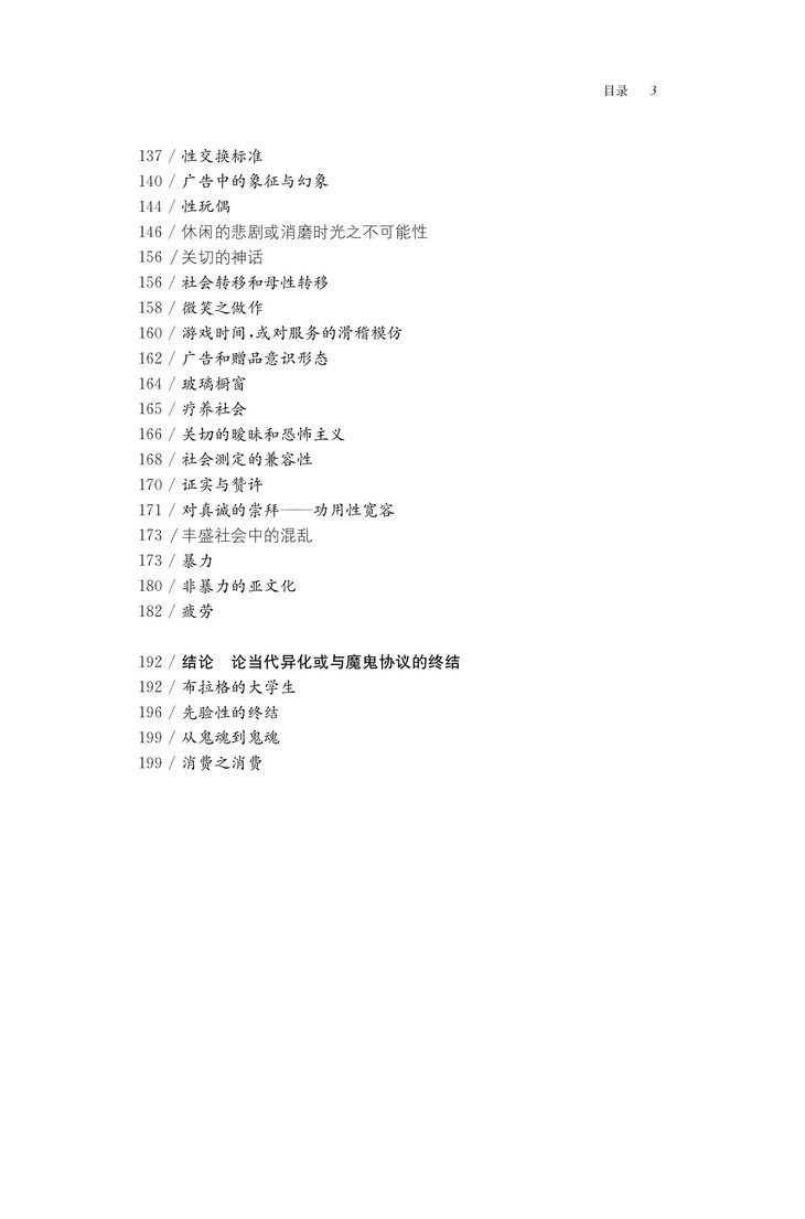 消费是用某种编码及某种与此编码相适应的竞争性合作的、无意识的纪律来驯化他们;这不是通过取消便利,而相反是让他们进入游戏规则。这样,消费才能只身取代一切意识形态,并同时只身担负起使整个社会一体化的重任,就像原始社会的等级或宗教礼仪所做到的那样。