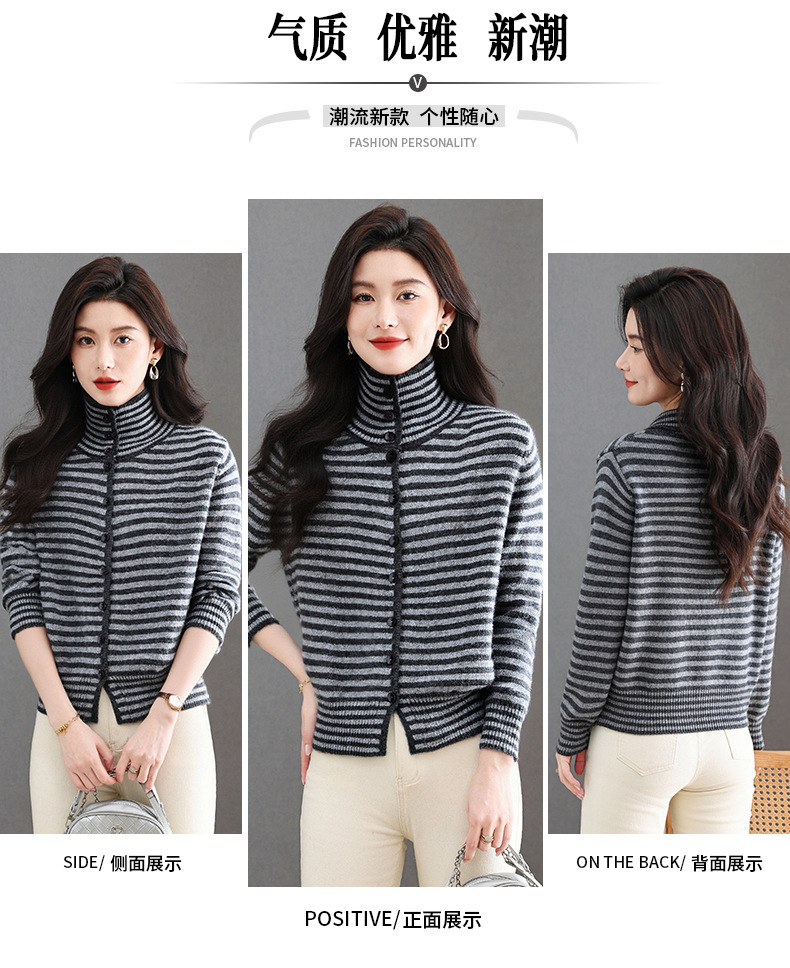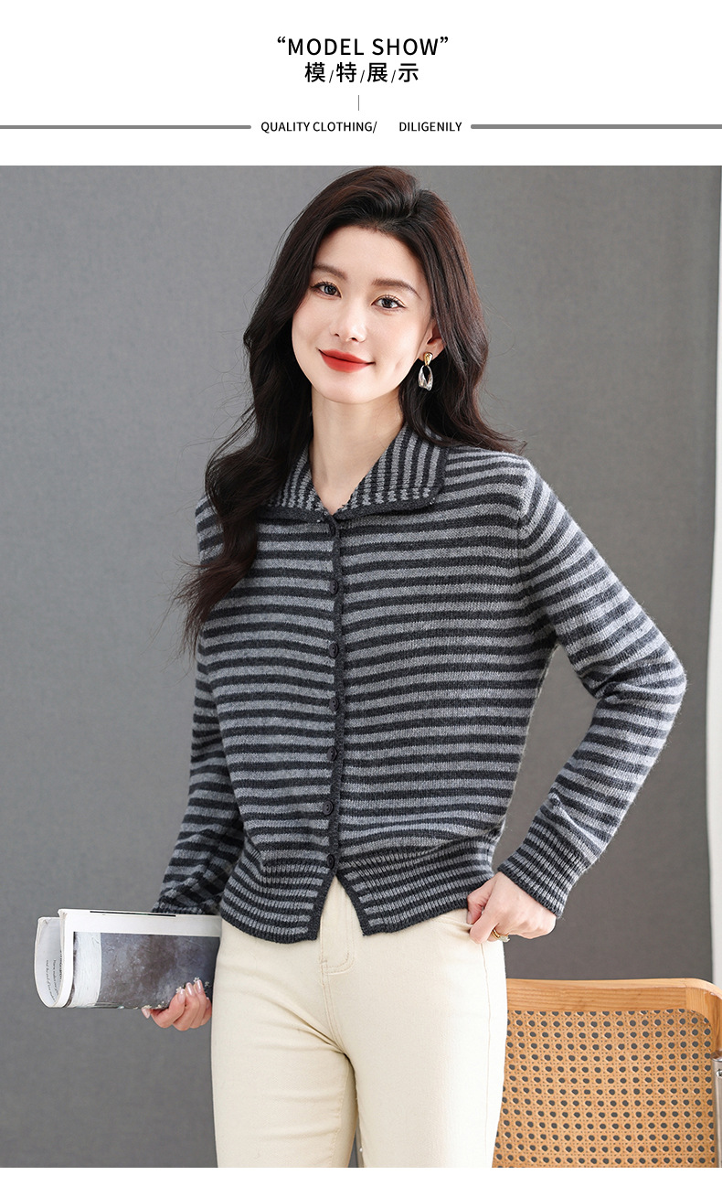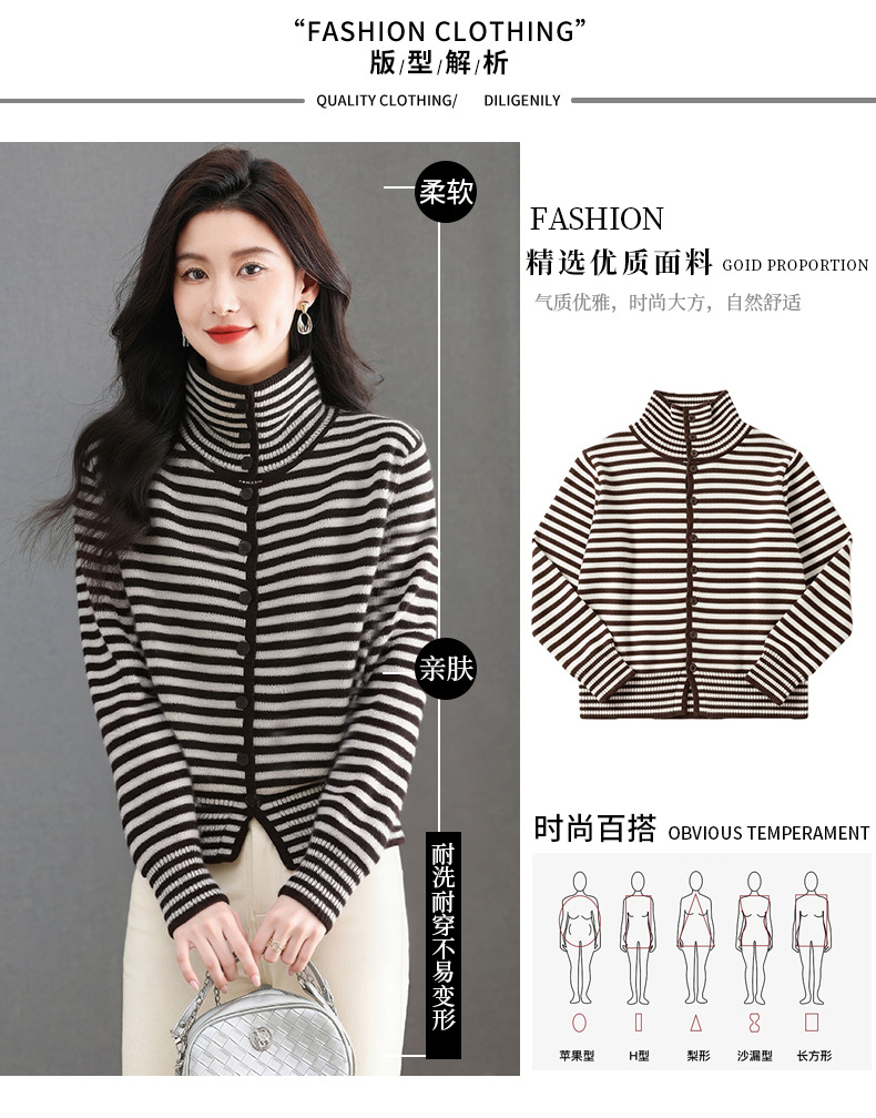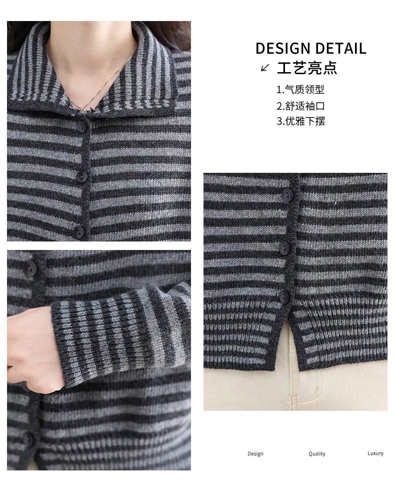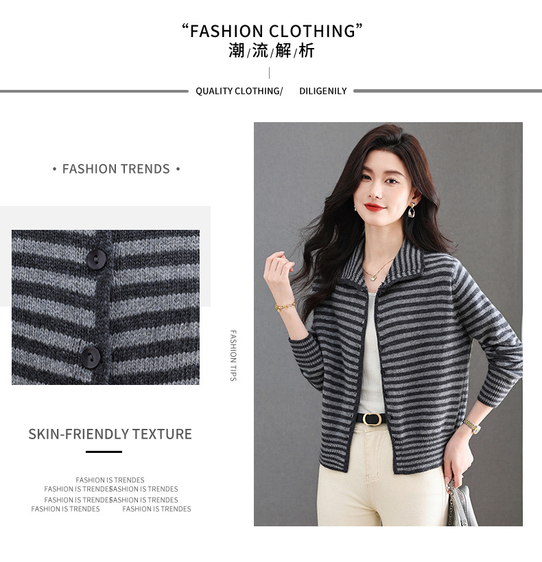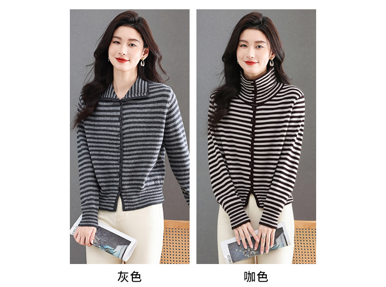 CC秋冬新款女士针织羊毛开衫翻领条纹港风外穿长袖保暖时尚女装