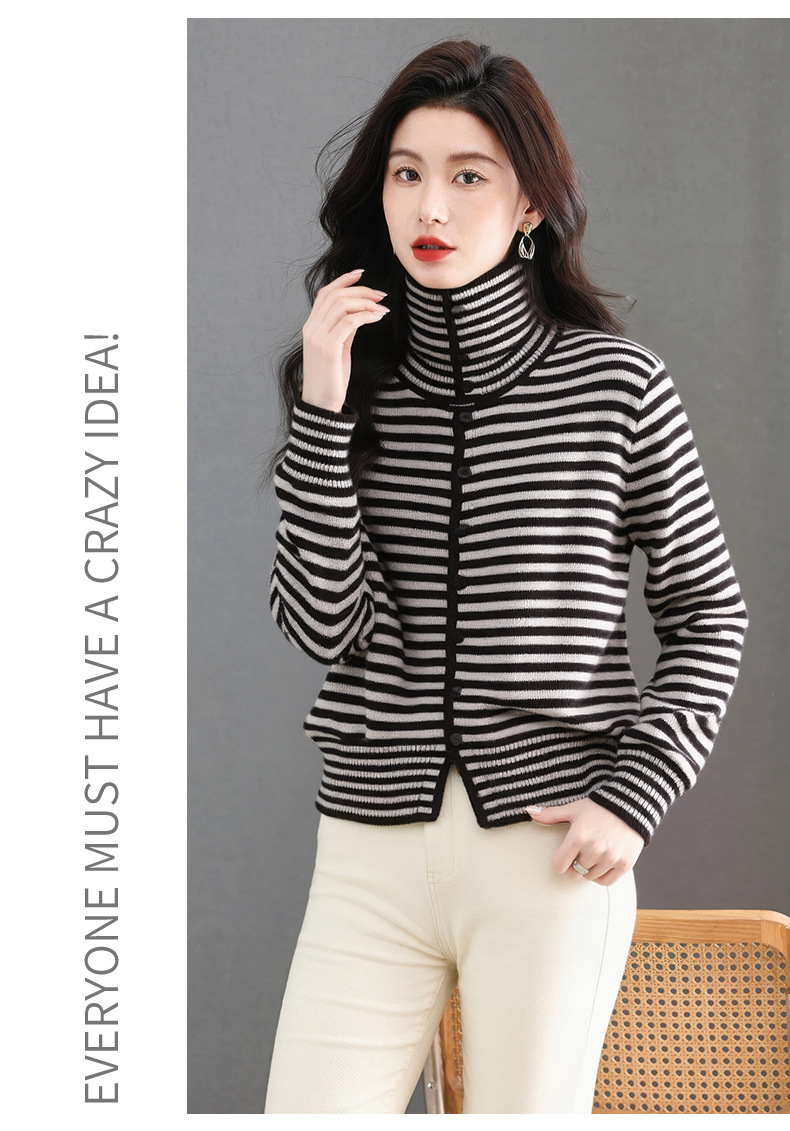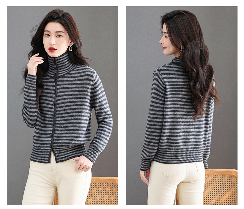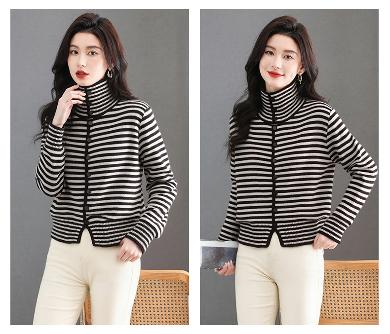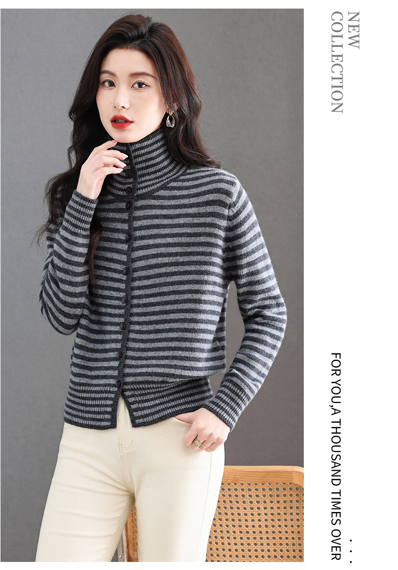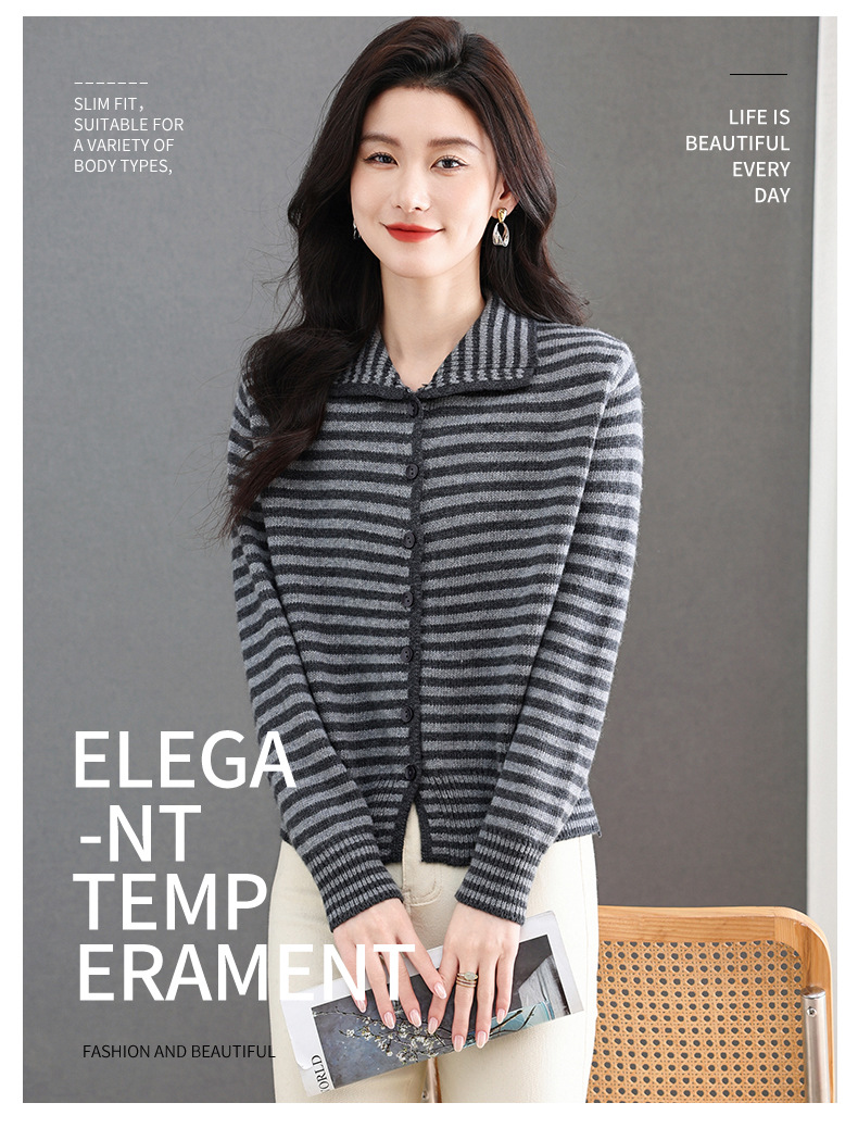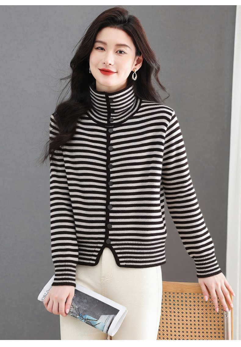 CC秋冬新款女士针织羊毛开衫翻领条纹港风外穿长袖保暖时尚女装