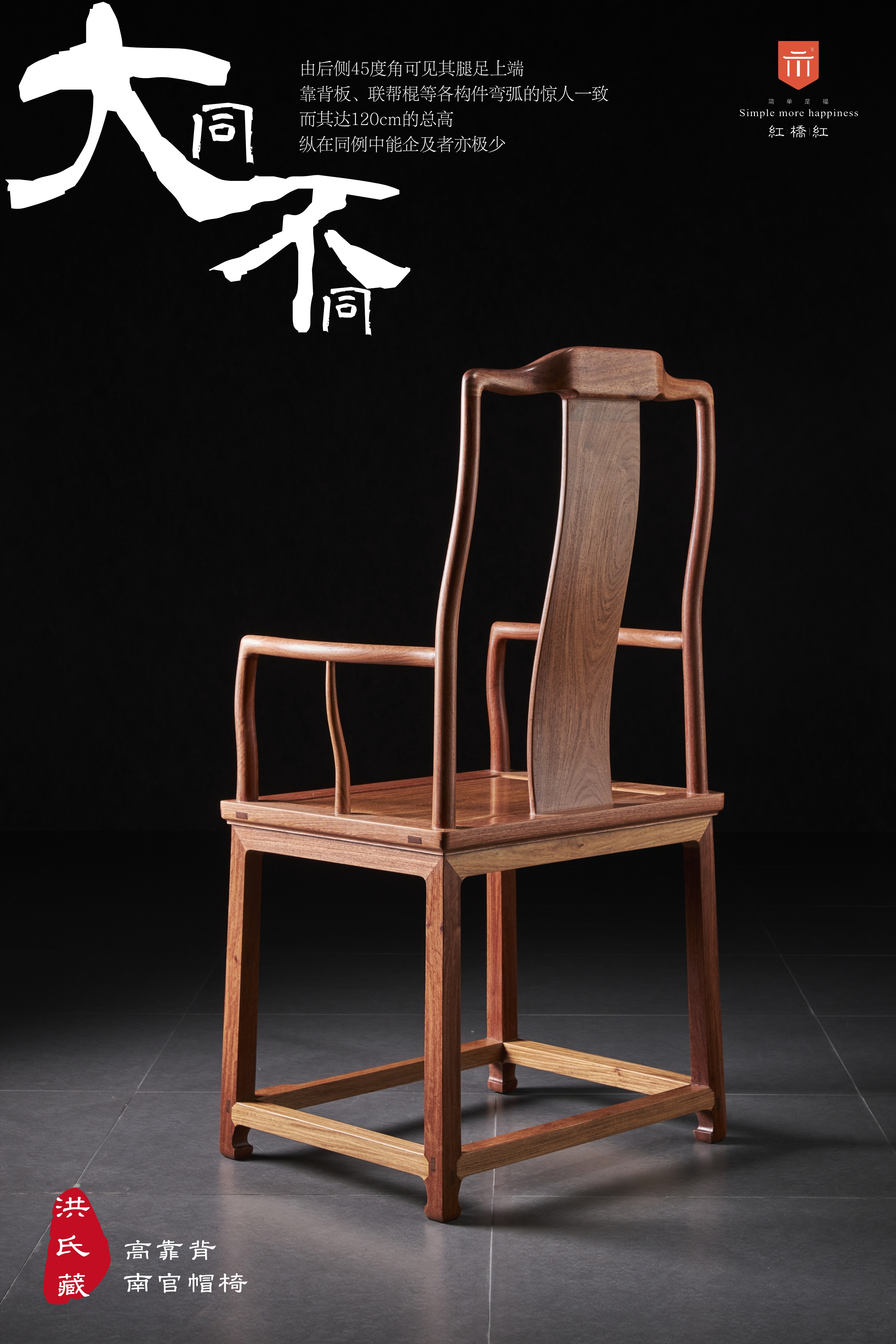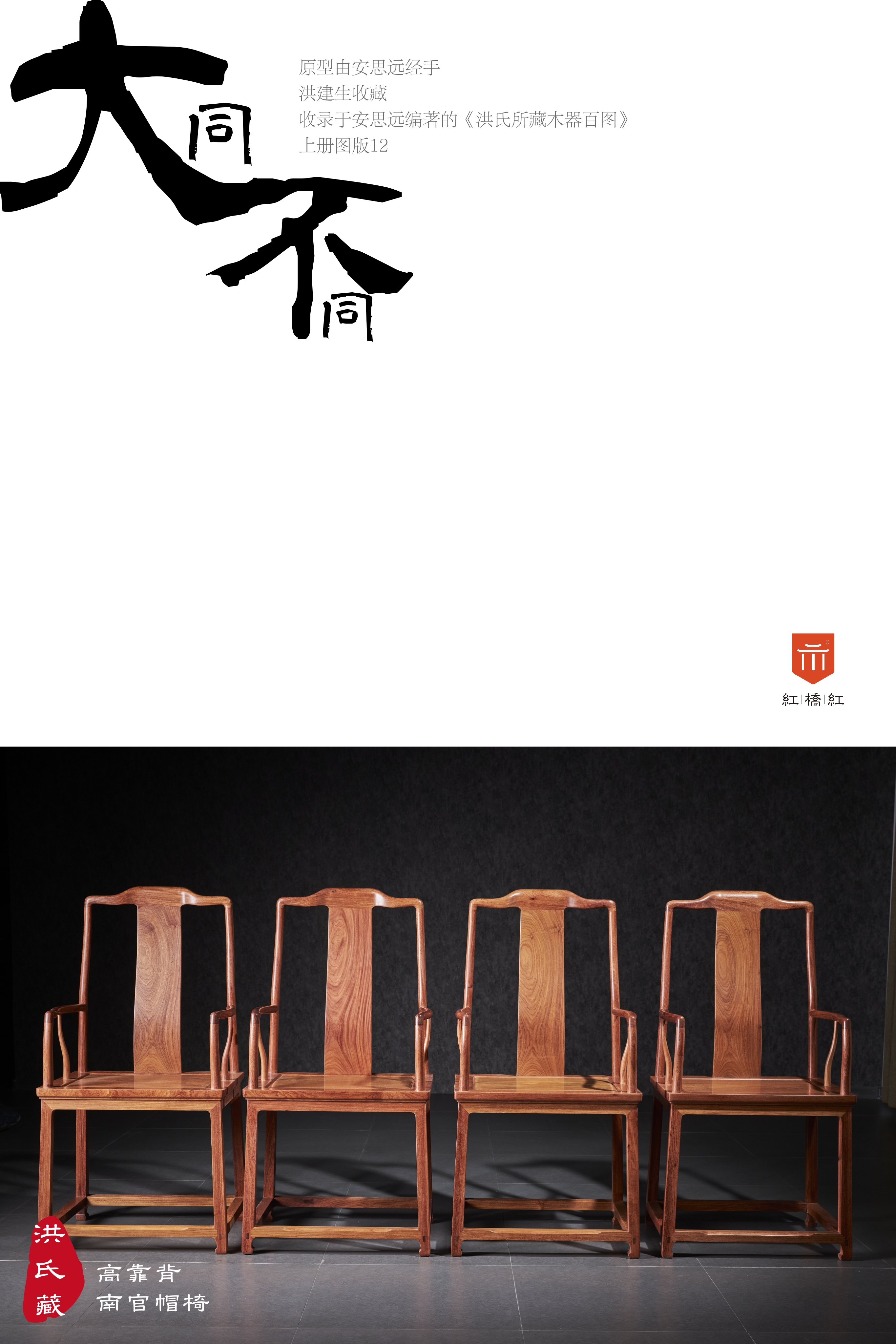 此椅原型出自香港洪建生旧藏的黄花梨高靠背南官帽椅,系安思远为洪氏把关的器物,收录于安氏编写的《洪氏所藏木器百图》上册。近例可参考香港攻玉山房叶承耀及前加州中国古典家具博物馆的旧藏。
