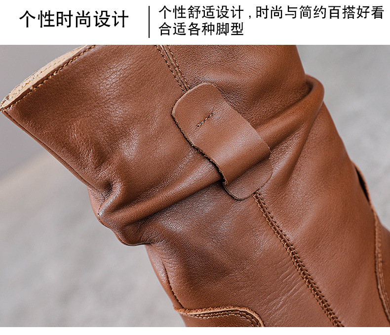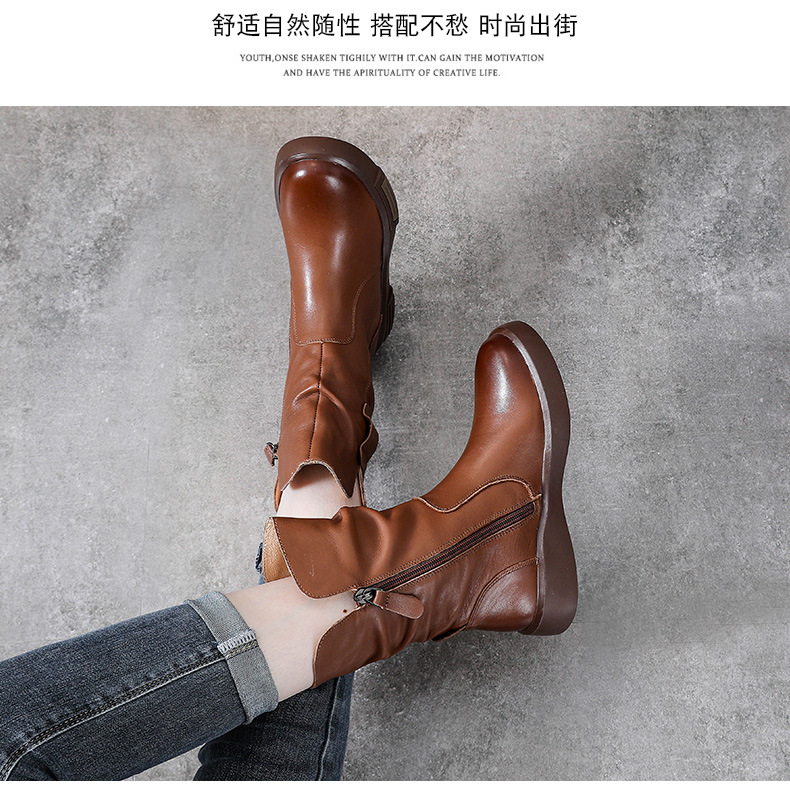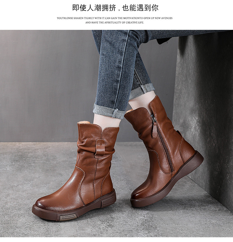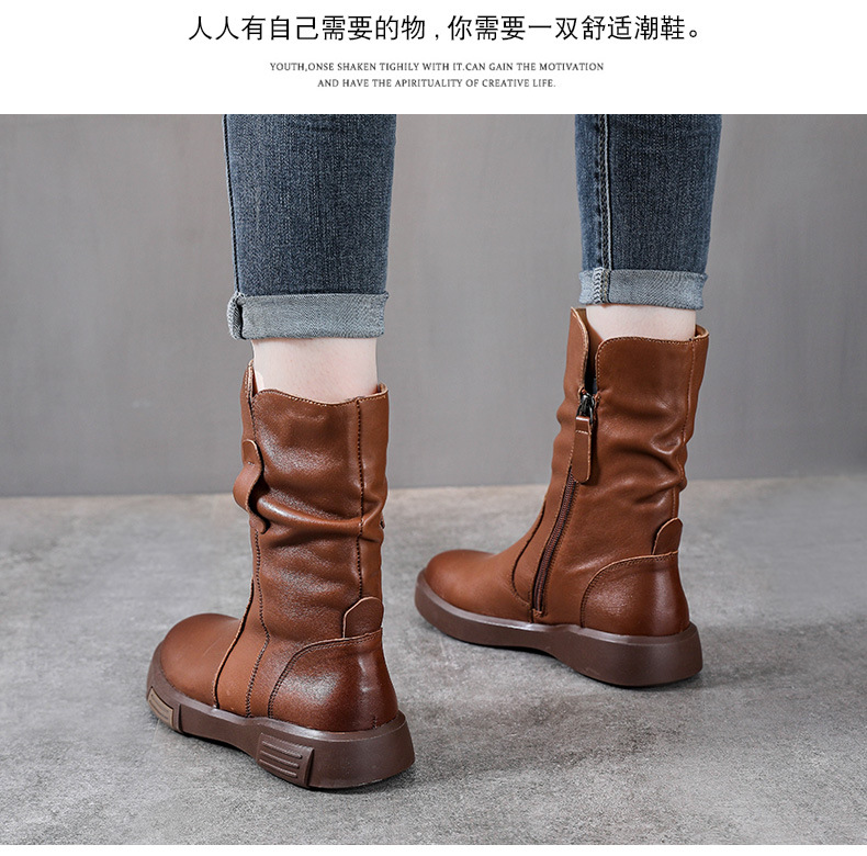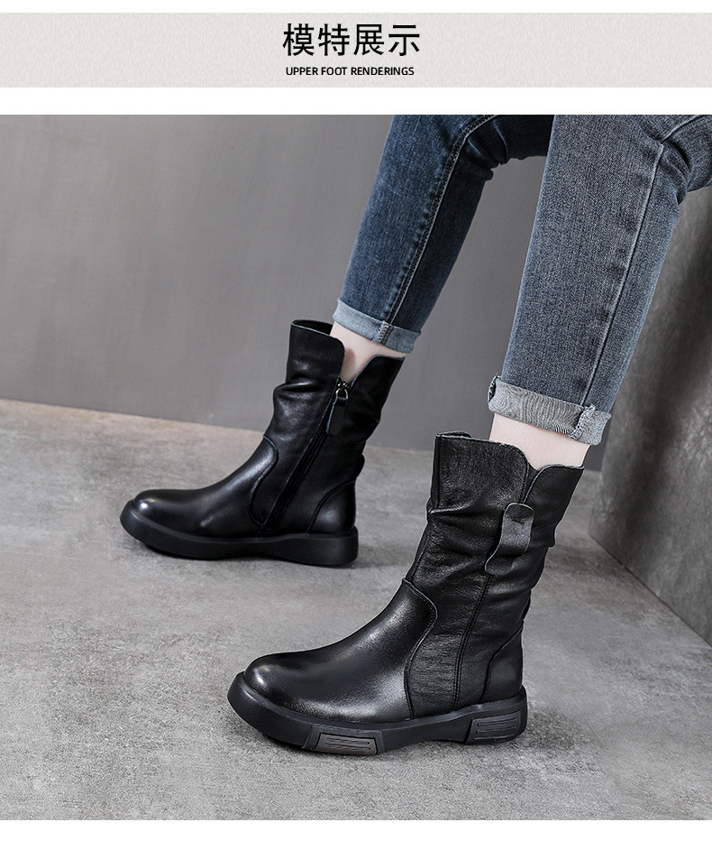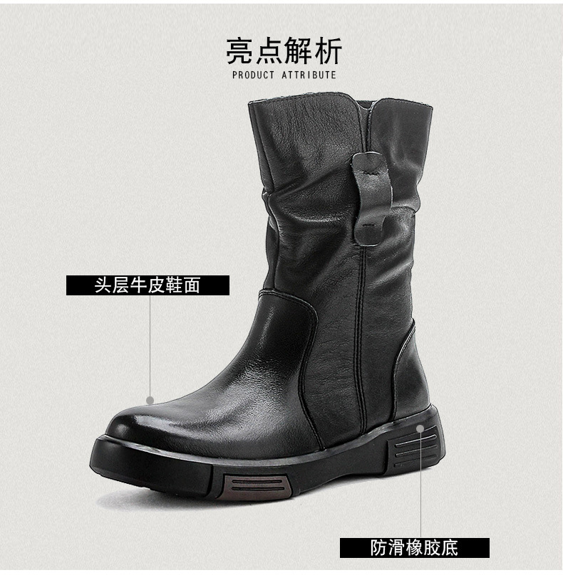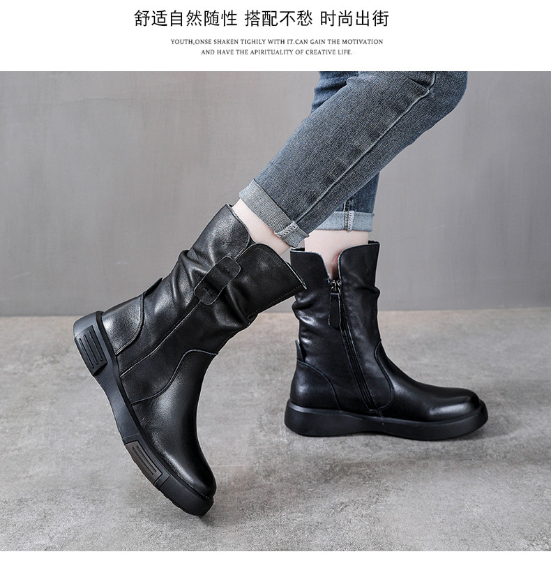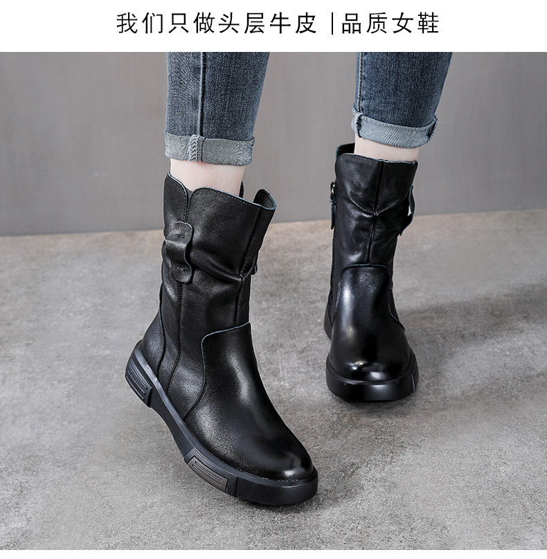 YR1988头层牛皮中筒马丁靴女秋冬新款棉靴平底中筒靴复古圆头骑士单靴子