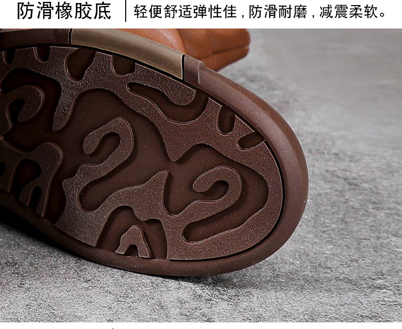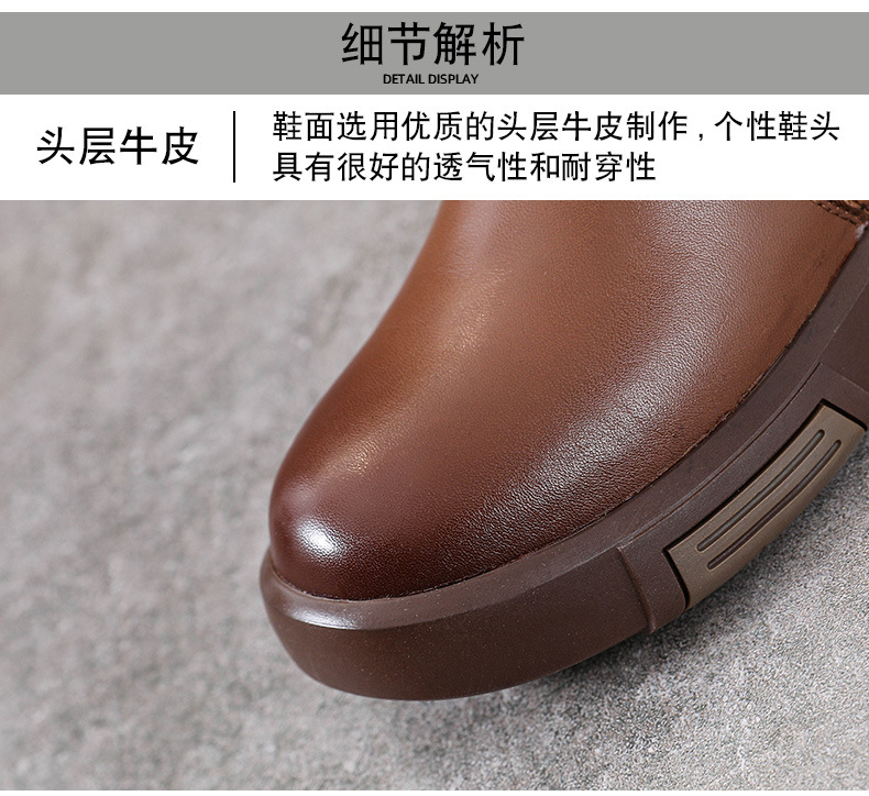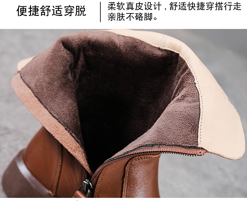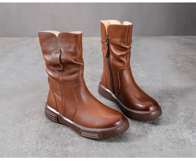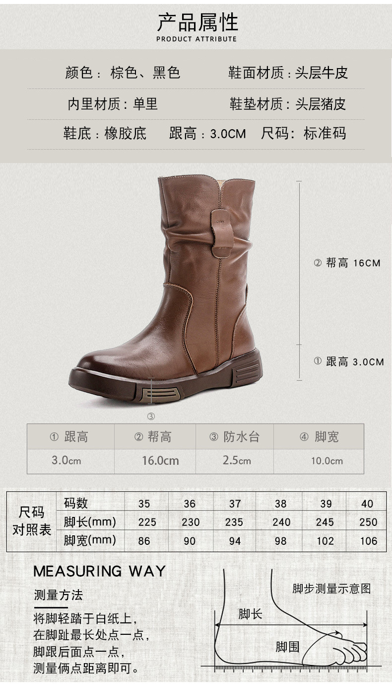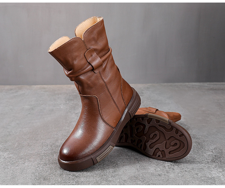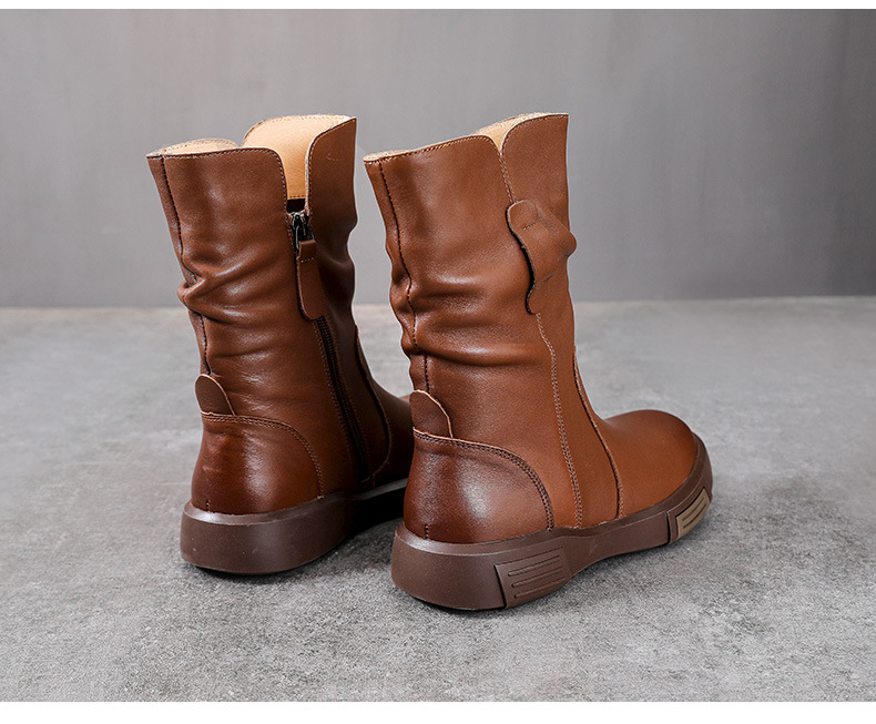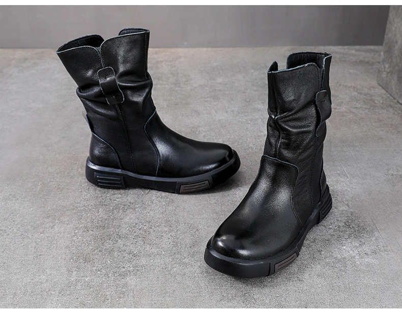 YR1988头层牛皮中筒马丁靴女秋冬新款棉靴平底中筒靴复古圆头骑士单靴子