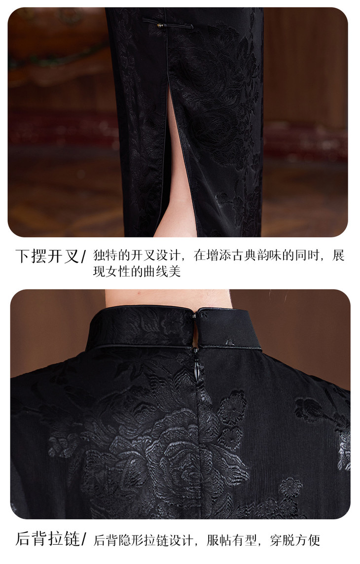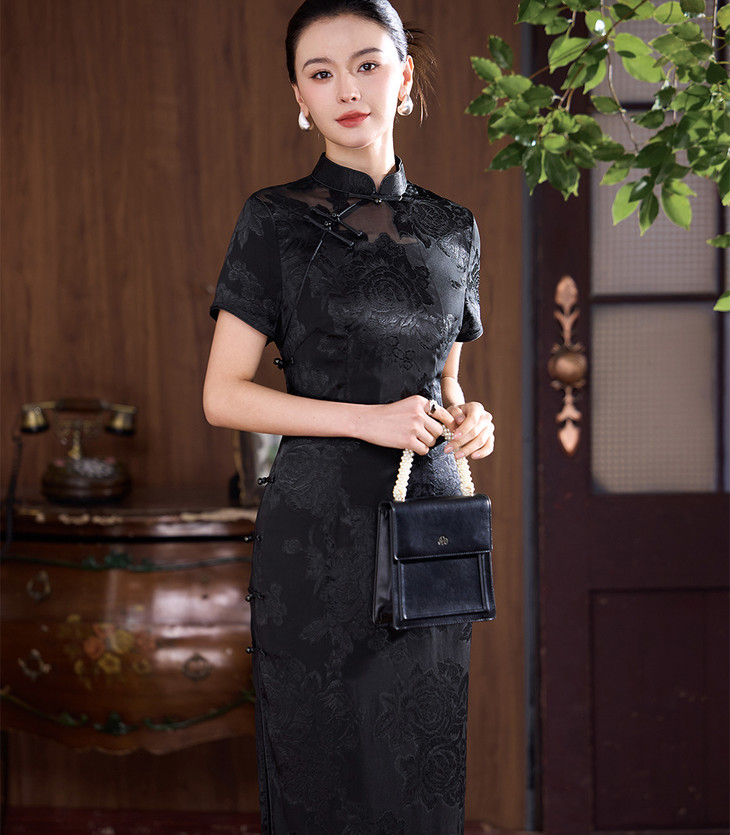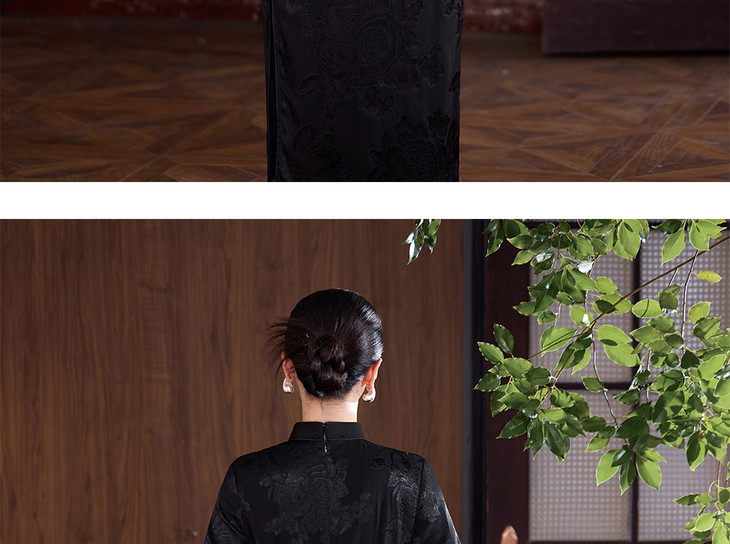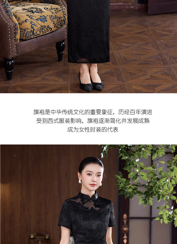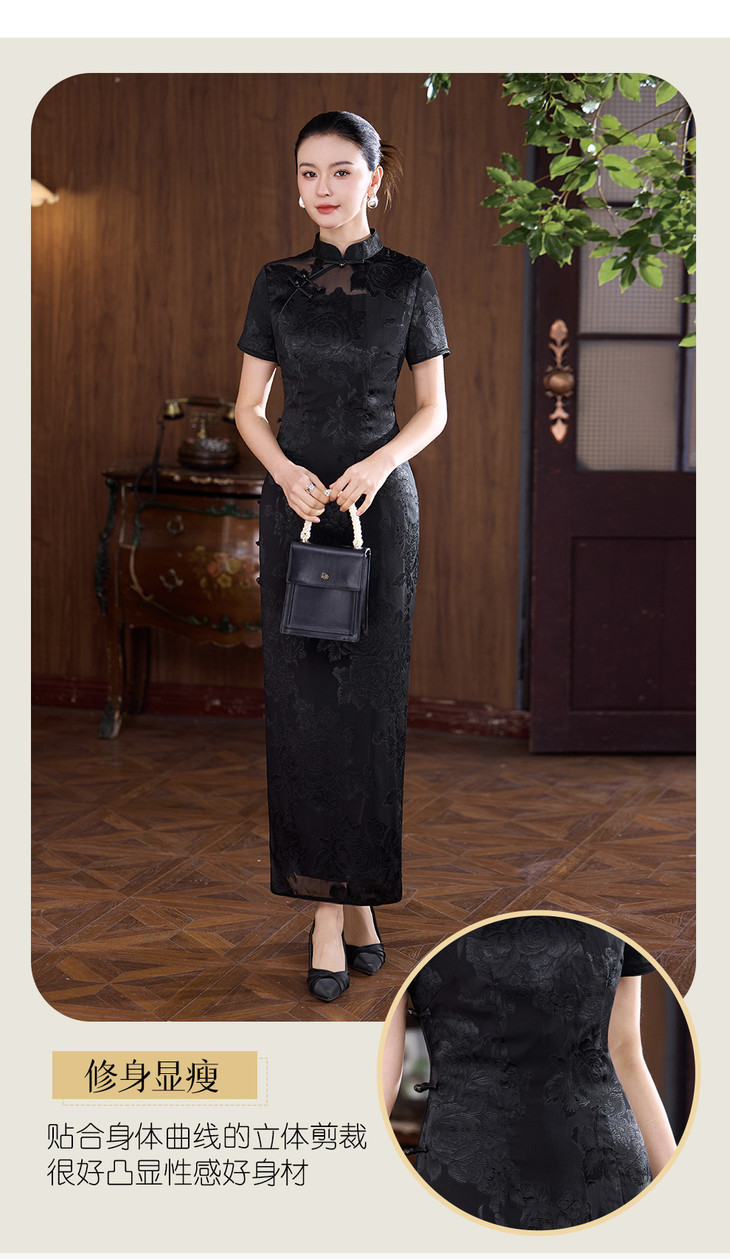 真丝旗袍剪花绡蚕丝黑色提花改良JD25068