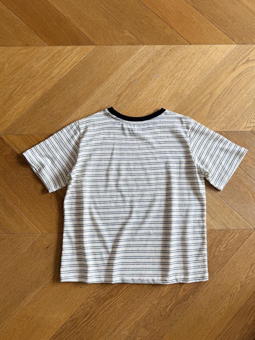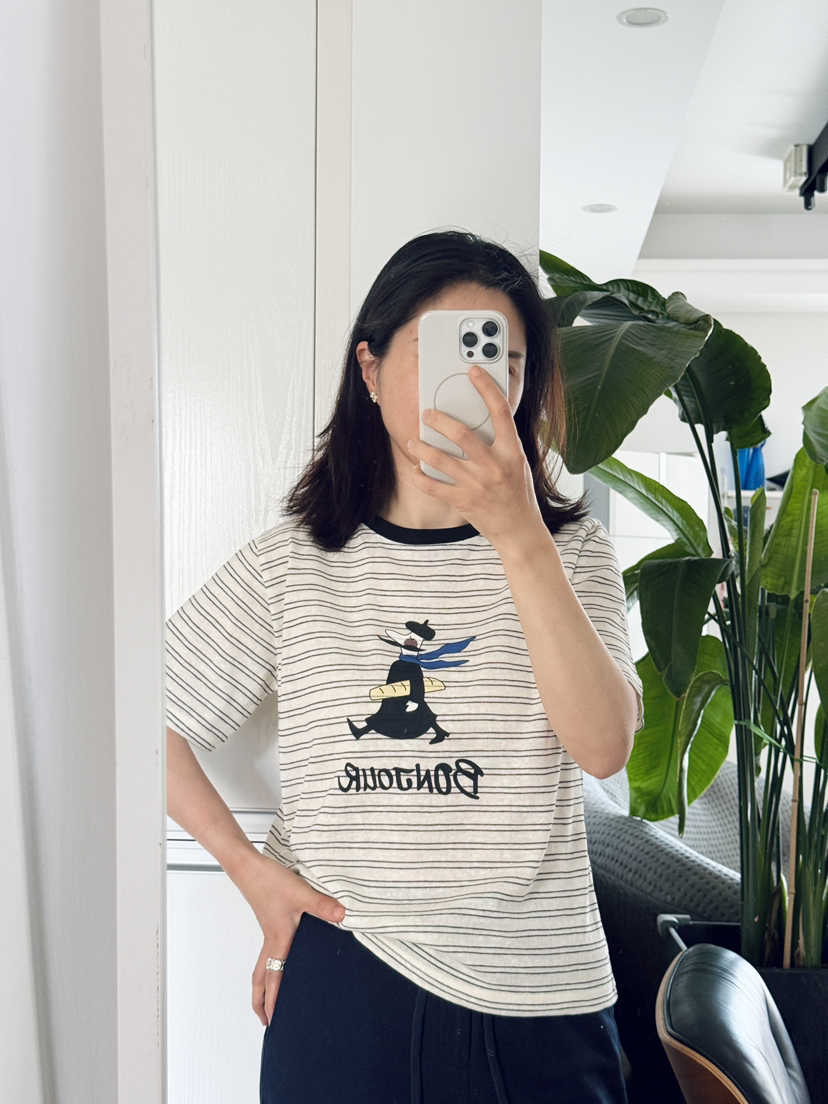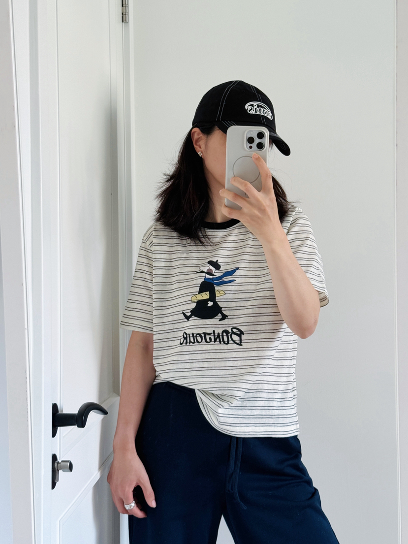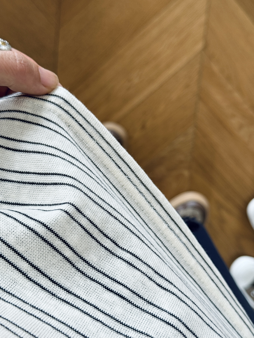 春夏标配好物,超清爽的条纹短袖T恤,不刻意的时髦,太爱! 宽松不拖沓的版型,包容性超强,颜色简单却又带点复古的条纹线条,清新的色织条纹配色超美,一眼圈粉,没有多余的点缀冗杂的设计