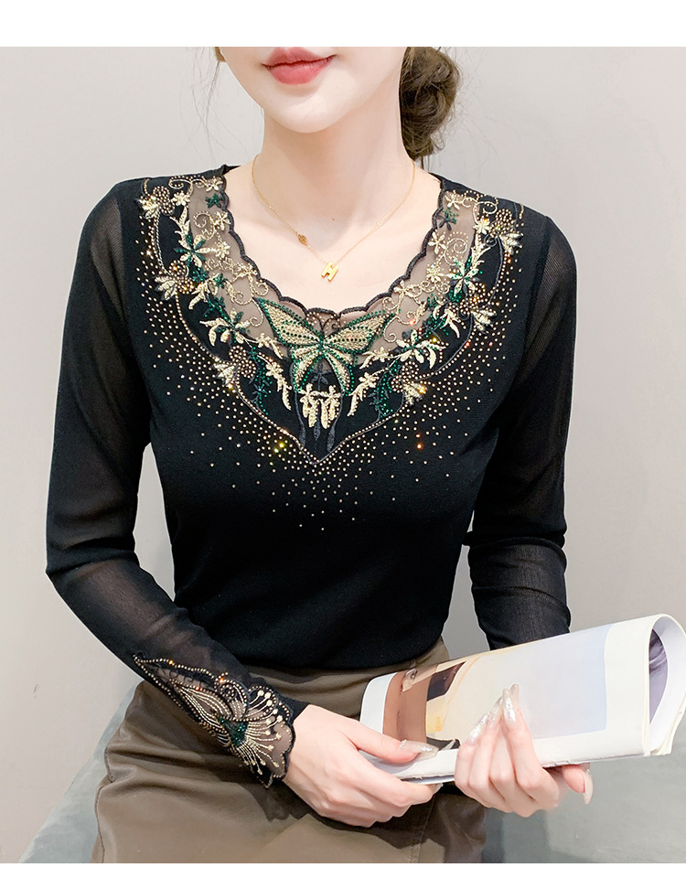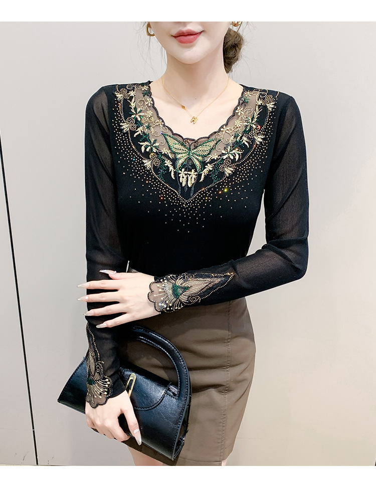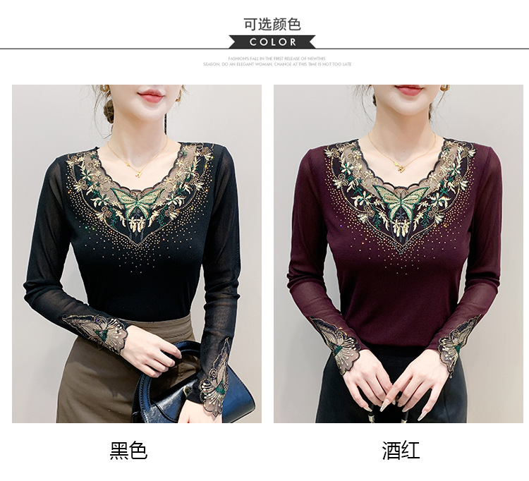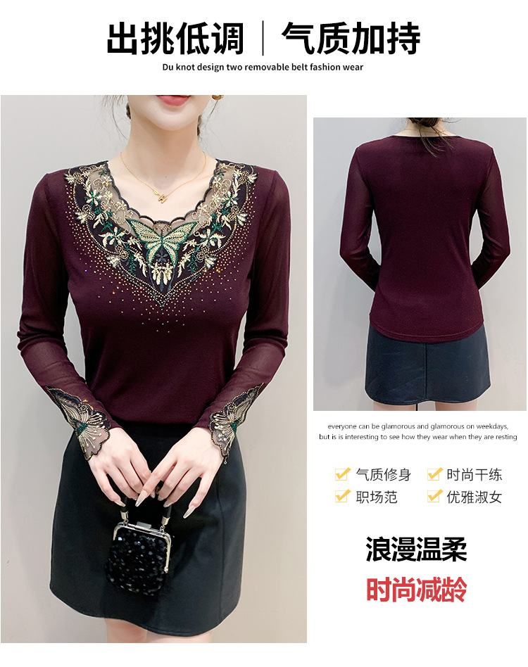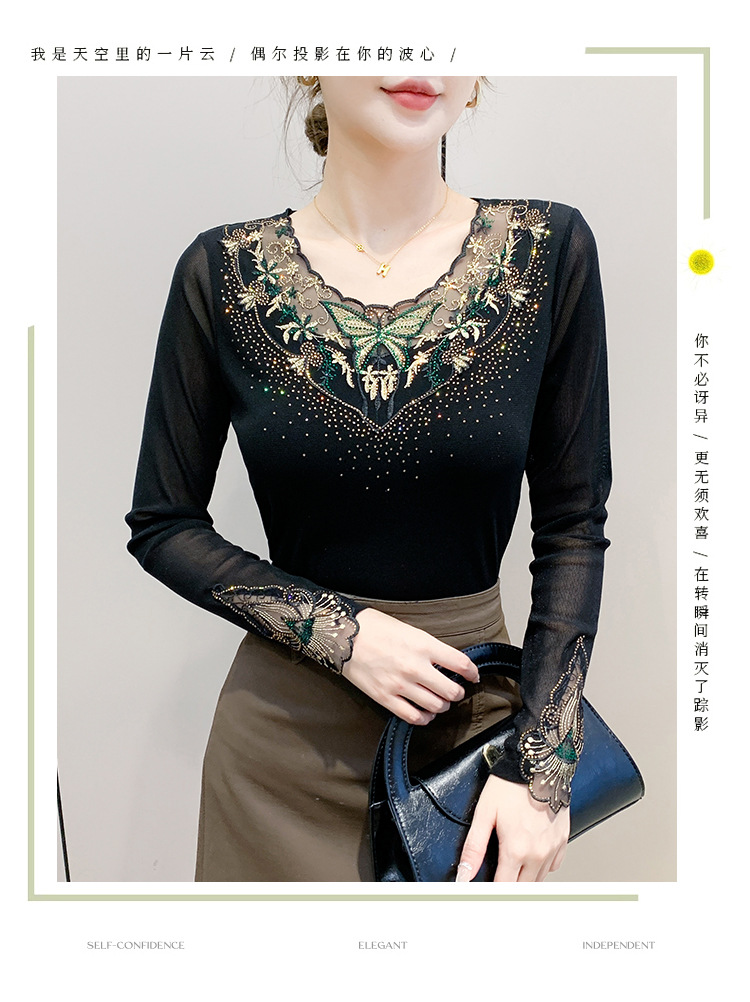 KQL 462H7275优雅花边拼接烫钻洋气网纱收腰气质t恤