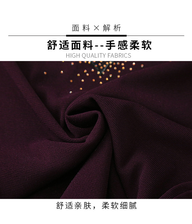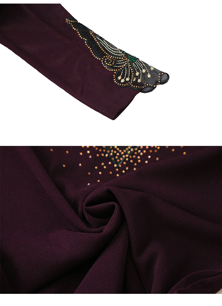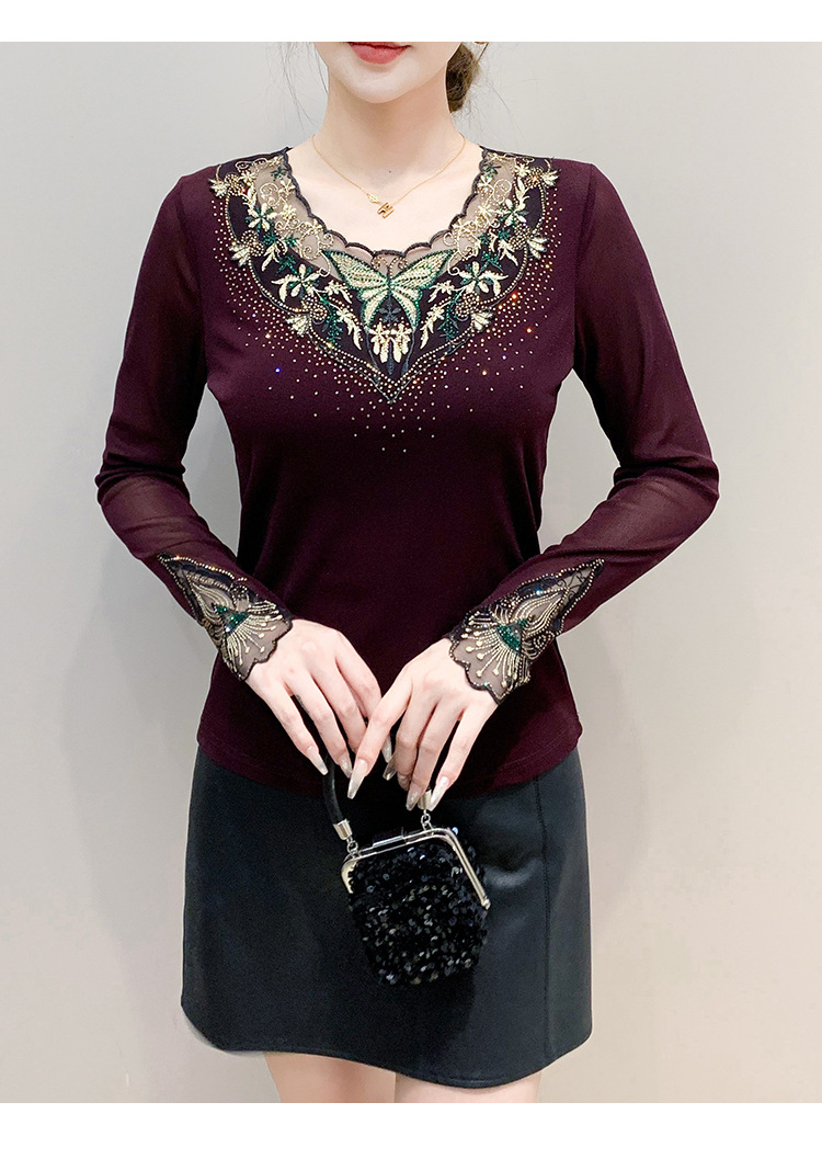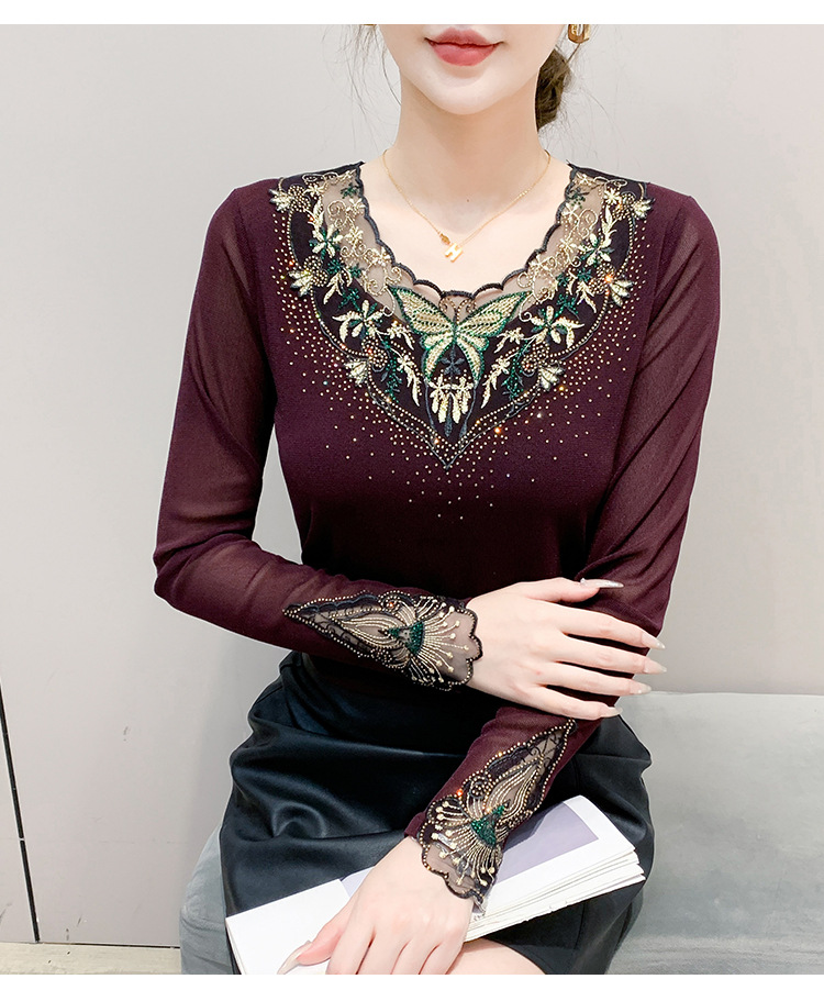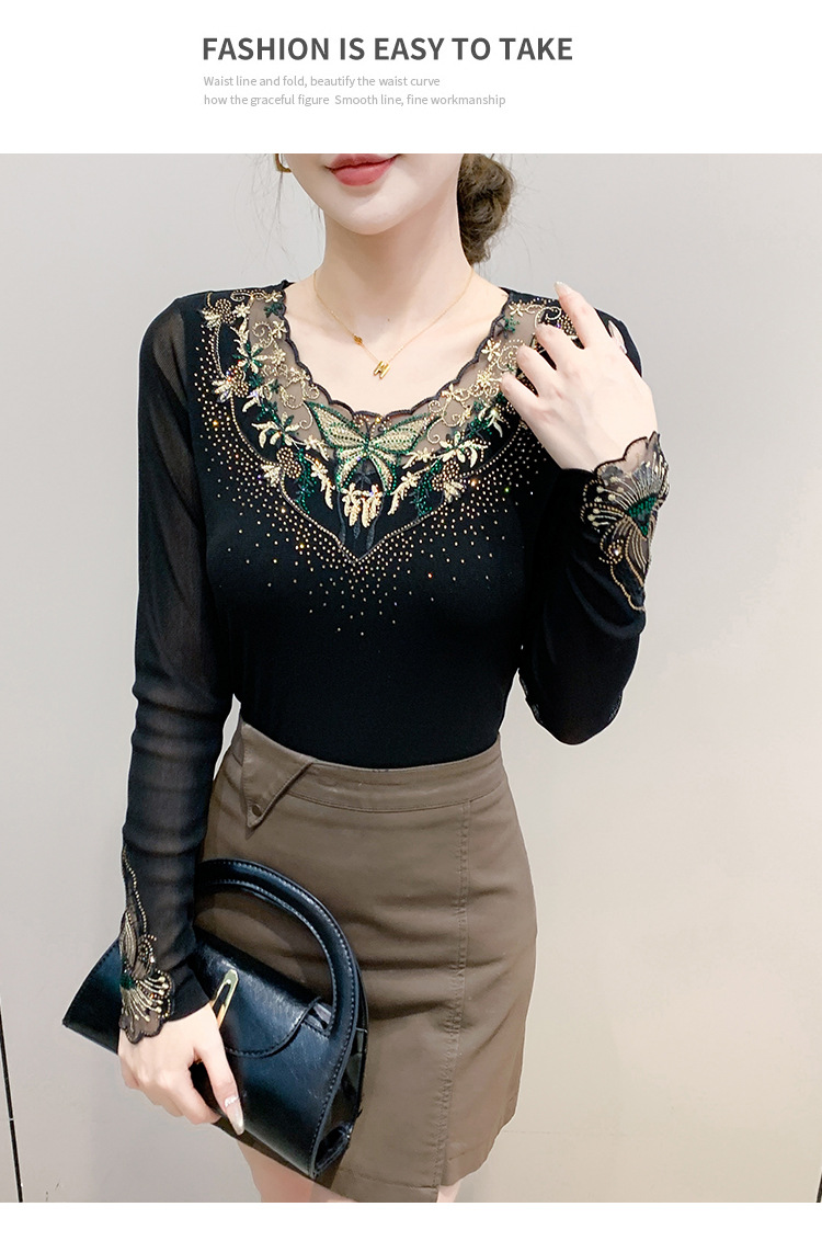 KQL 462H7275优雅花边拼接烫钻洋气网纱收腰气质t恤