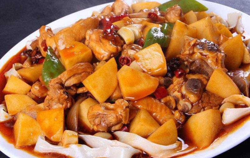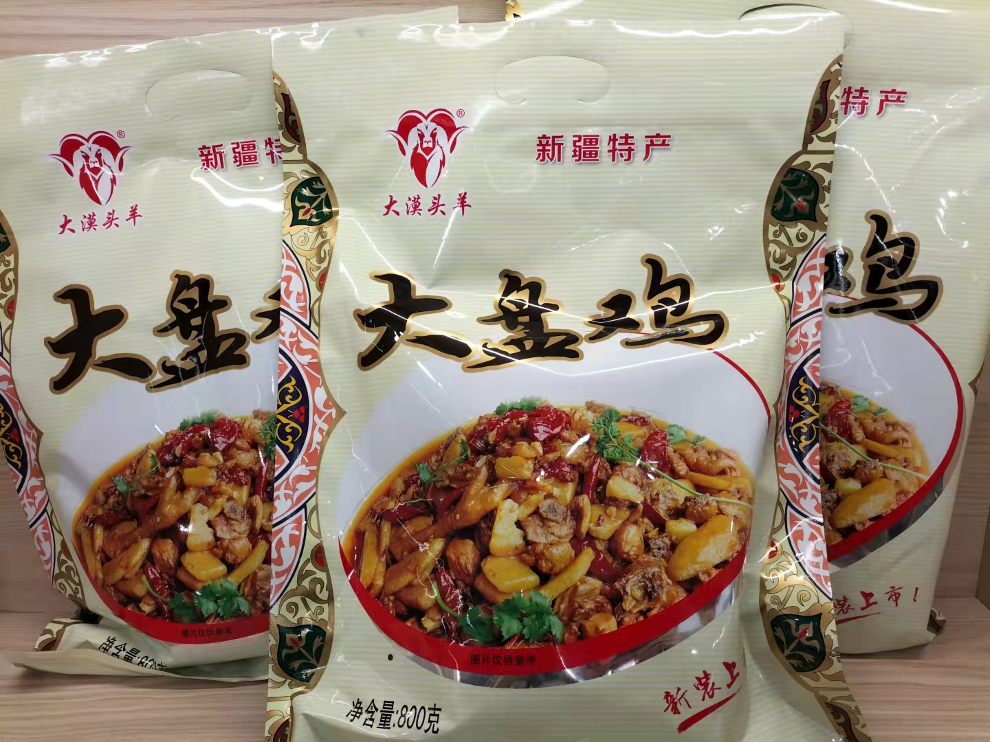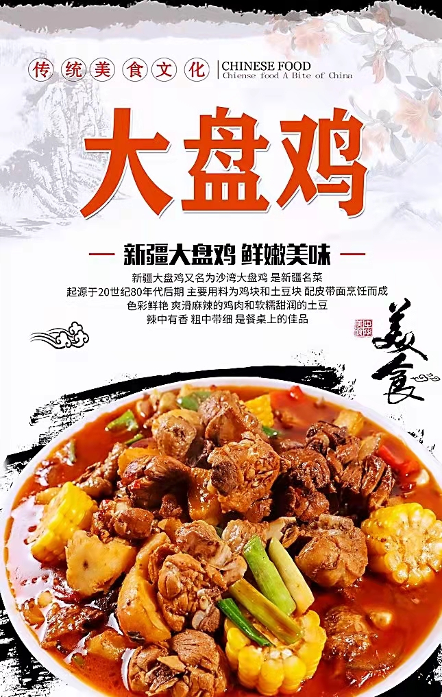 【商品特点】大盘鸡是多种蔬菜与鸡肉搭配烹制而成。鸡要选生长一年的农家土鸡,配上独具地方特色的土豆和安集海镇的大葱、红辣椒,以及花椒粒、胡椒、生姜片、青椒、蒜等配制而成的秘制调料