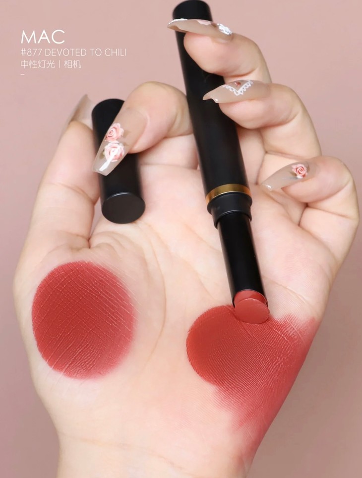 👑MAC 魔杖口红#877 Devoted to chili 👍 MAC新色首发🔥!显白山楂甜椒洋红色🌶️。这个色号谁不喜欢❓ ✨暖光灯下薄涂是红棕小甜辣酱🌸,冷光下厚涂有点玫瑰感💥, 🙌低饱和度,又不挑皮🙌。 ✨柔雾哑光质地,薄润不拔干☁️。 🟠MAC真的磕住了各种chili色号,绝了‼️